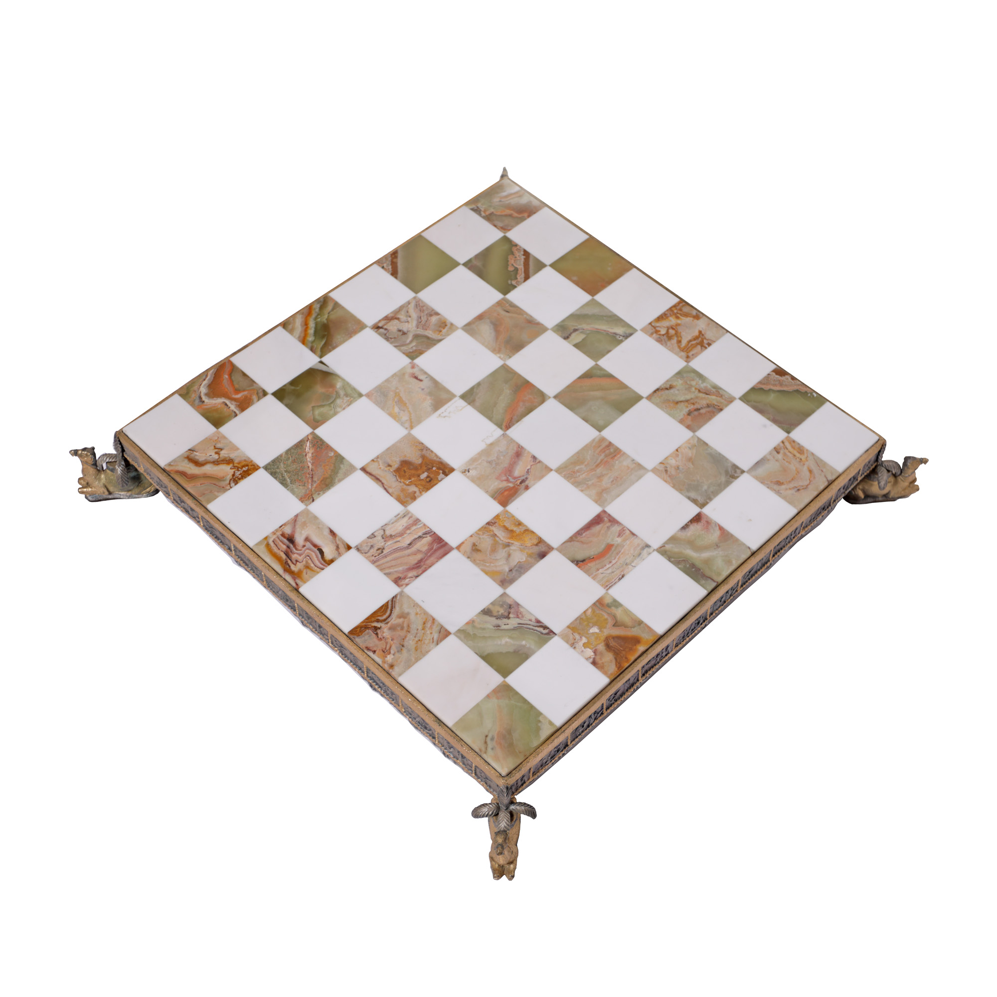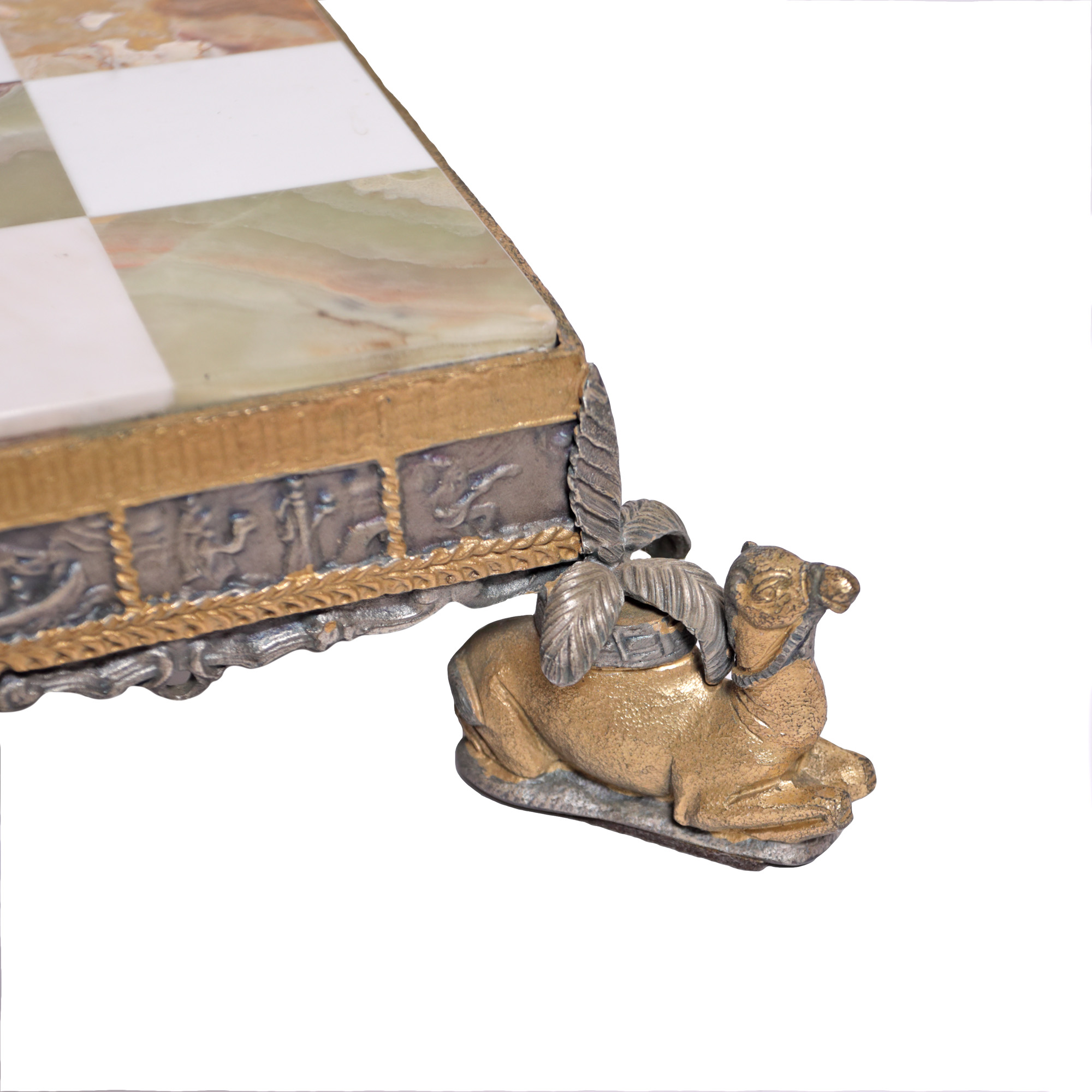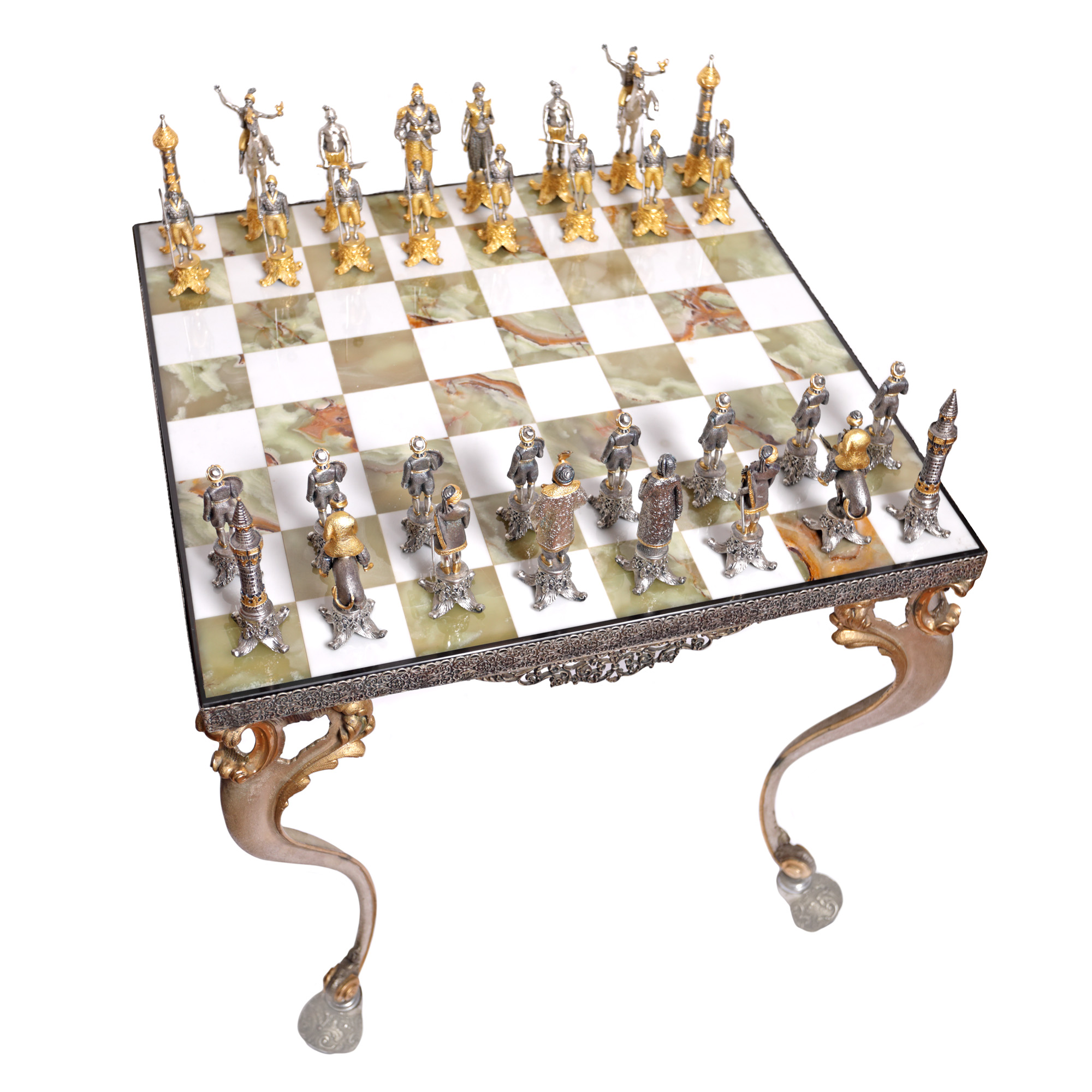 51. Superbă masă de șah din onix, set de piese figurative din bronz, ilustrând personaje din "1001 de Nopți", mijlocul sec. XX
