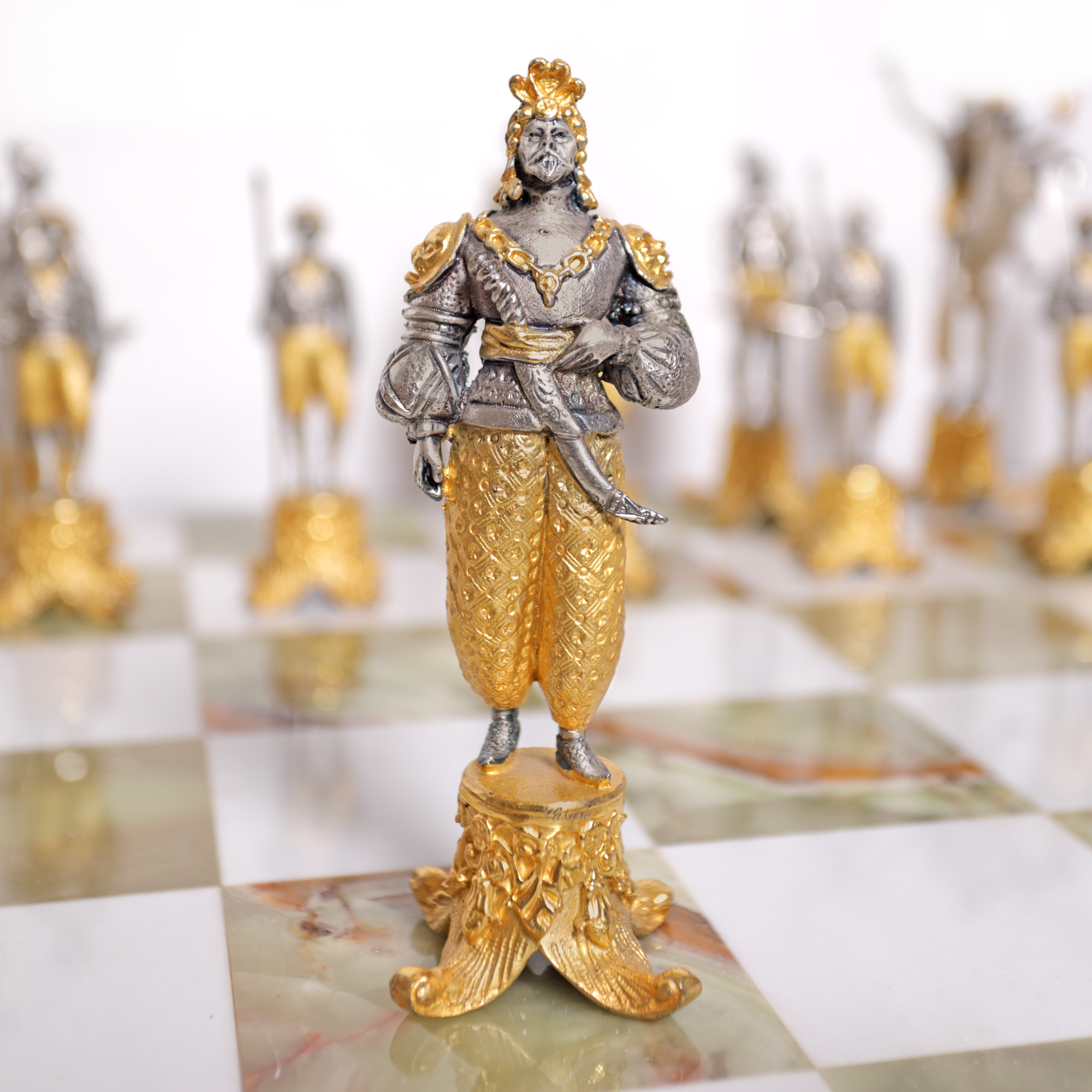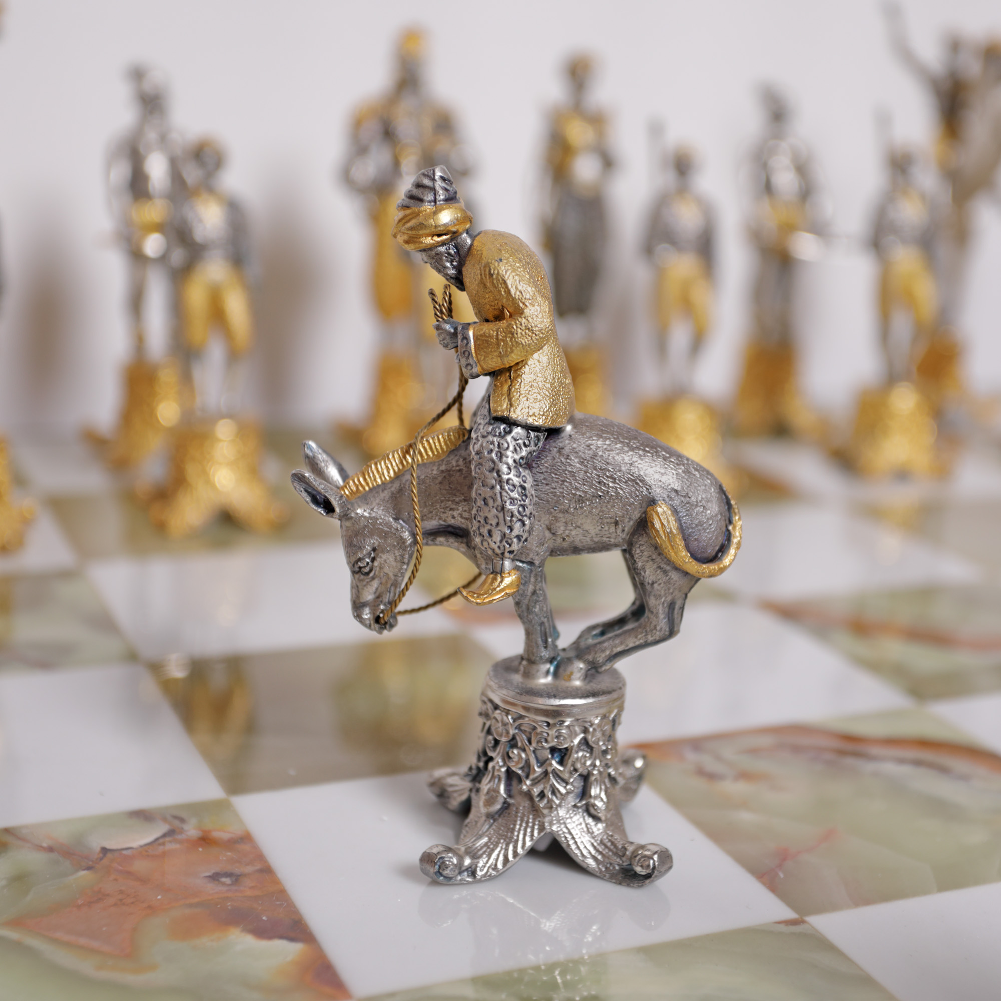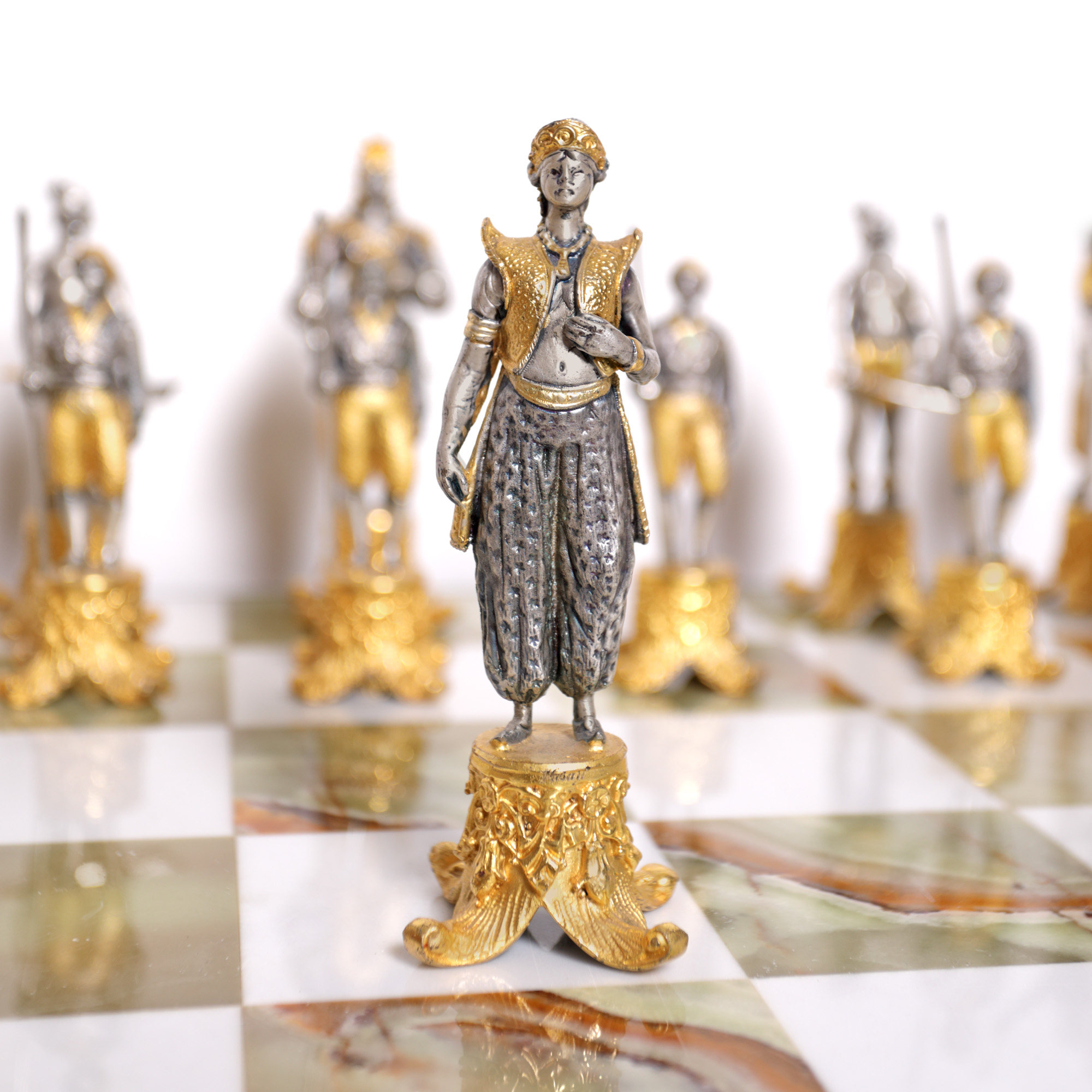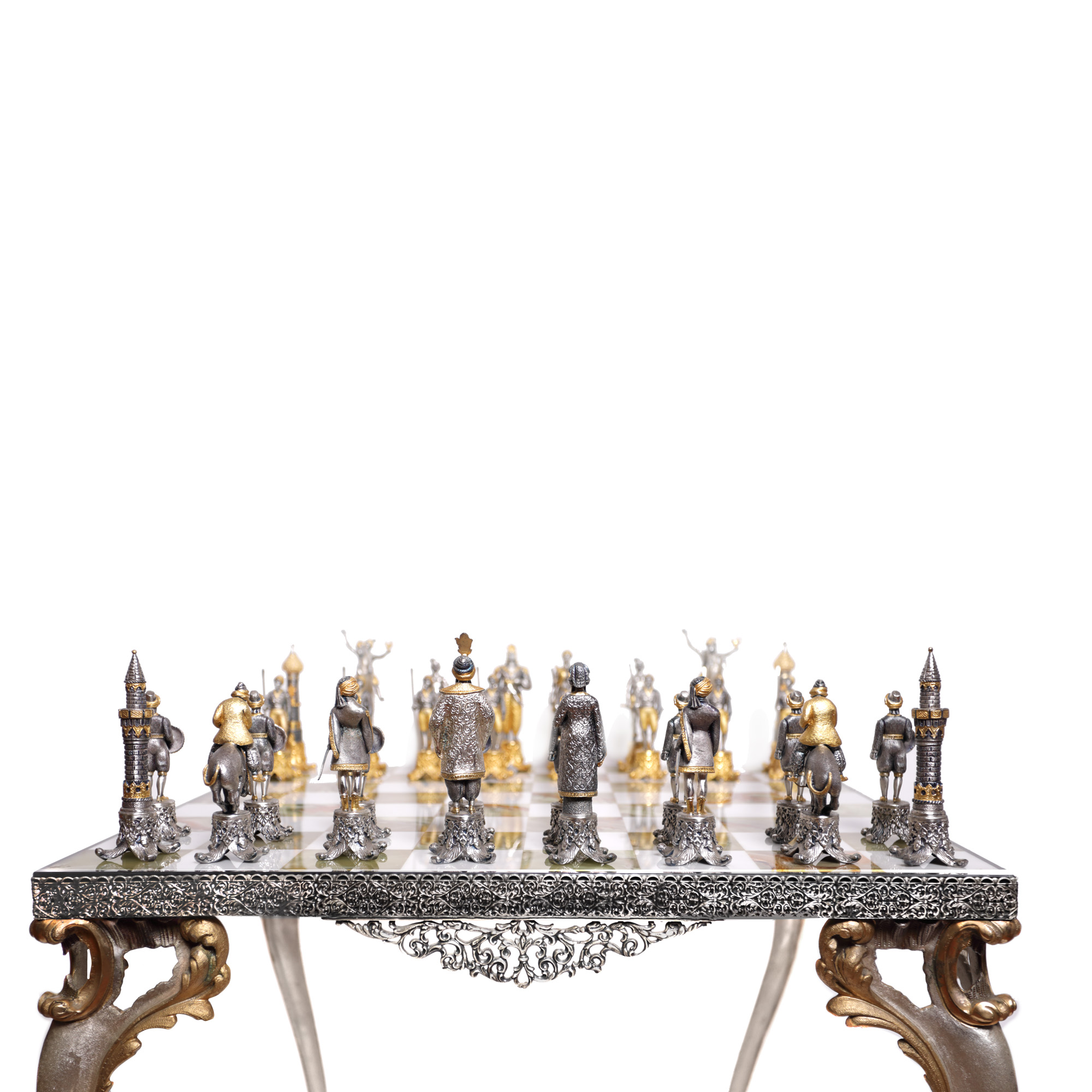 51. Superbă masă de șah din onix, set de piese figurative din bronz, ilustrând personaje din "1001 de Nopți", mijlocul sec. XX