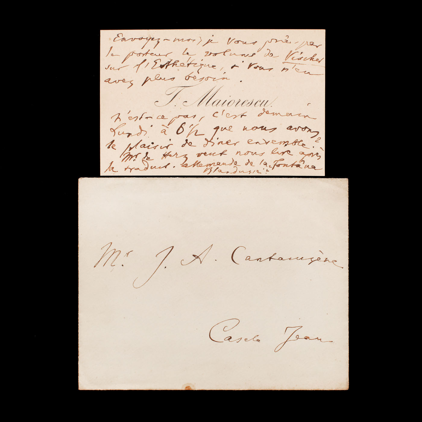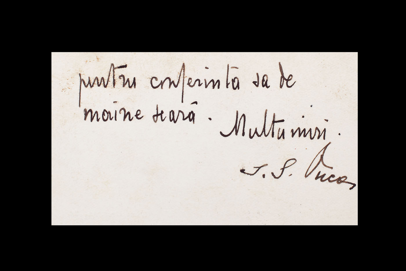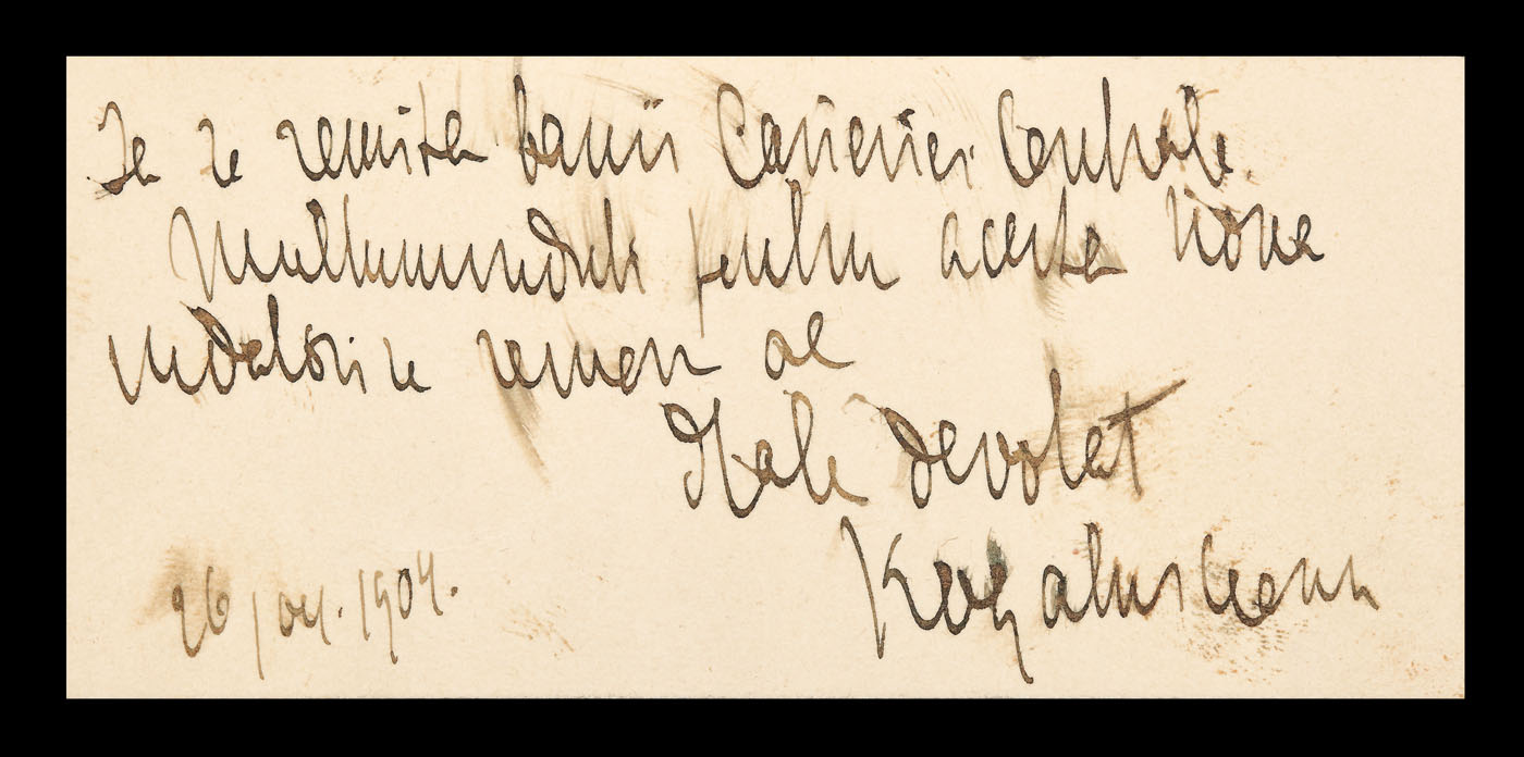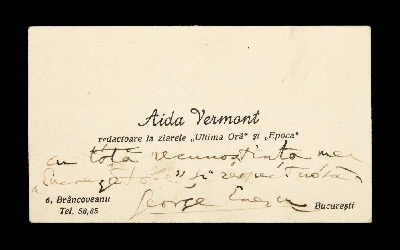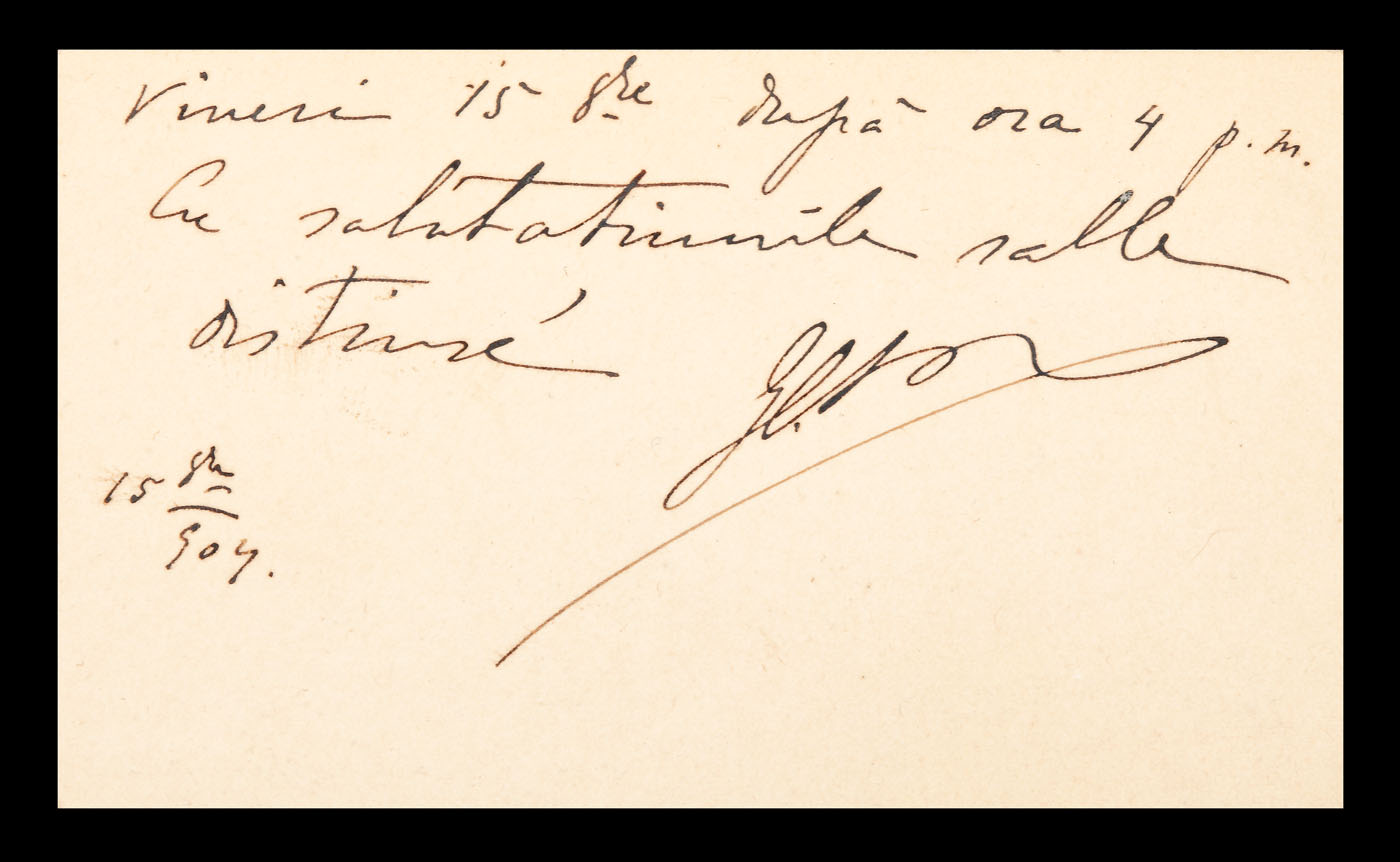 9. Însemnare a lui George Enescu, semnată olograf, pe cartea de vizită a jurnalistei Aida Vermont