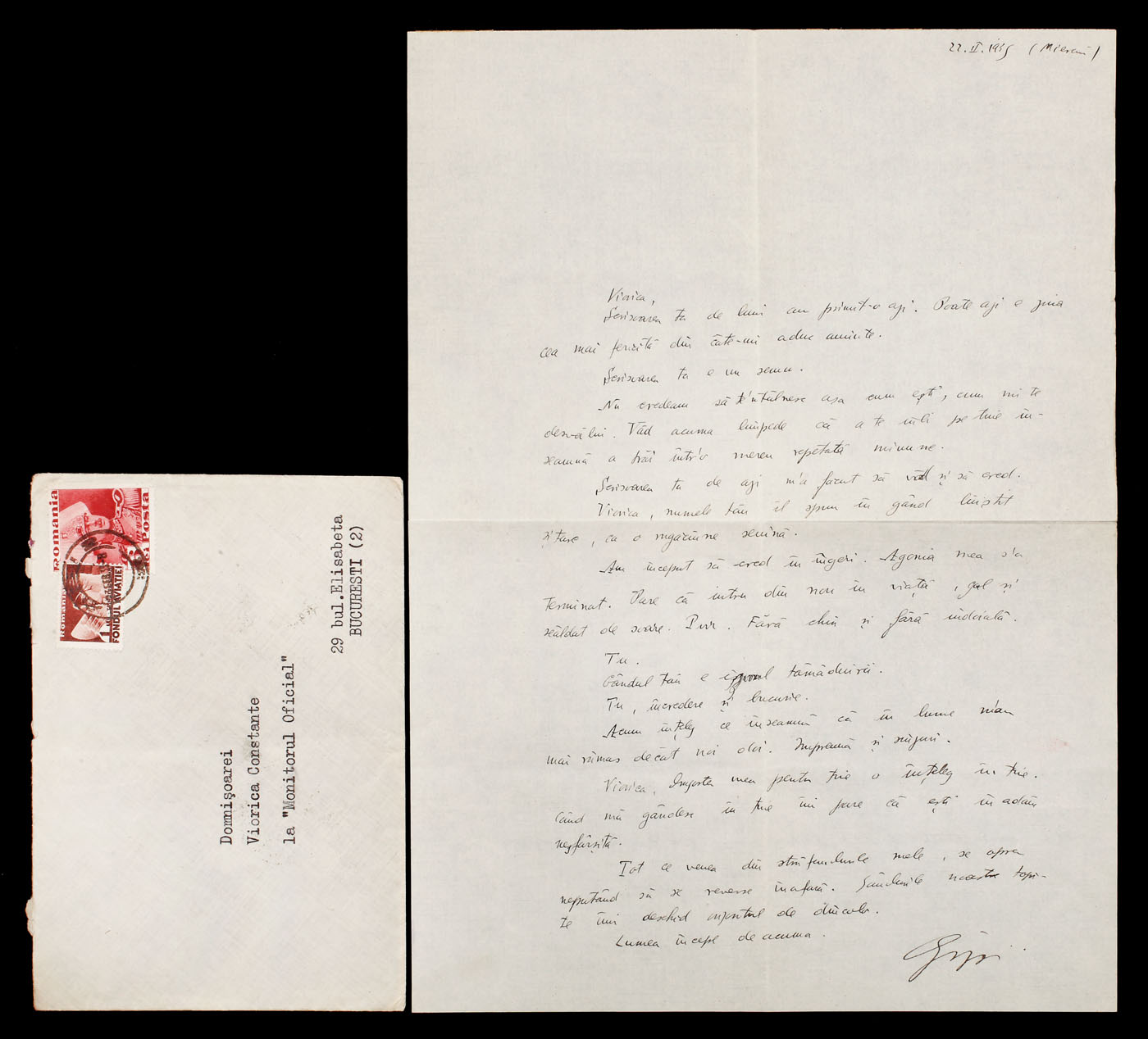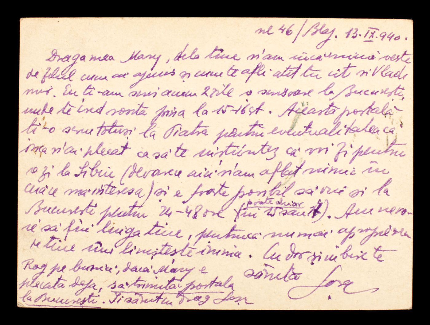 23. Carte poștală trimisă de poetul avangardist Sașa Pană soţiei sale Maria, septembrie 1940