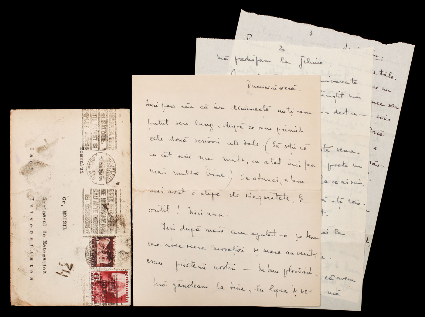 21. Lot format din două scrisori de dragoste, de la matematicianul Grigore Moisil către Viorica Constante (sora Lenei Constante-Brauner) și de la Viorica Constante către matematician (patru file), celebri îndrăgostiți, în plicurile originale, ștampilate și francate, 1939