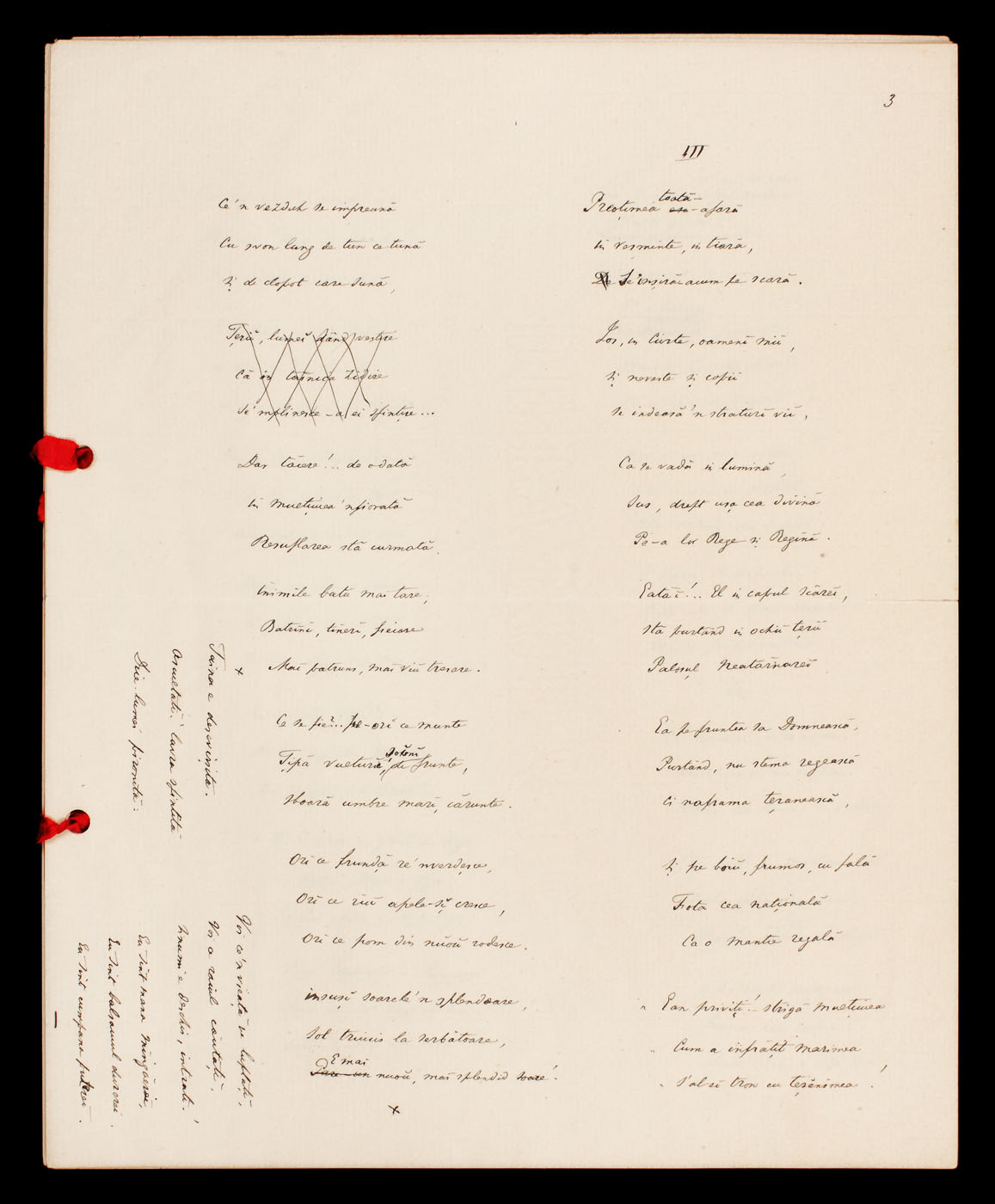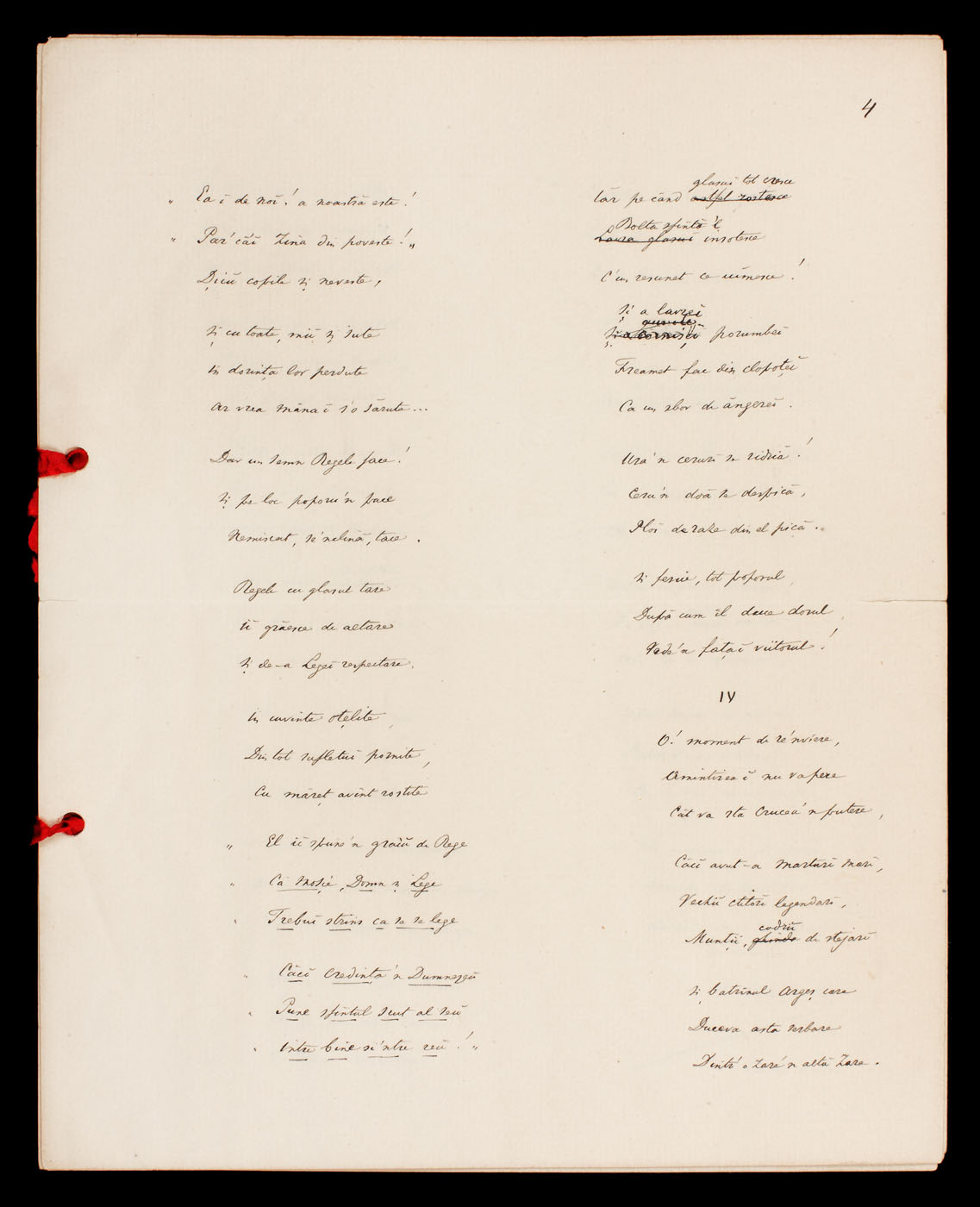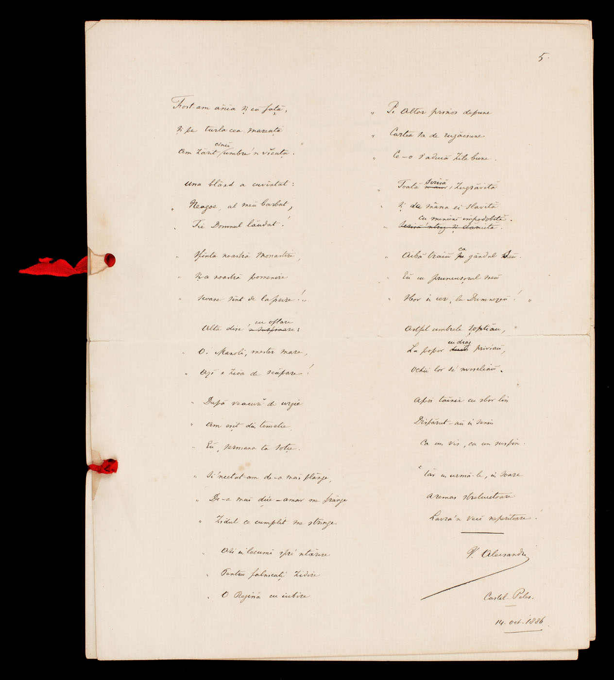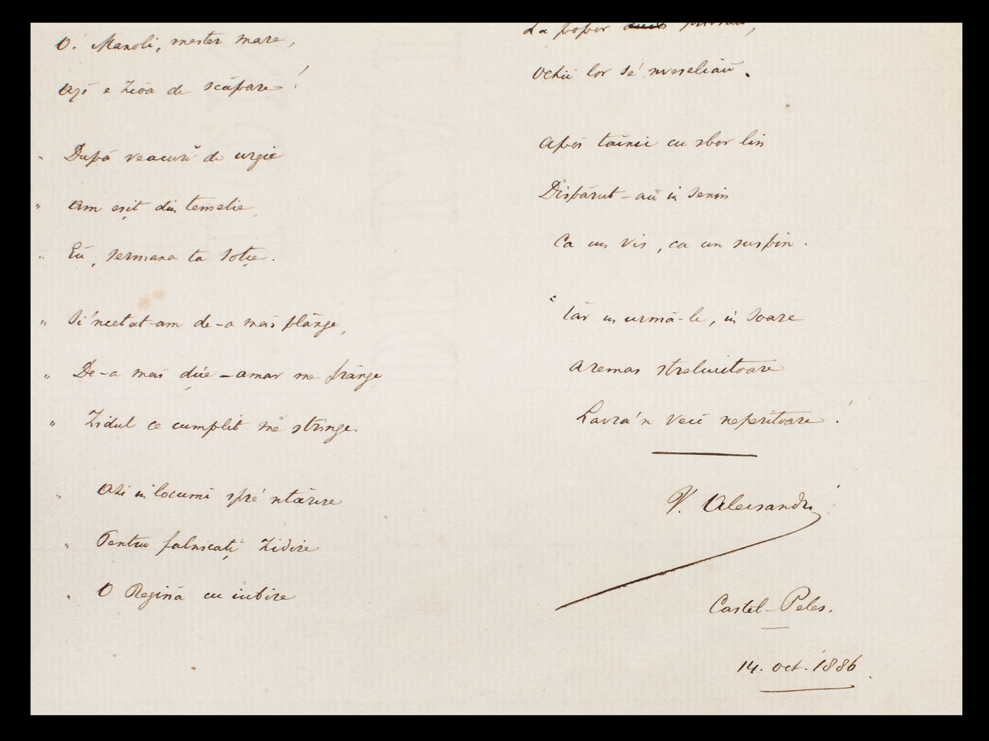 33. Manuscris Vasile Alecsandri, legenda "Sfințirea bisericii de la Curtea de Argeș", închinată Regelui Carol I şi Reginei Elisabeta, Castelul Peleș, 14 octombrie 1886 (5 file)