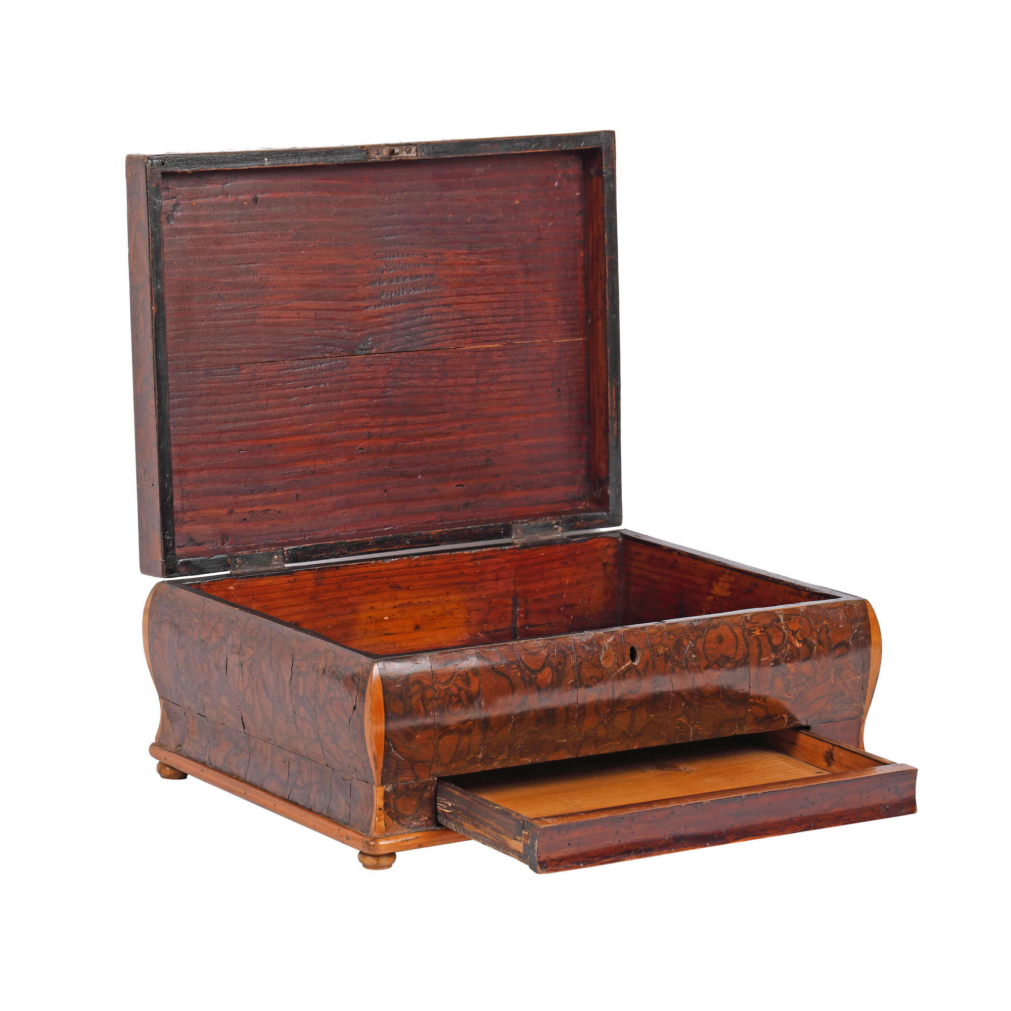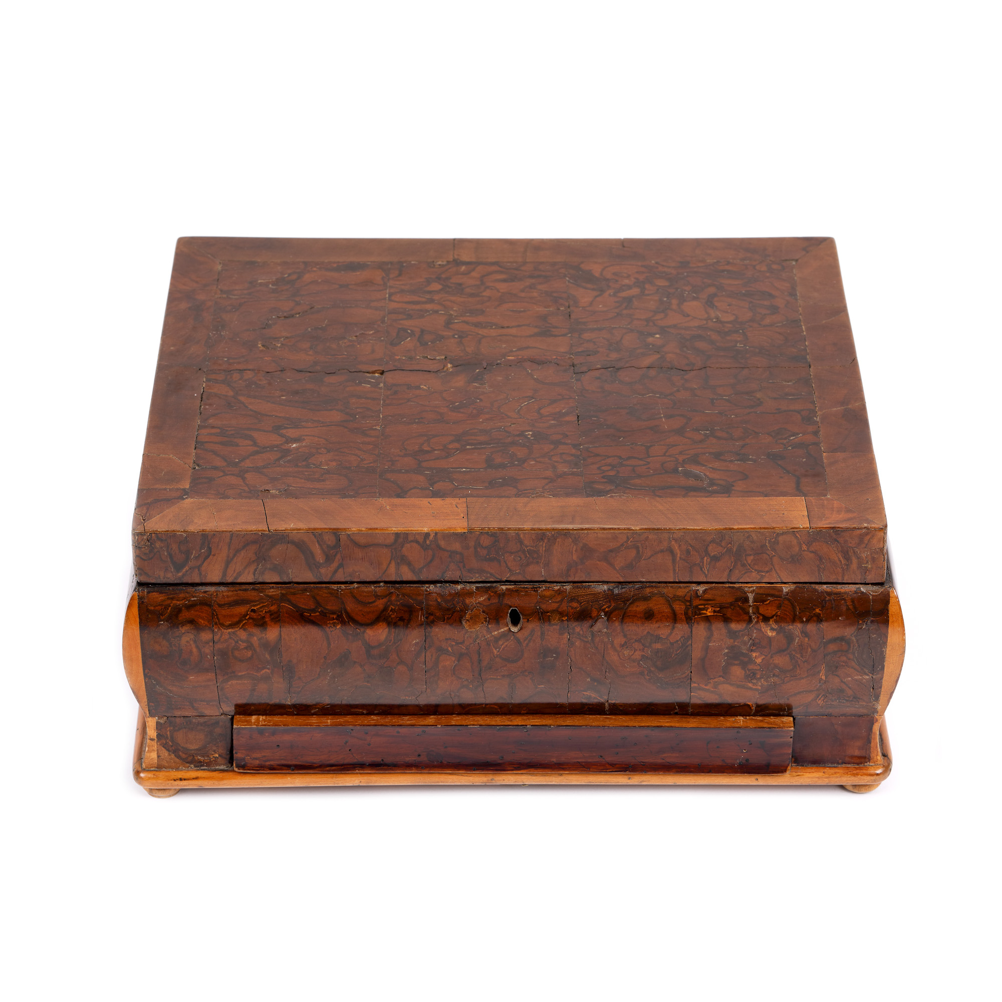 Casetă Biedermeier pentru bijuterii, cu sertar în partea de jos. Frumos decorată cu furnir de radăcină de nuc. Piesa nu este însoțită de cheiță. Sunt prezente urme de uzură datorate vechimii, crăpături în masa lemnului.