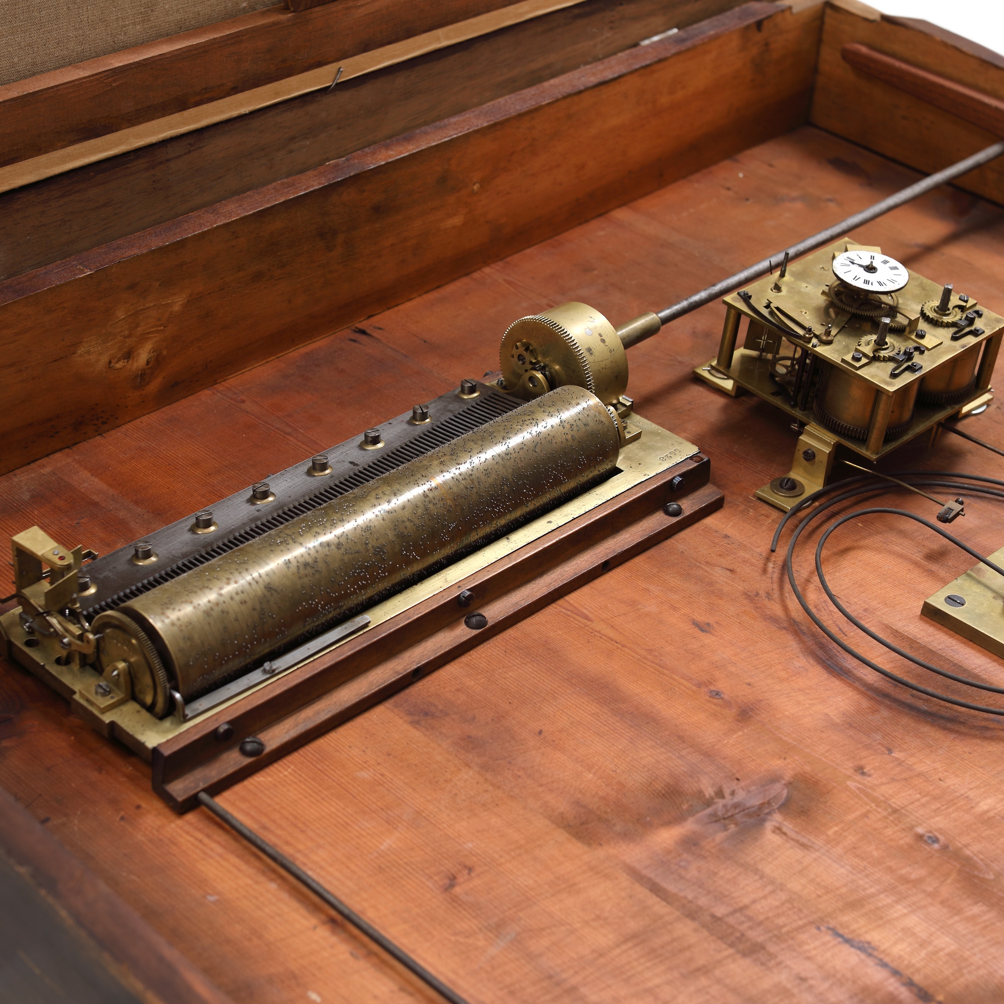 Ceas cu mecanism cu plăci din bronz, cu pendul, cu gong la ore și jumătăți de oră, pe arc spiral de rezonanță. Întoarcere la o săptămână. Cadran din email, în miniatură. Mecanismul necesită revizie. Proveniență Austria, cca. 1880. Cutie muzicală cu opt melodii, acționată cu arc, pe principiul tambur-pieptăne cu 80 de dinți.