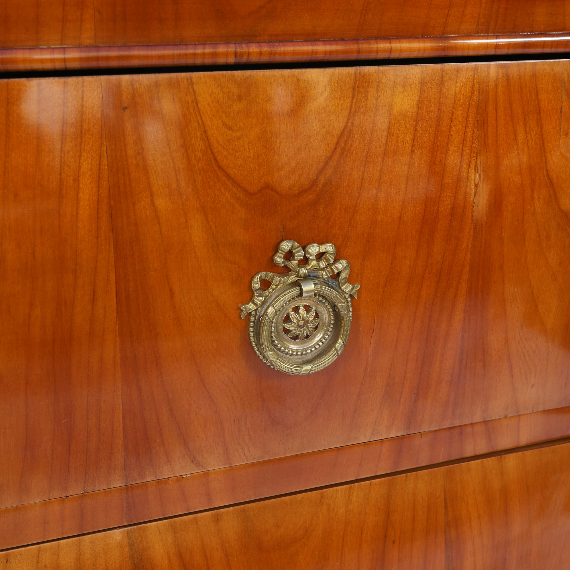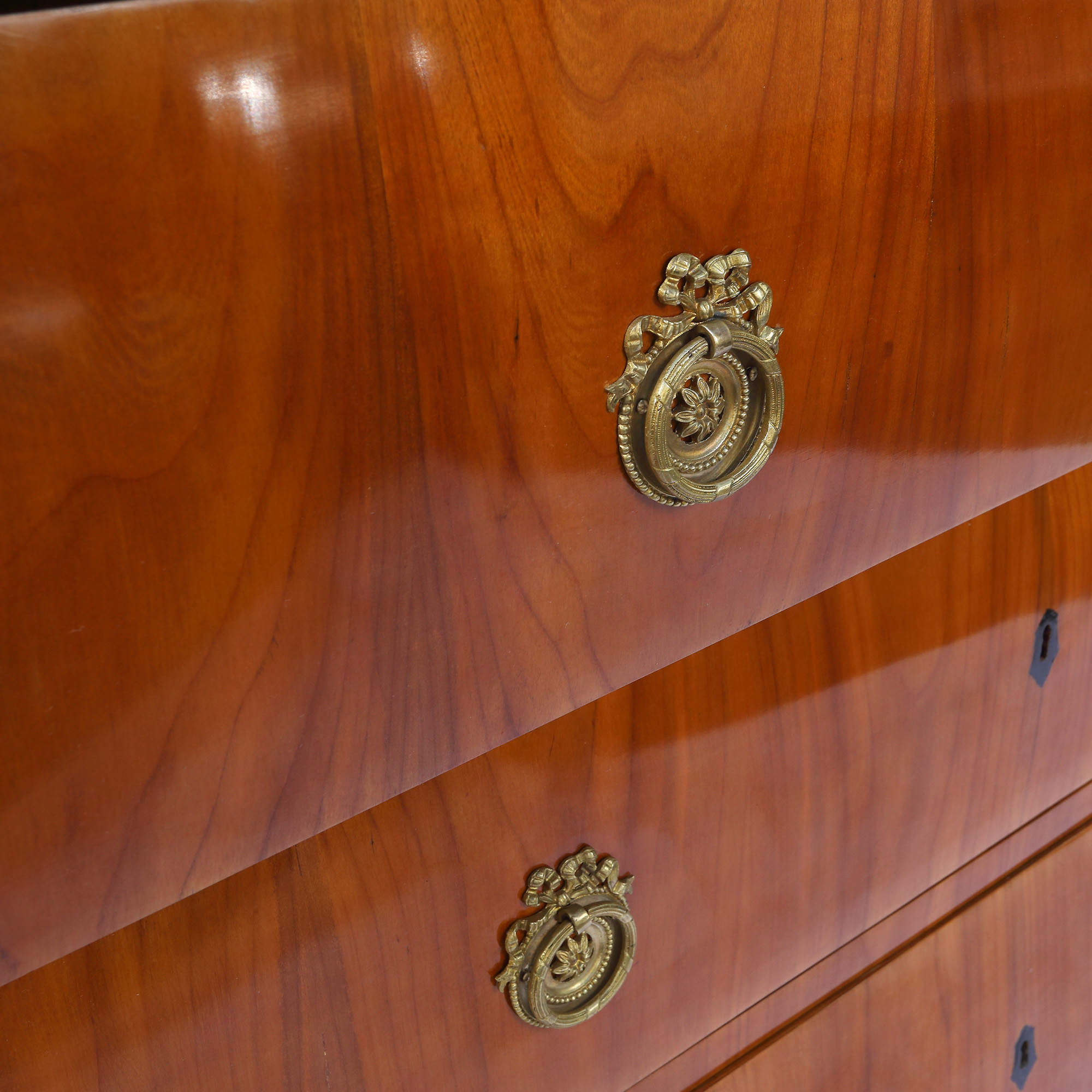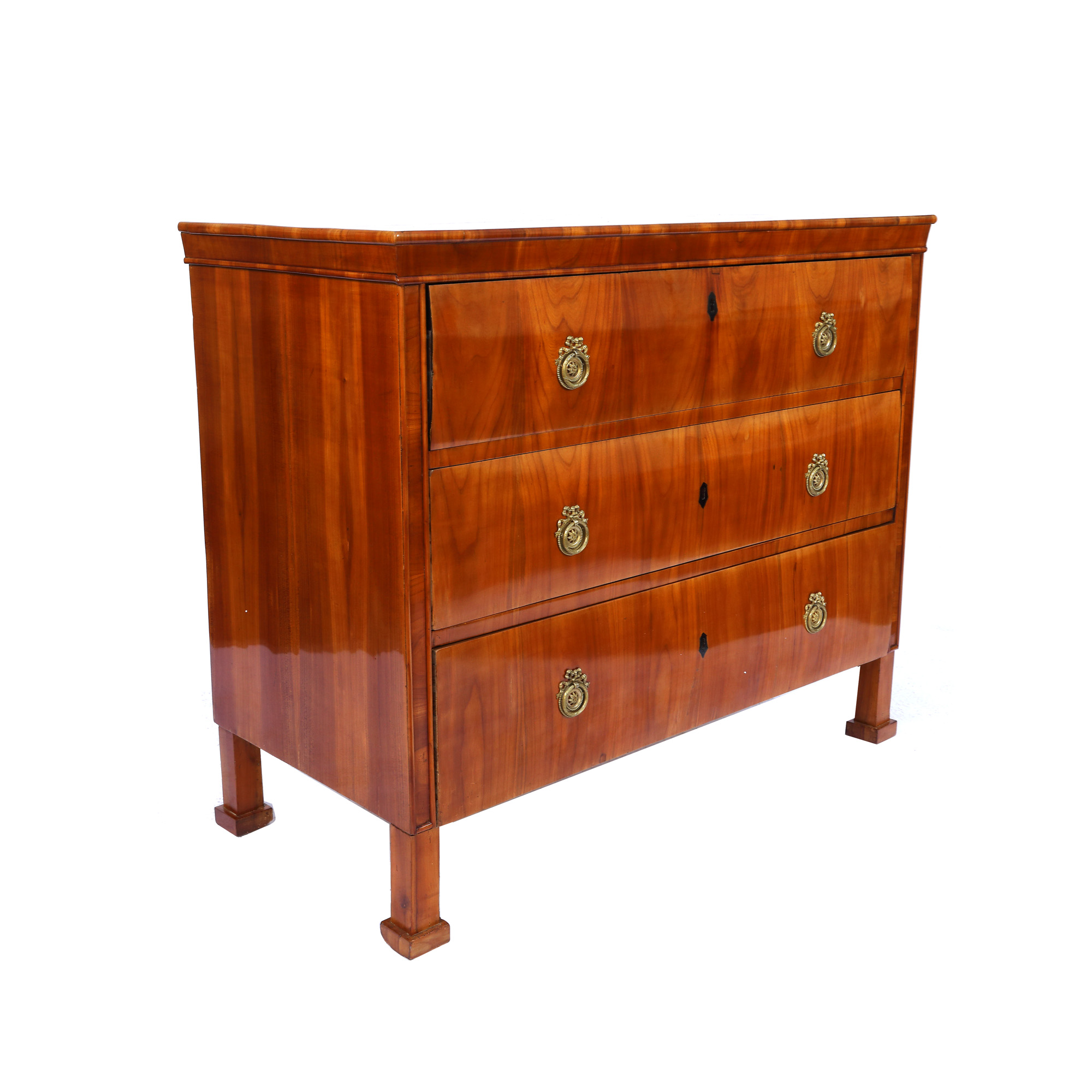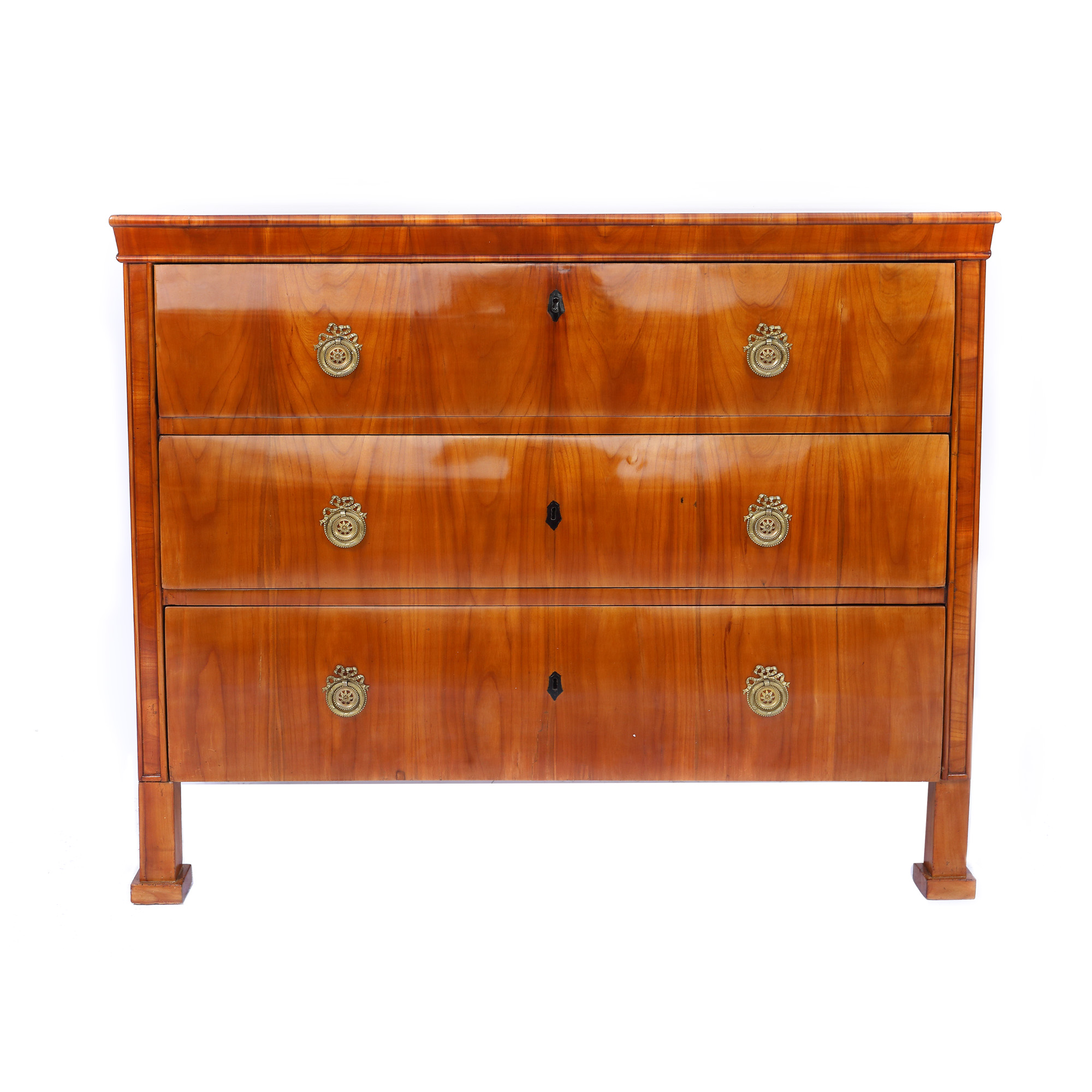 Comodă Biedermeier din furnir de cireș, cu trei sertare, cu formă dreaptă, ornată cu accesorii din alamă, originale. Piesa dispune de masă de scris, primul sertar se deschide și se transformă în birou. Comoda are colțuri teșite care se continuă pe picioarele pătrate. Piesă restaurată și finisată prin tehnica de lustruire cu șelac. Lotul se află în stare de conservare bună, fiind prezente mici zgârieturi datorate vechimii și folosirii.
