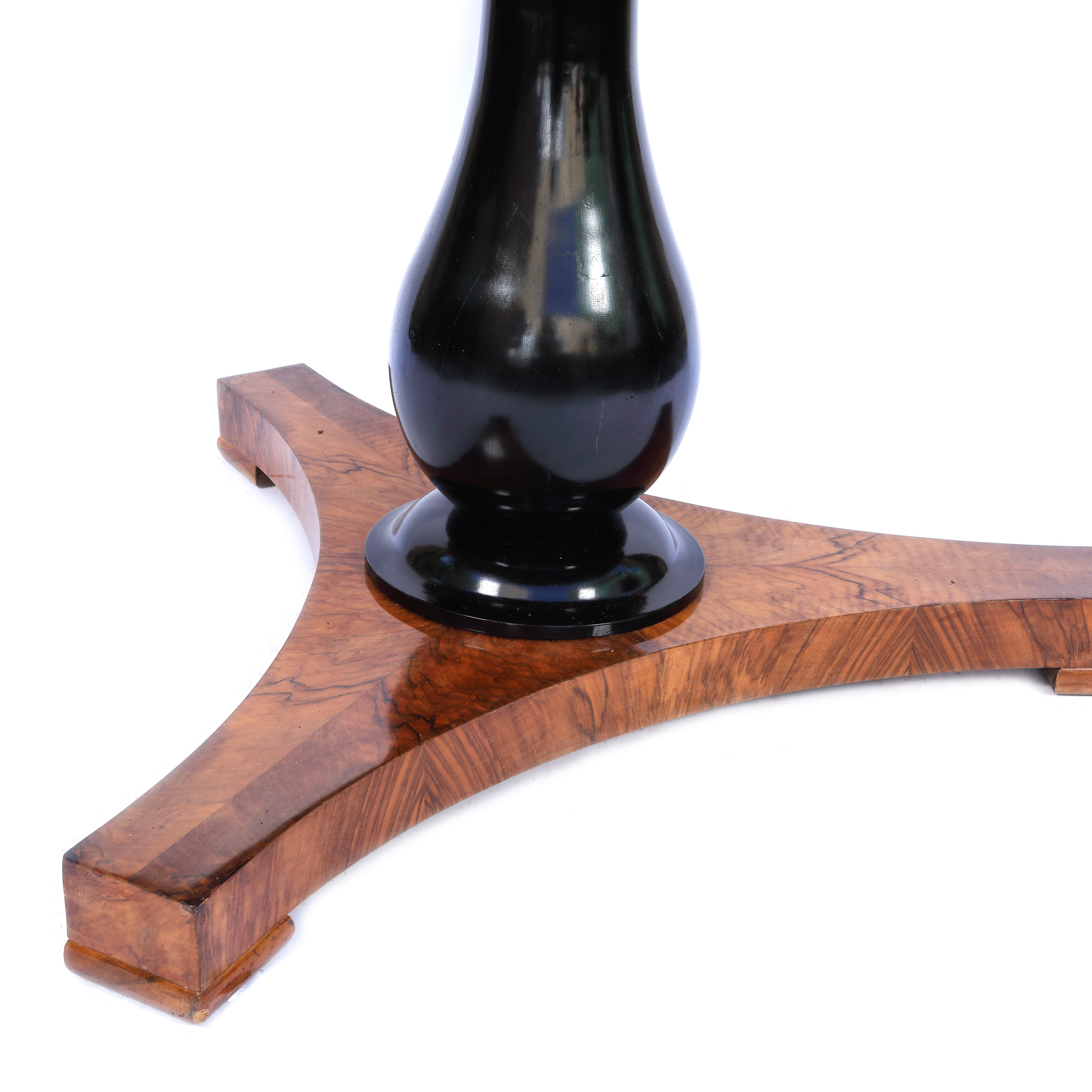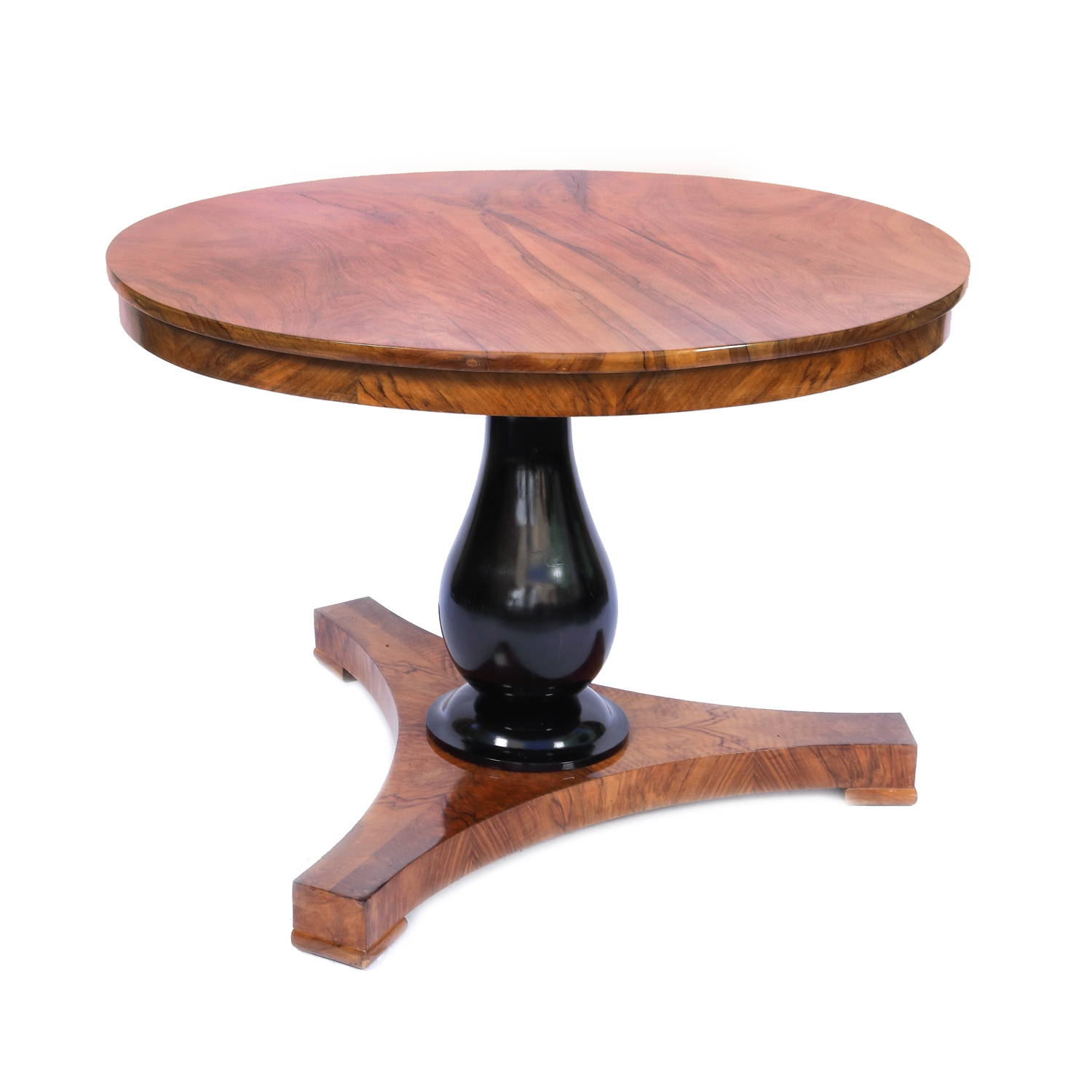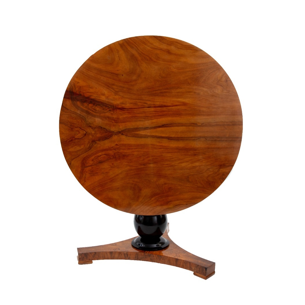 Masă Biedermeier, cu blat rotund din nuc masiv, cu un picior ebonizat. Coloana centrală în formă de vază se sprijină pe o bază cu trei suporți. Masa se poate deplasa ușor; cei trei suporți prezintă role originale din lemn. Piesa este restaurată, lustruită cu șelac și se află în stare bună de conservare, cu semne de uzură abia vizibile, legate de vechime, în principal pe placa de bază. Placa rotundă din nuc masiv a avut o fisură de tensiune care a fost restaurată.