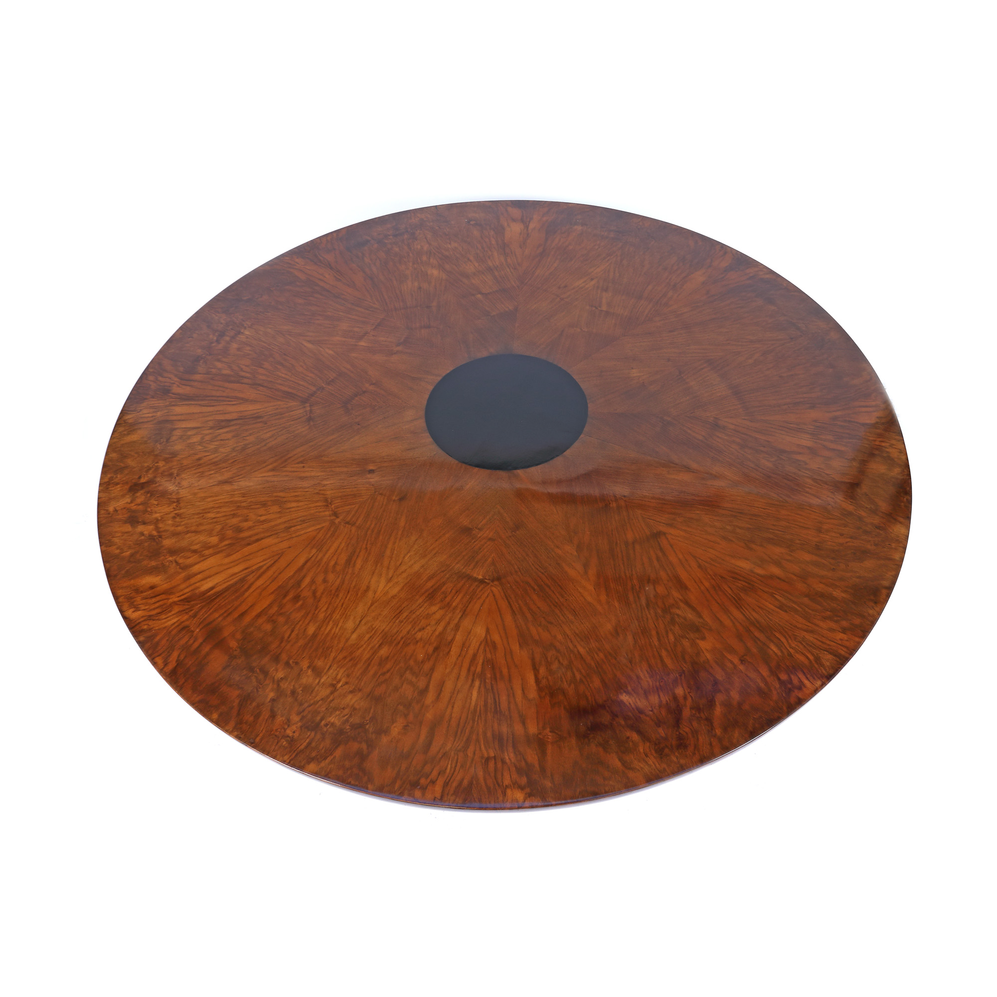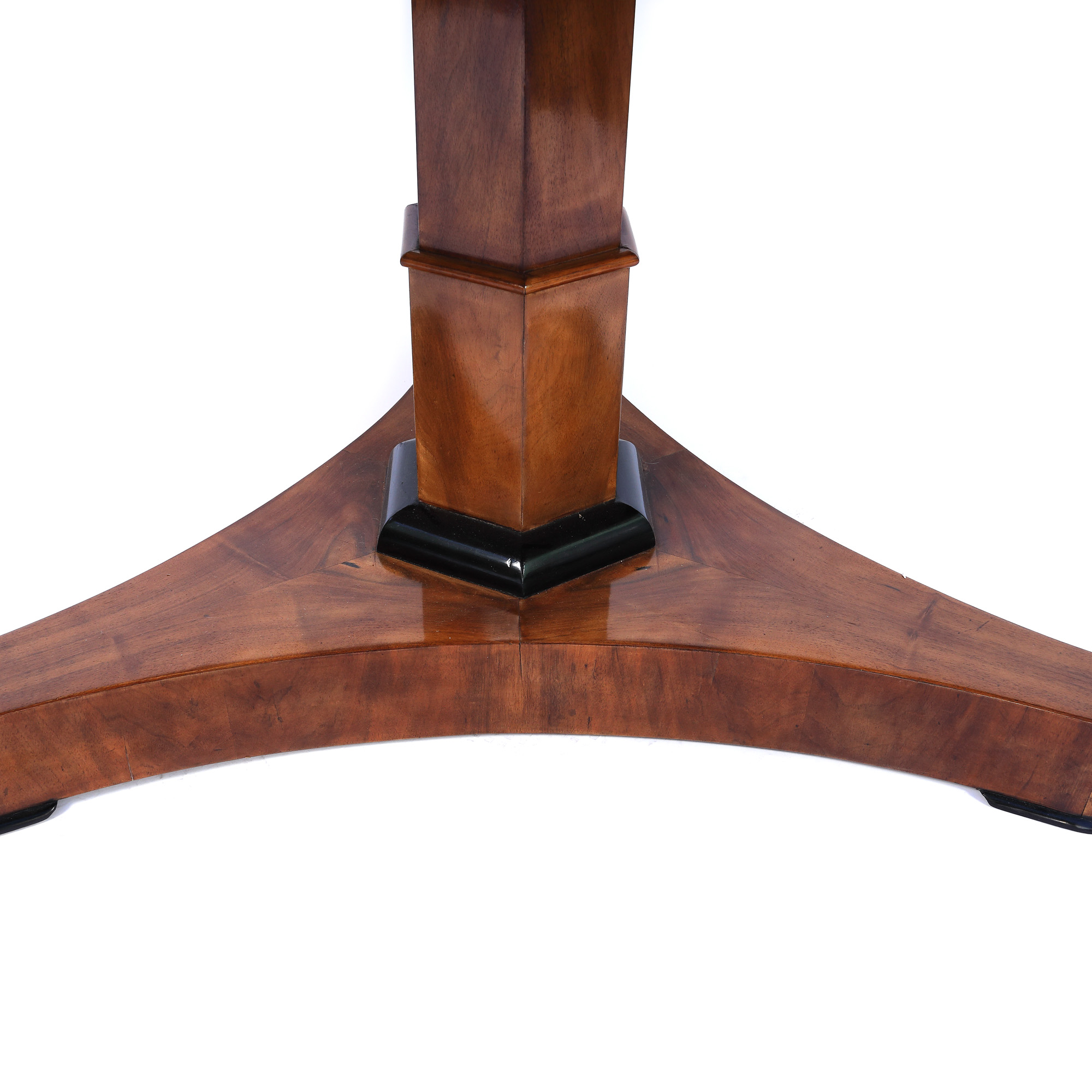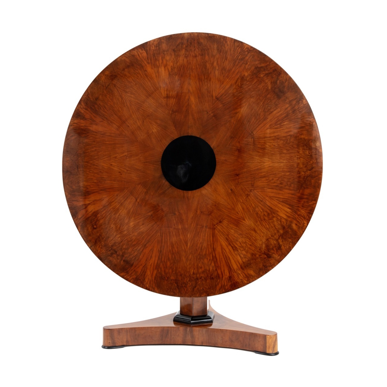 Masă Biedermeier rabatabilă, din lemn de esență moale cu placă rotunda din lemn de rășinoase, acoperită cu furnir de nuc, central ebenizată. Coloana centrală în formă hexagonală, se sprijina pe o placă de baza cu trei suporți. Masa are mecanism de pliere, foarte bine conservat în timp. Piesa a fost restaurată, lustruită cu șelac. Masa se află în stare de conservare bună, cu ușoare semne de uzură datorate vechimii. Partea centrală a blatului a fost înlocuită și ebonizată.