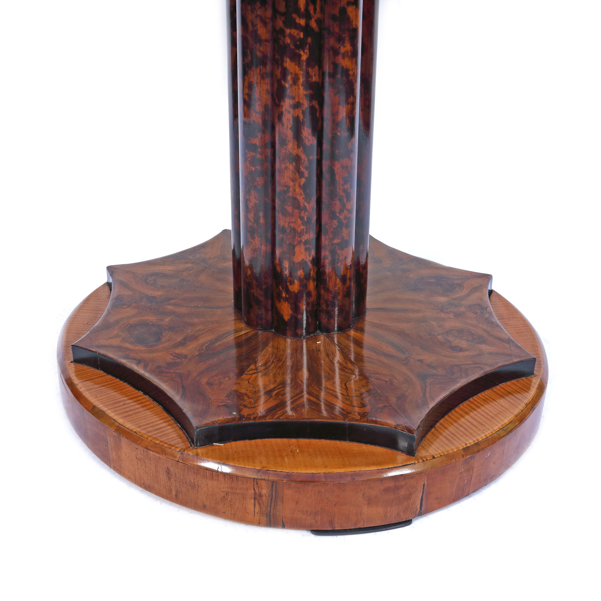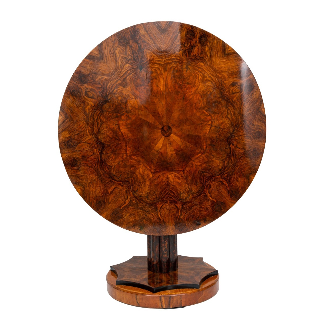 Masă Biedermeier, pentru salon, realizată parțial din lemn de nuc și furnir în formă de stea de nuc, cu finisaj lustruit, picior de coloană canelat pe bază cu 8 colțuri ce anunță trăsăturile stilului Art Deco manifestat în design-ul ce a urmat un secol mai târziu, blat cu balamale cu furnir în formă de stea. Baza mesei conține furnir de arțar. Prezintă mecanism de pliere. Masa se află într-o stare de conservare foarte bună, cu ușoare semne de uzură datorate vechimii.