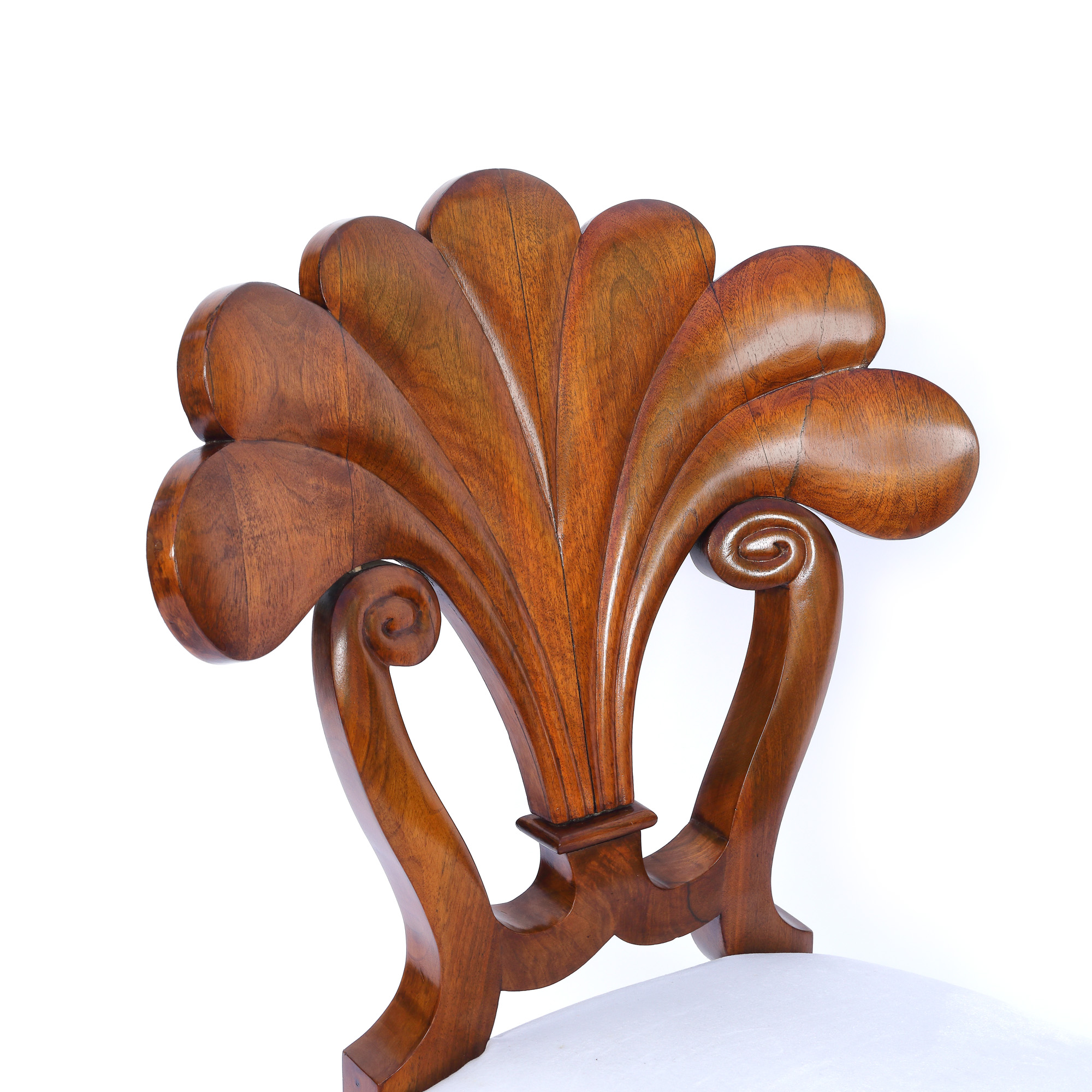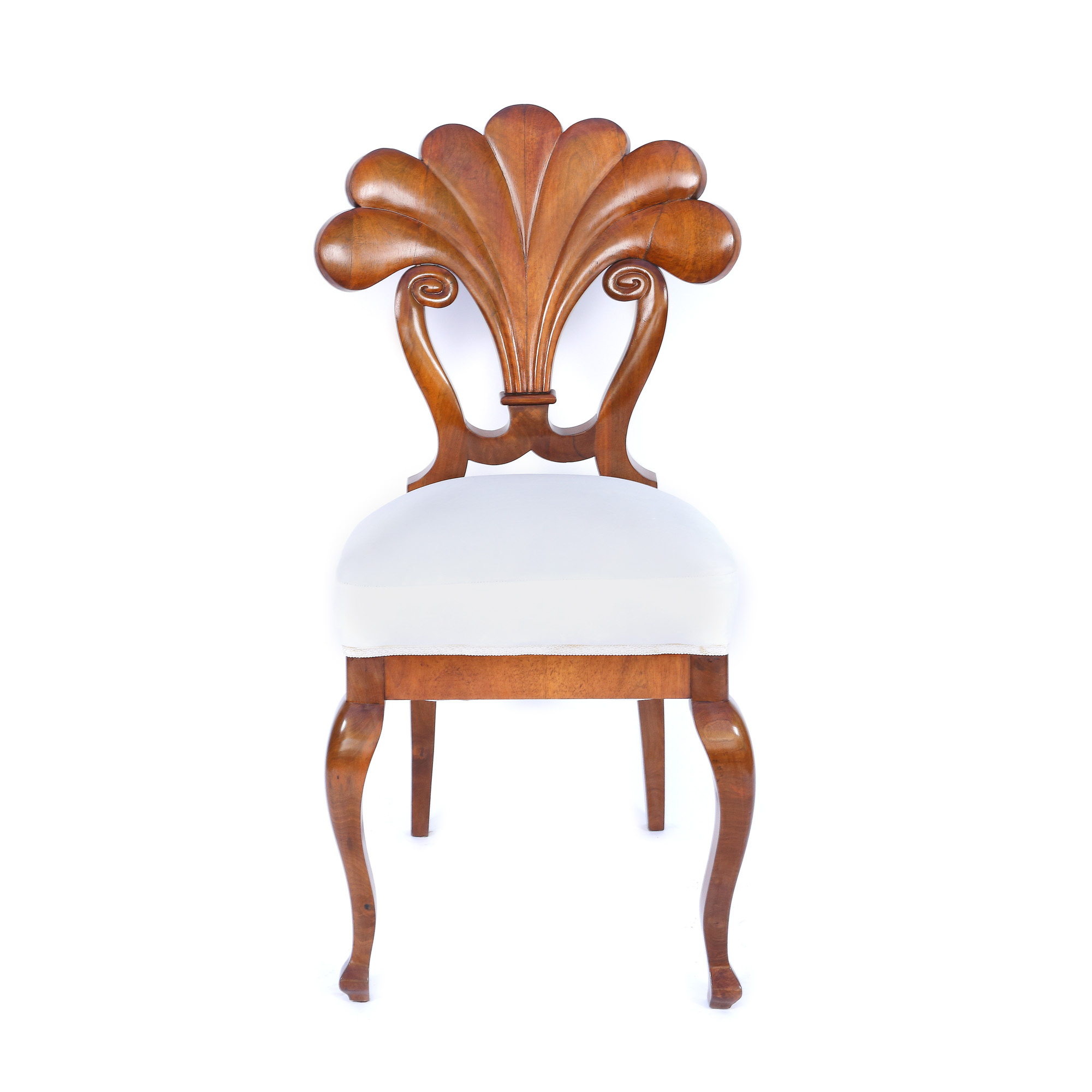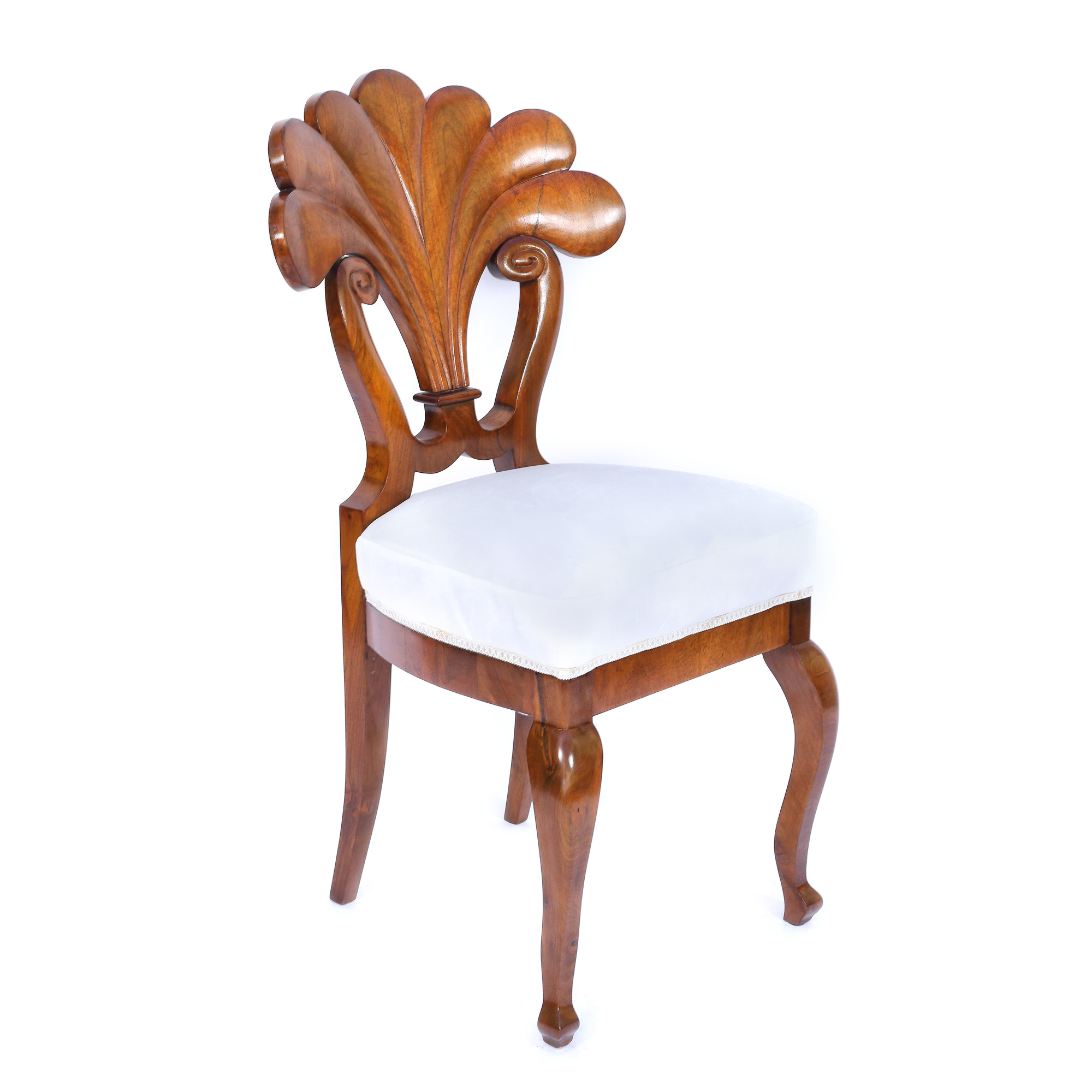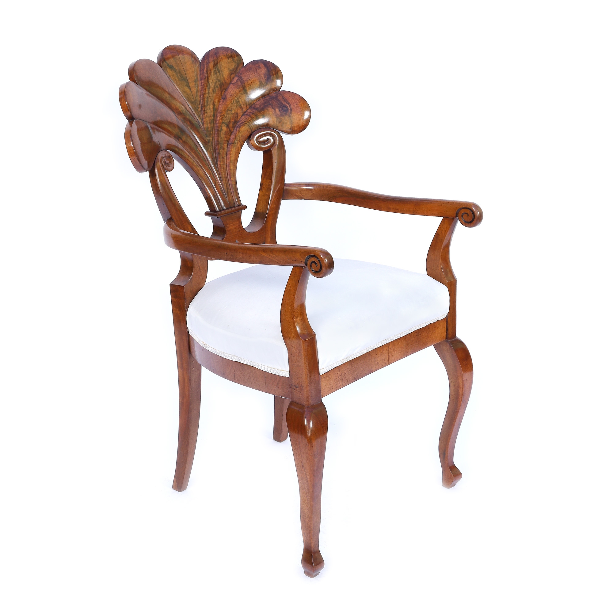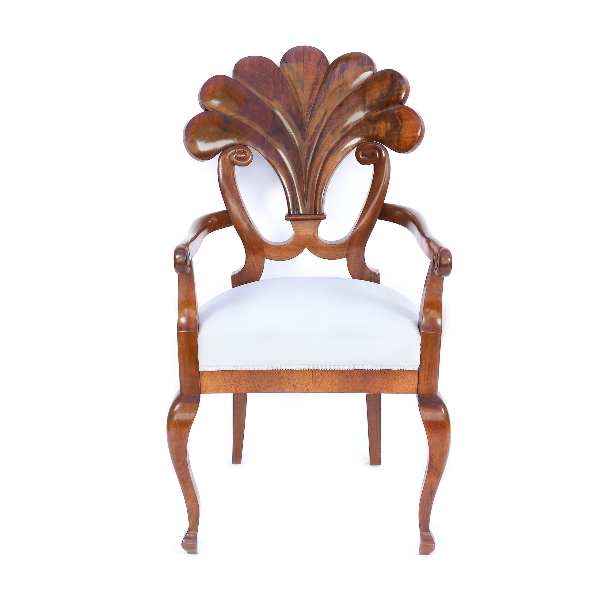 Set Biedermeier, format dintr-un scaun cu brațe și trei scaune fără cotiere, din lemn de nuc masiv, furniruit cu nuc pe lemn de esență moale. Lotul prezintă șezuturi trapezoidale, rotunjite înapoi, pe picioare curbate. Picioarele din spate sunt în formă de sabie. Spătarele drepte, ușor curbate. Lotul prezintă rogoz și arcuri originale și este tapițat cu țesătură albă modernă. Designul setului de scaune este caracteristic atelierului Danhauser. Spătarul în formă de evantai dezvăluie în special această semnătură. Piesele au fost restaurate, lustruite cu șelac și se află în stare bună, cu minime semne de uzură legate de vechime, zgârieturi minore, puncte de presiune abia vizibile.