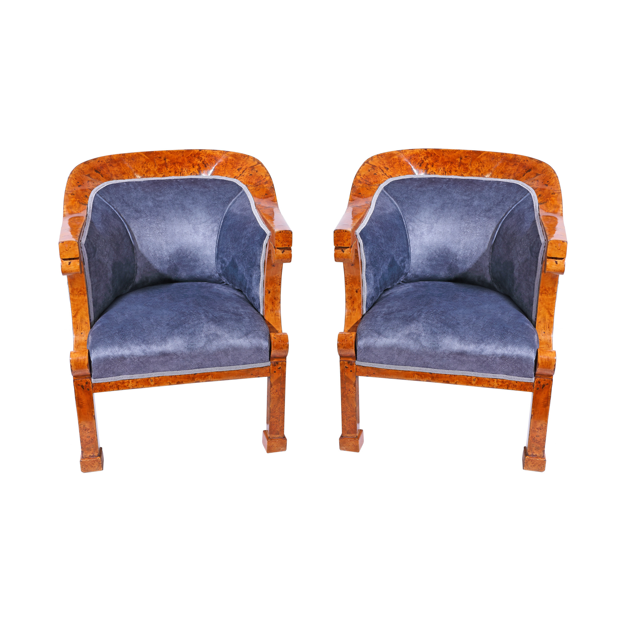 Monumental set Biedermeier, compus din canapea și două fotolii, cu furnir de nuc. Acestea au spătar simplu, curbat în formă de ”U”. Decor simplu, cu forme geometrice în zona cotierelor și picioarelor. Piese restaurate și retapițate, păstrând arcurile originale. Stare de conservare bună, cu minime urme de uzură, sub forma unor zgârieturi minore, datorate vechimii.