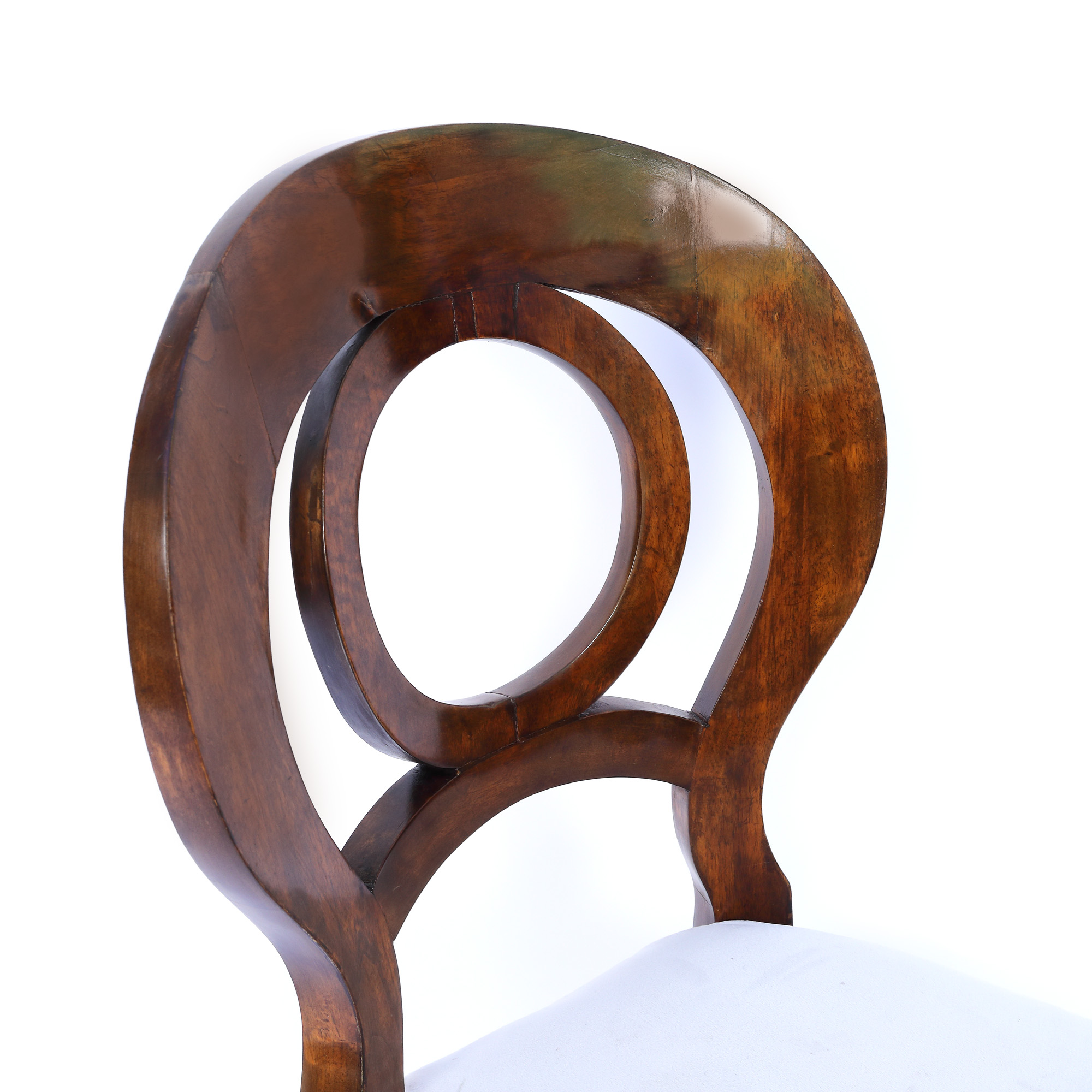 Setul de șase scaune Biedermeier, cu furnir de nuc, datează din prima jumătate a secolului al XIX-lea. Scaunele rotunjite se sprijină anterior pe picioare conice și posterior, pe picioare în formă de sabie. Scaunele au spătar curbat, tipic stilului Biedermeier. Scaunele prezintă curele, arcuri originale și sunt tapițate cu țesătură albă modernă. Lemnul a fost restaurat și lustruit cu șelac. Scaunele sunt în stare generală bună, cu minime de uzură datorate în principal vechimii.