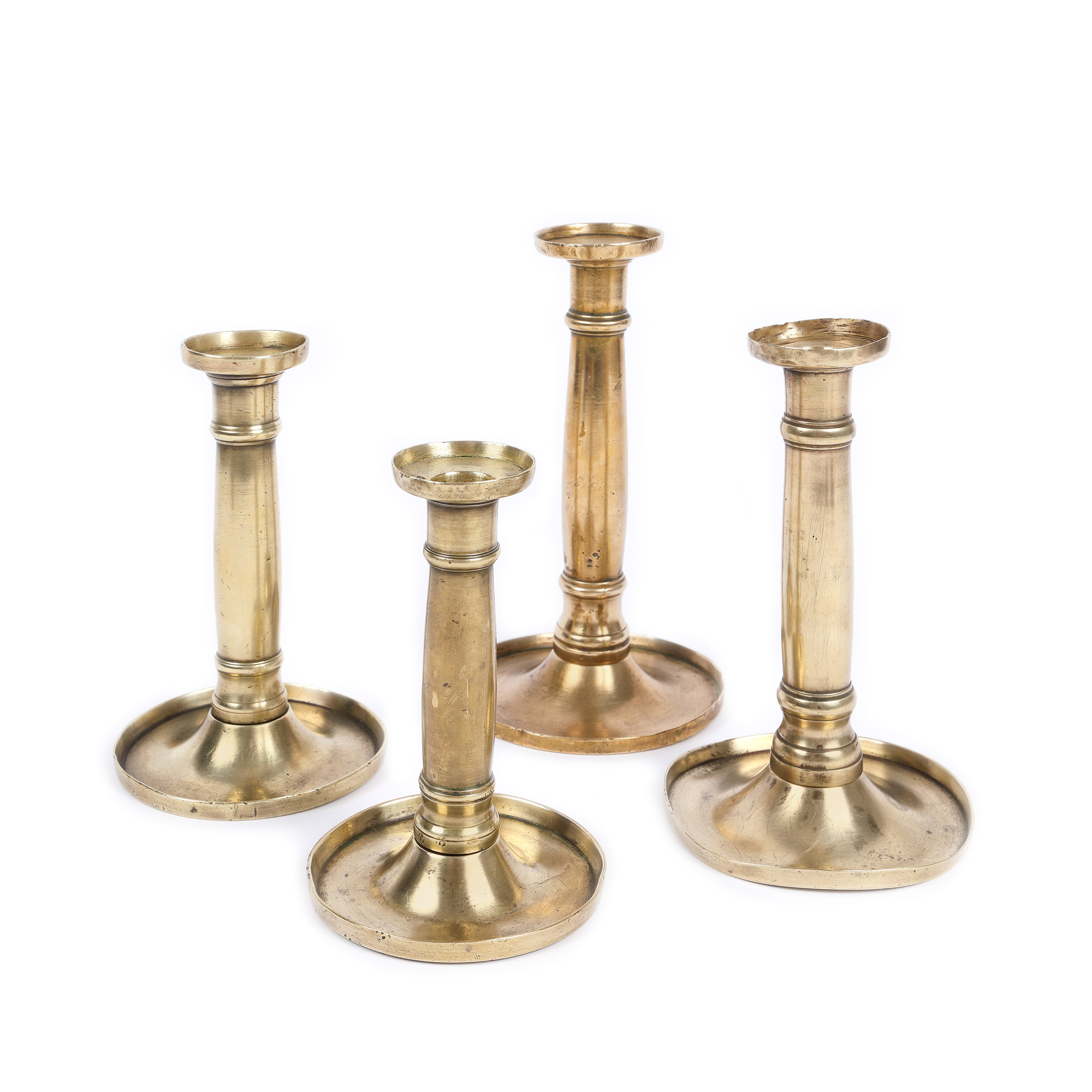 Set de patru sfeșnice Biedermeier din alamă, realizate în Austria în jurul anilor 1830. De formă dreaptă, caracteristică tipică perioadei Biedermeier timpurie, lipsite de decor. Piesele prezintă urme de uzură datorate vechimii.
