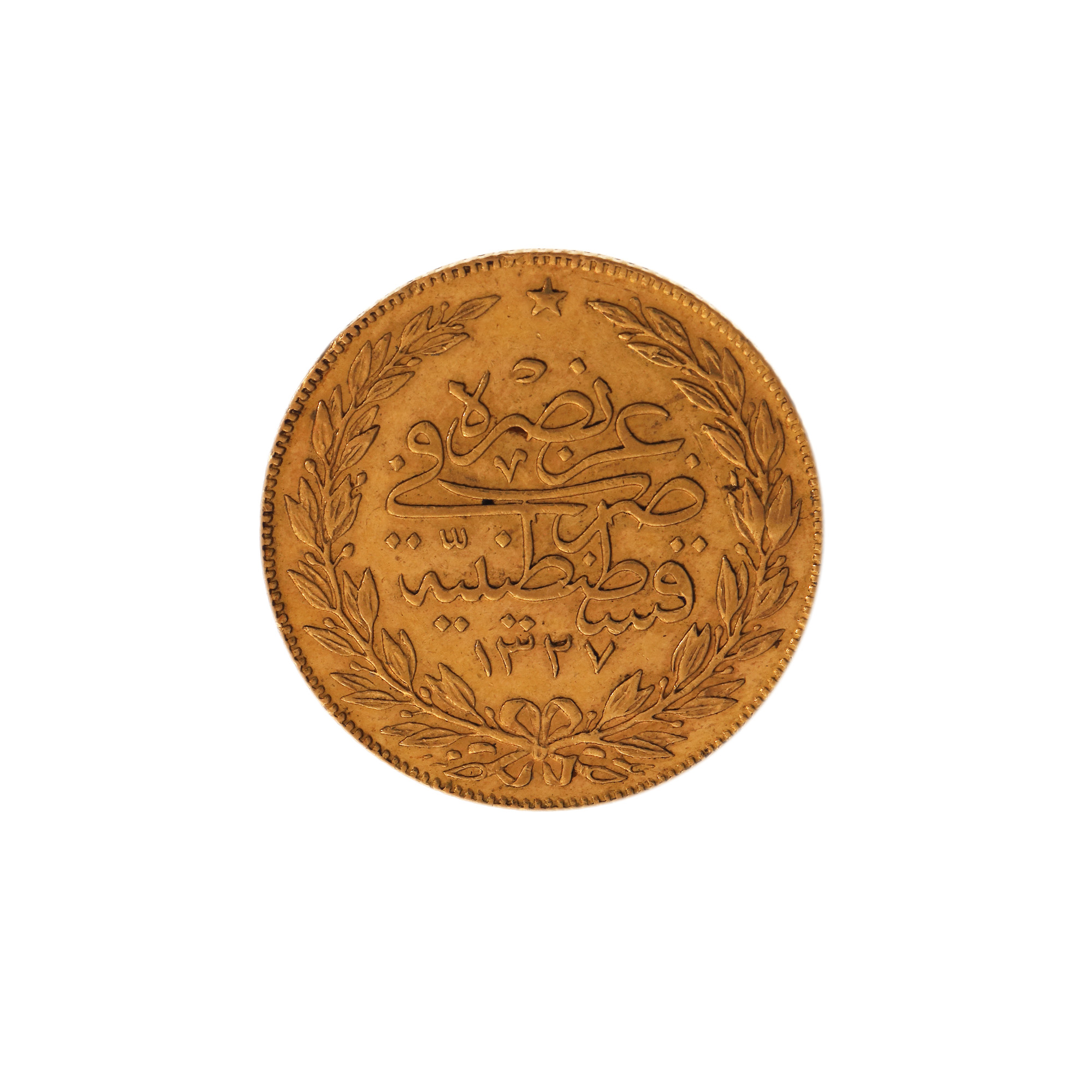 20. Monedă 100 Kuruși, Sultanul Mehmed V, 1327 (1909), aur