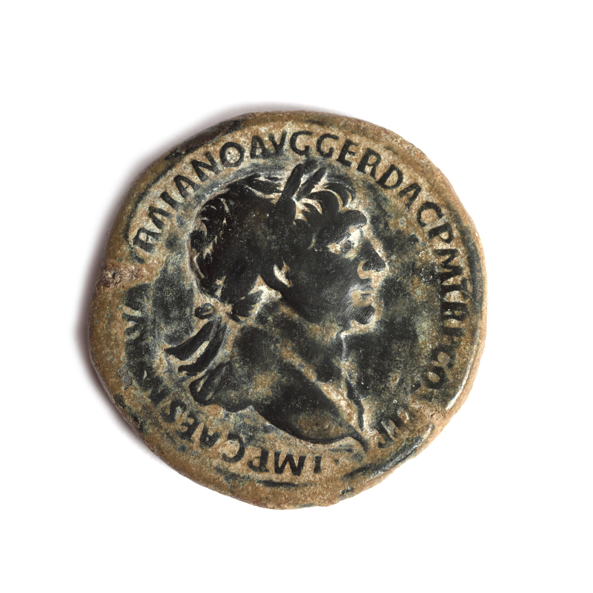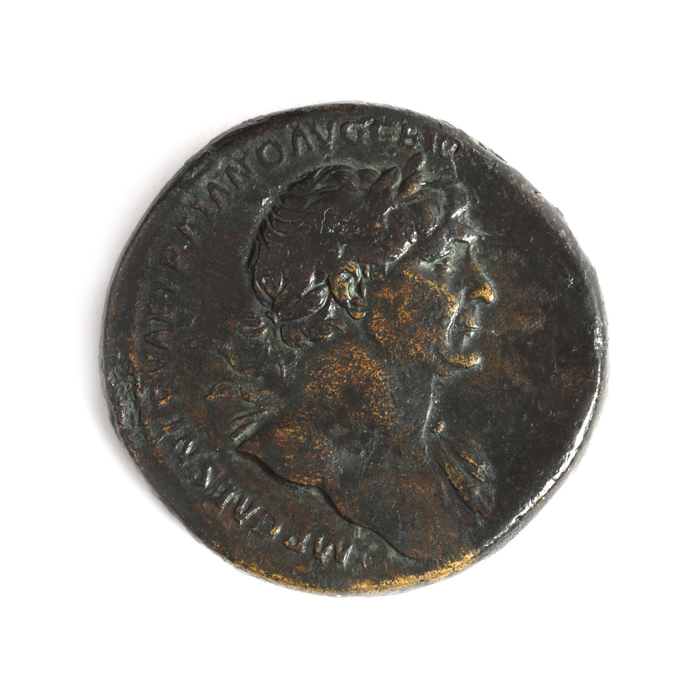 35C. Monedă Sestertius, Traian, tip Roma victorioasă cu dacul îngenunchiat, 107 e.n.