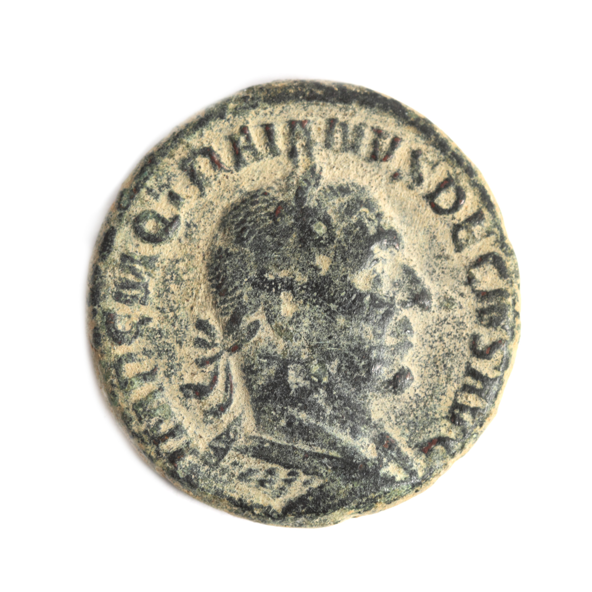 Legendă avers: ”IMP C M Q TRAIANVS DECIVS AVG” Legendă revers: ”DACIA S/C”; ”femeie in vesminte dacice, în mănă cu stindardul dacic cu capul de lup” Moneda bătuta în Dacia Romană, in monetăria înființată de Filip Arabul. Monetaria a funcționat între anii 247-257 e.n. și avea dreptul de a bate doar monede din bronz (în special sestertius si dupondius), lucru care o face foarte rară. Ea a fost bătută pentru o perioadă extrem de scurtă in cantități foarte mici, pentru a acoperi necesitatea locală in provincie.