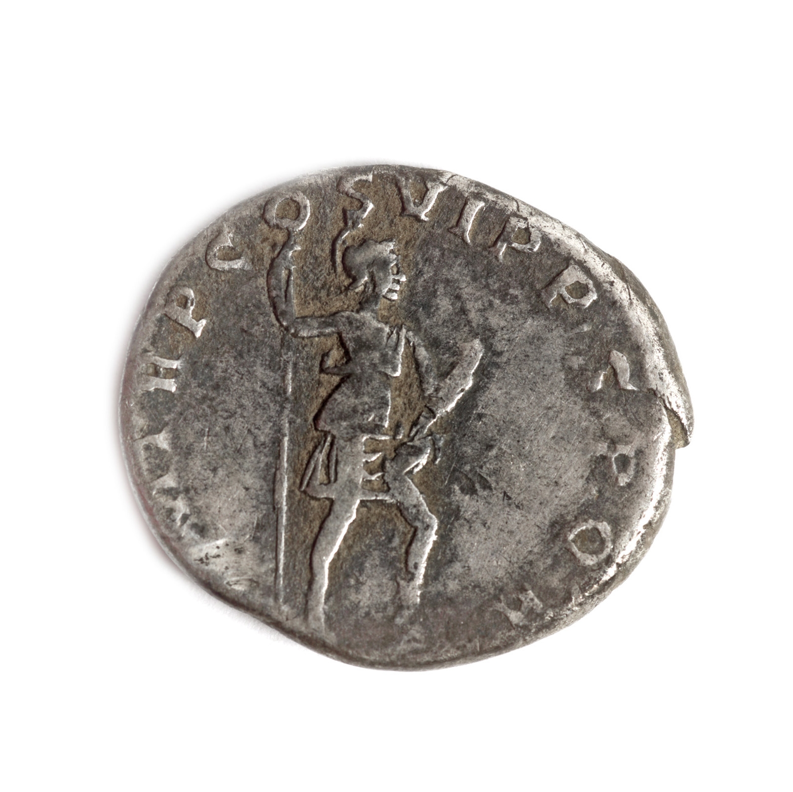 33C. Monedă Denarius, Traian, tip Virtus, reprezentând virtutea curajului și bărbăției împăratului, 107 e.n., argint