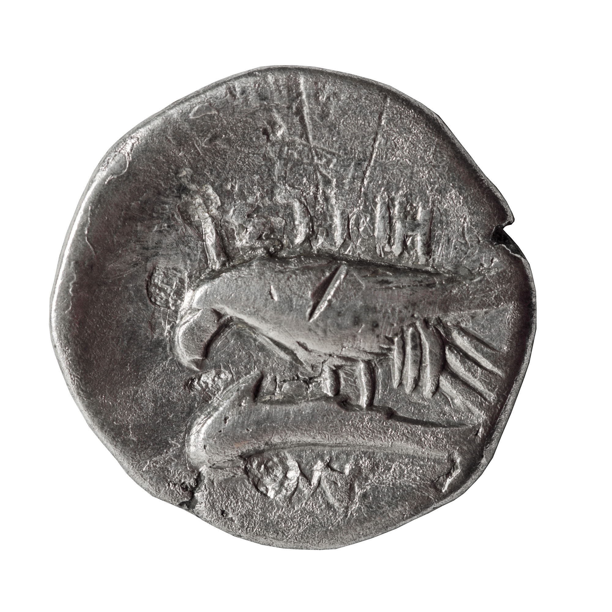 50C. Monedă Drahmă, tip Gemenii - cele două fețe ale Dunării, Histria, 434-300 î.e.n., prima monedă bătută pe teritoriul actual al României, argint