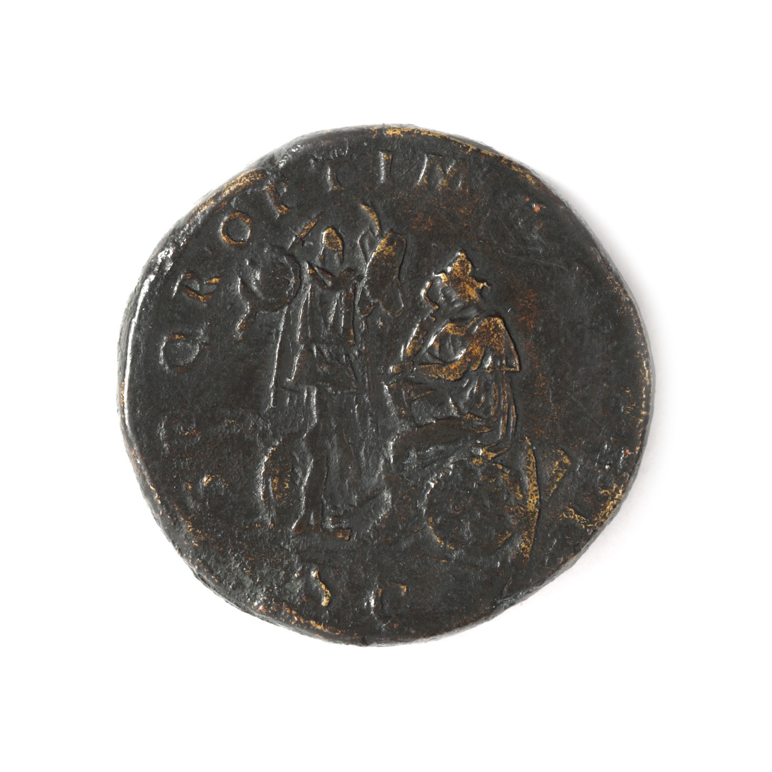 34C. Monedă Sestertius, Traian, tip Dac Captiv și Trofeul Armelor, emisă în urma Războaielor Dacice, 104-107 e.n., de colecție