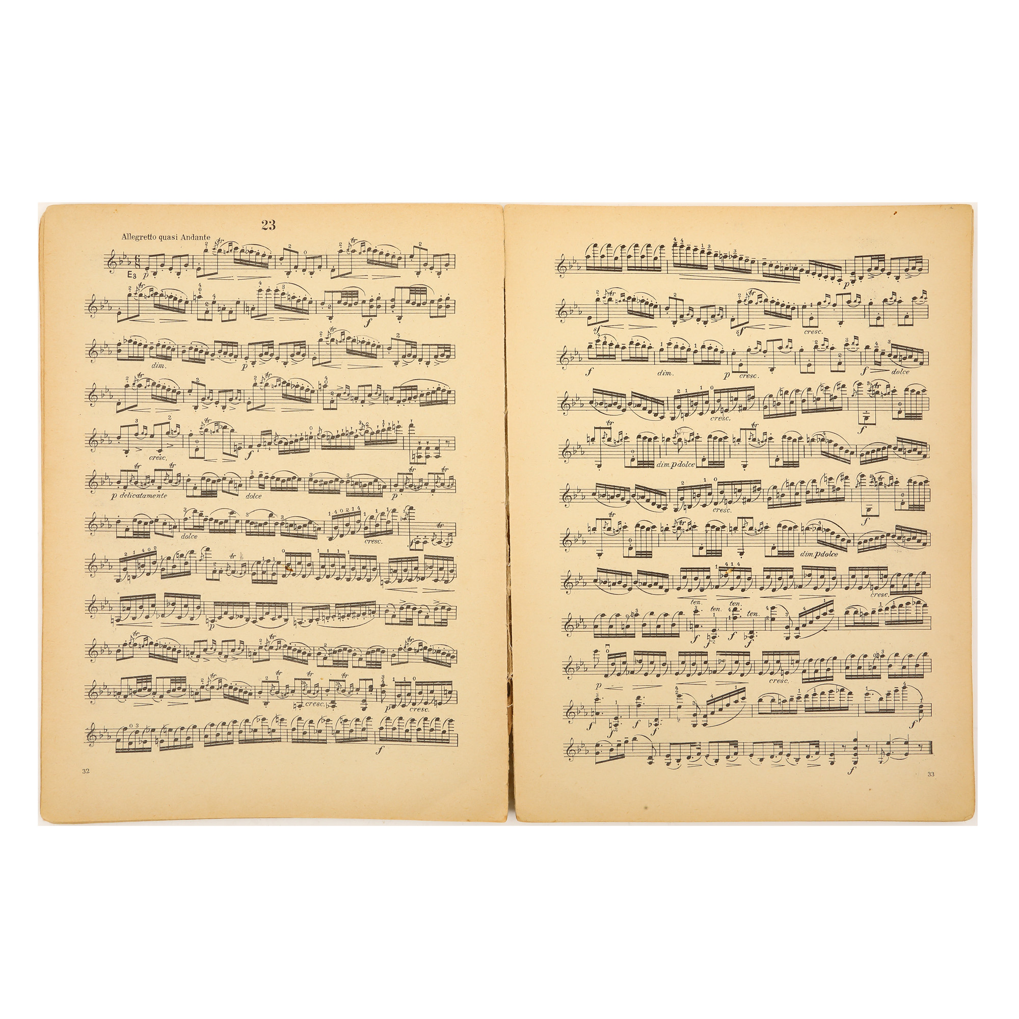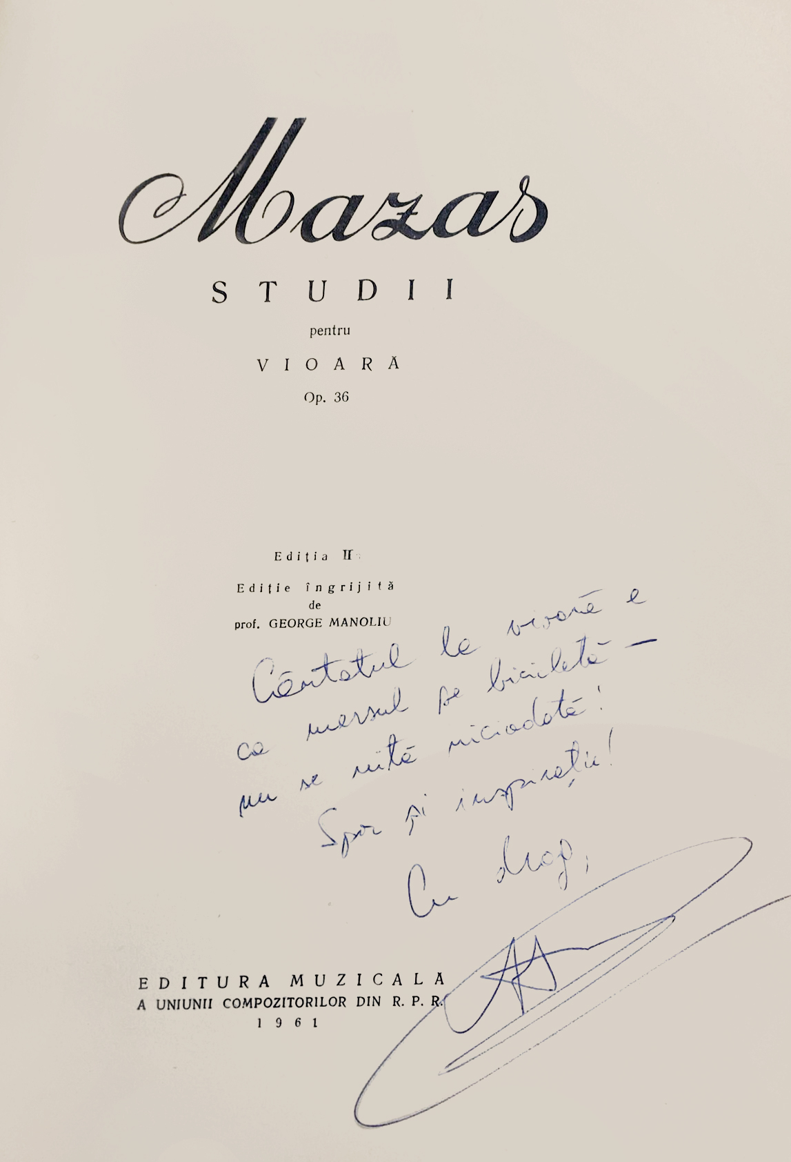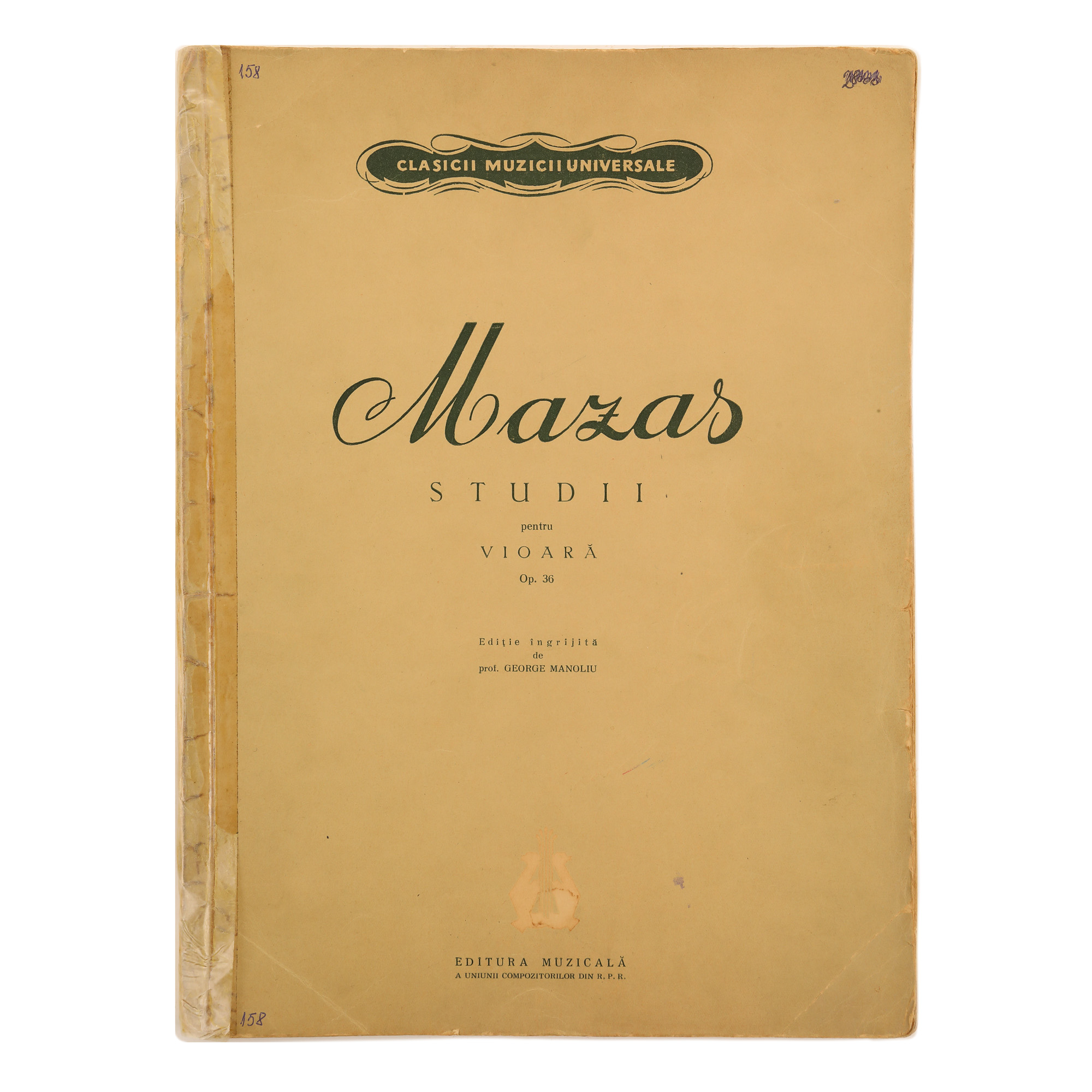 31. „Mazas. Studii pentru vioară, op. 36", partitură muzicală de la începutul carierei lui Alexandru Tomescu, alături de semnătura olografă a violonistului
