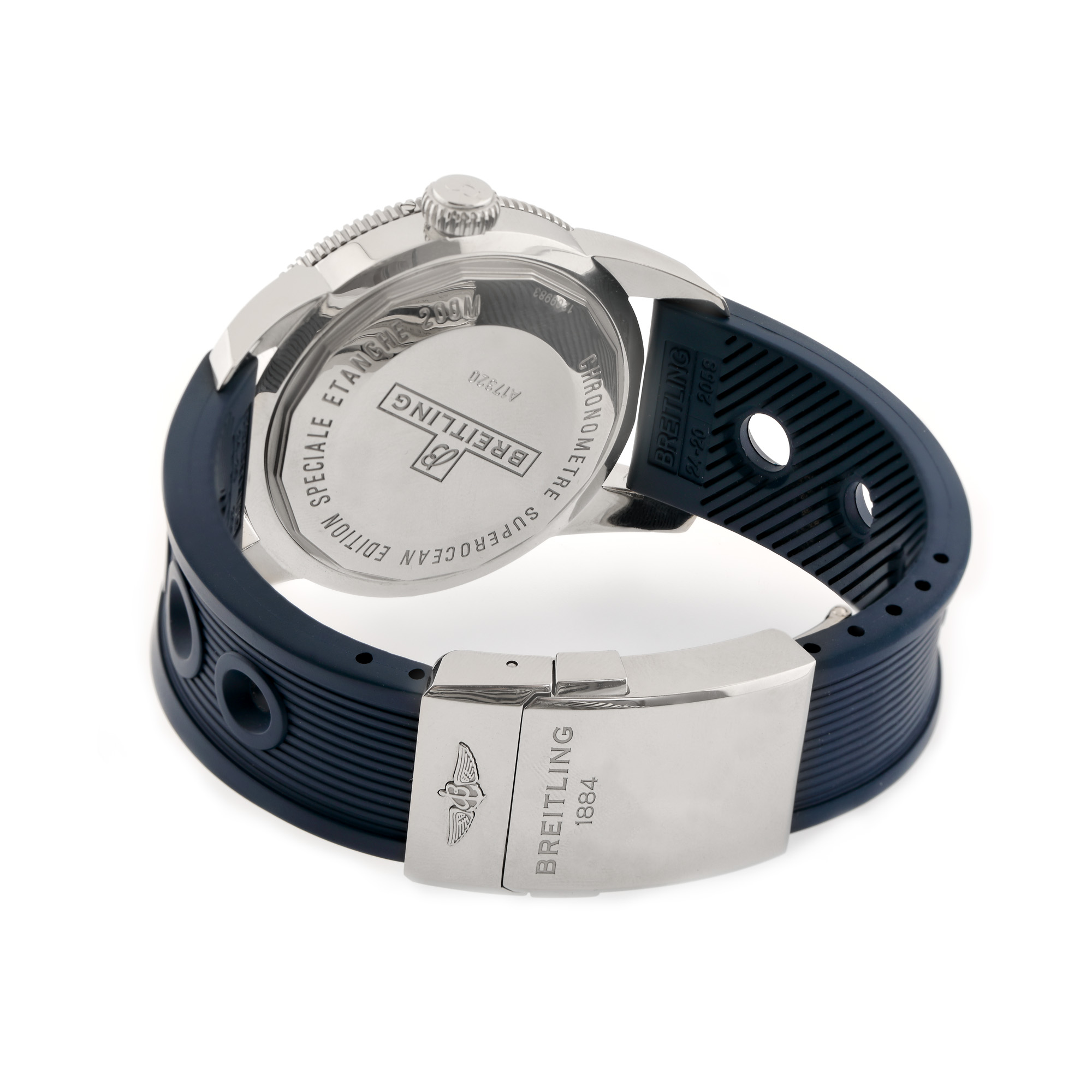Ceas Breitling Superocean Heritage, de mână, bărbătesc, referință A17320, mecanism automatic, calibru 17. Cadran de culoare bleumarin, numerale arabe, bezel rotativ unidirecțional și registru pentru dată în dreptul orei 6. Curea din silicon, de culoare bleumarin și sistem de închidere tip deployant, originale.
