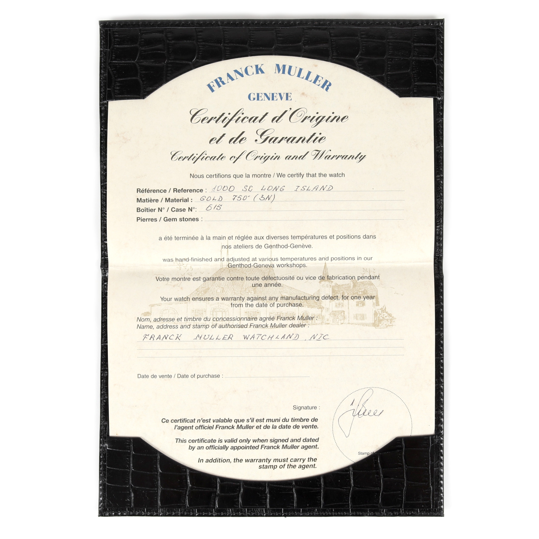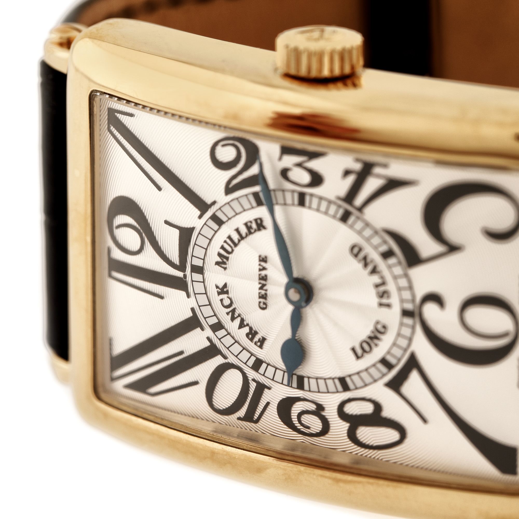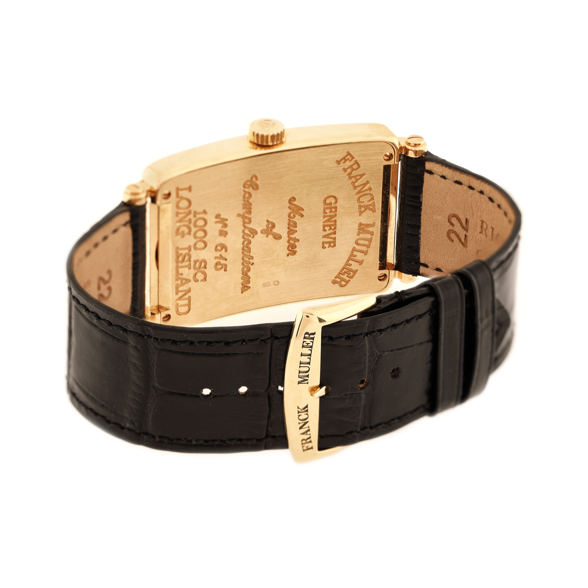 Ceas Franck Muller Long Island, din aur, de mână, bărbătesc, referință 1000SC, mecanism automatic. Cadran silver, decorat în tehnica guilloché și numerale arabe. Curea din piele de aligator, de culoare neagră, adăugată aftermarket și cataramă din aur galben, originală. Ceasul vine însoțit de certificatul de garanție, distribuitor Franck Muller Watchland, semnat, neștampilat, nedatat. Accesorii: cutie originală.