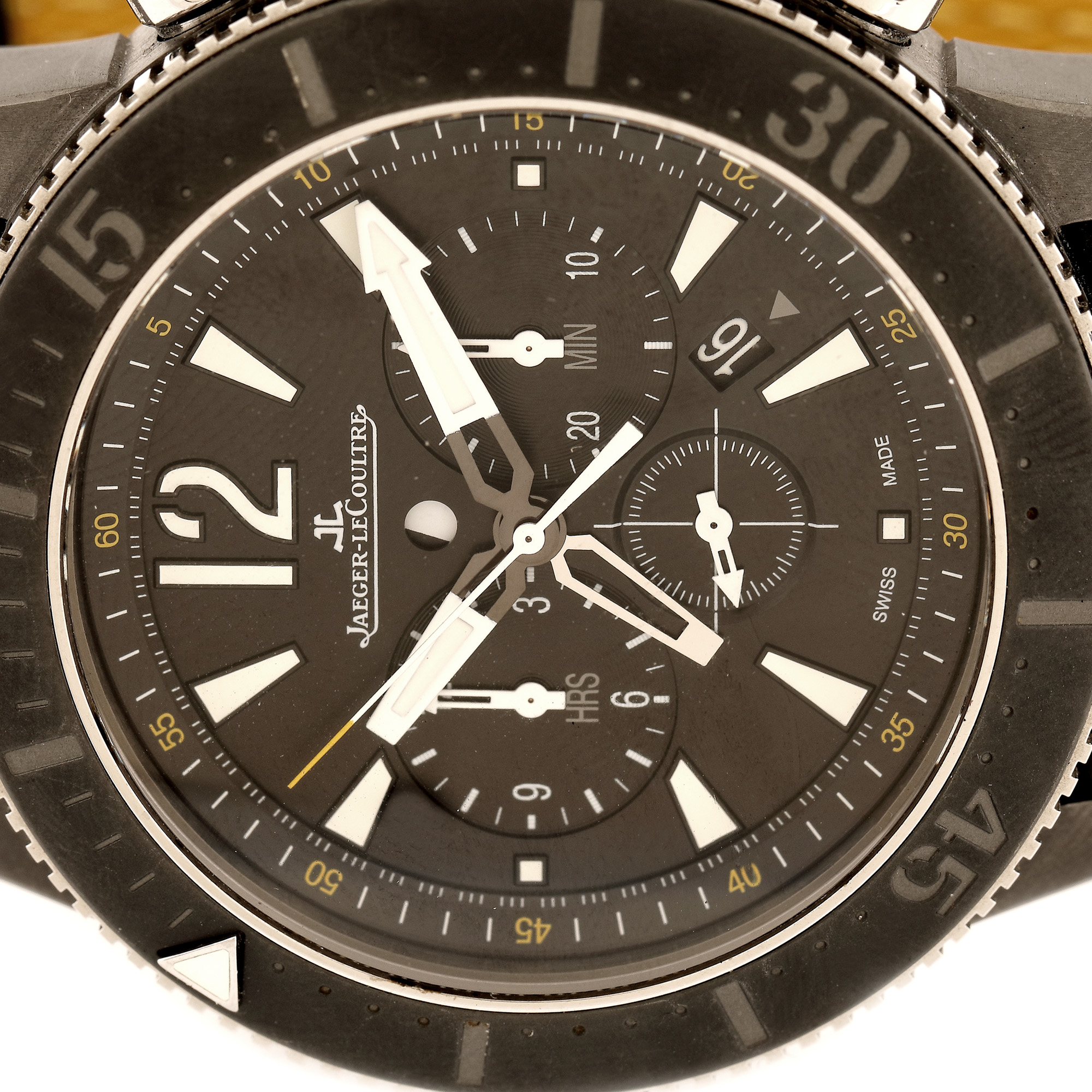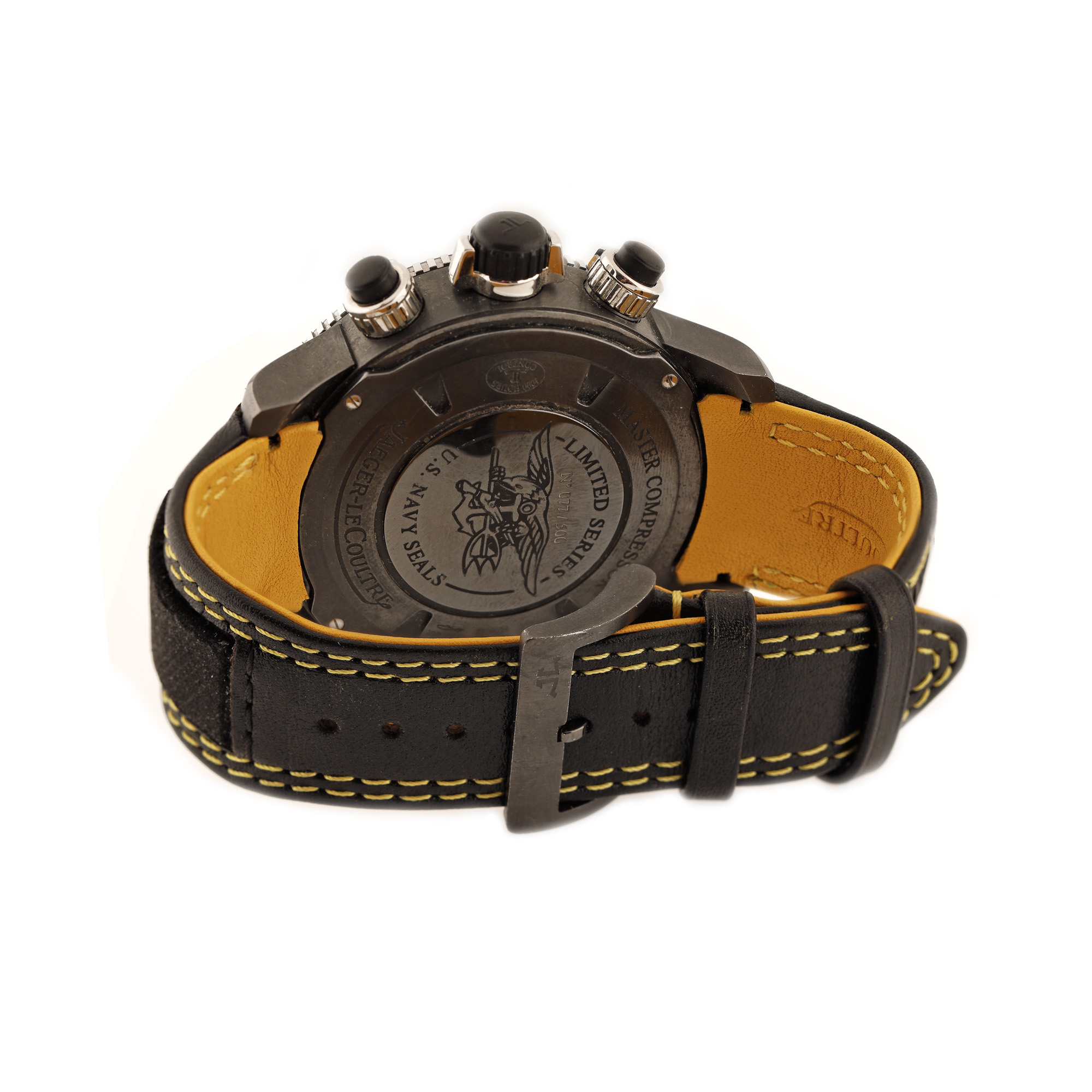 Ceas Jaeger-LeCoultre Master Compressor Diving Chronograph GMT Navy Seals, de mână, bărbătesc, ediție limitată 77/500, referință 159.T.C7, mecanism automatic, calibru 757, rezervă de timp 65 h. Cadran negru, cu indici orari din oțel inoxidabil, cronograf tri-compax și registru pentru dată între orele 4 și 5. Bezel rotativ unidirecțional. Curea din piele de vițel, de culoare neagră cu interior galben și cataramă, originale. Cadrul ceramic unidirecțional, de înaltă tehnologie, super-rezistent, sablat cu safir, este protejat împotriva utilizării greșite pentru a garanta siguranța perfectă; marcaje orare și numere supradimensionate ștampilate și utilizarea superluminovei asigură o lizibilitate excelentă chiar și în cele mai întunecate locuri; iar forma carcasei, care este concepută pentru a rezista presiunii mari la adâncimi mari, asigură etanșeitate perfectă pentru scufundări. Accesorii: livret de garanție nesemnat, nedatat; cutie originală; manual de instrucțiuni