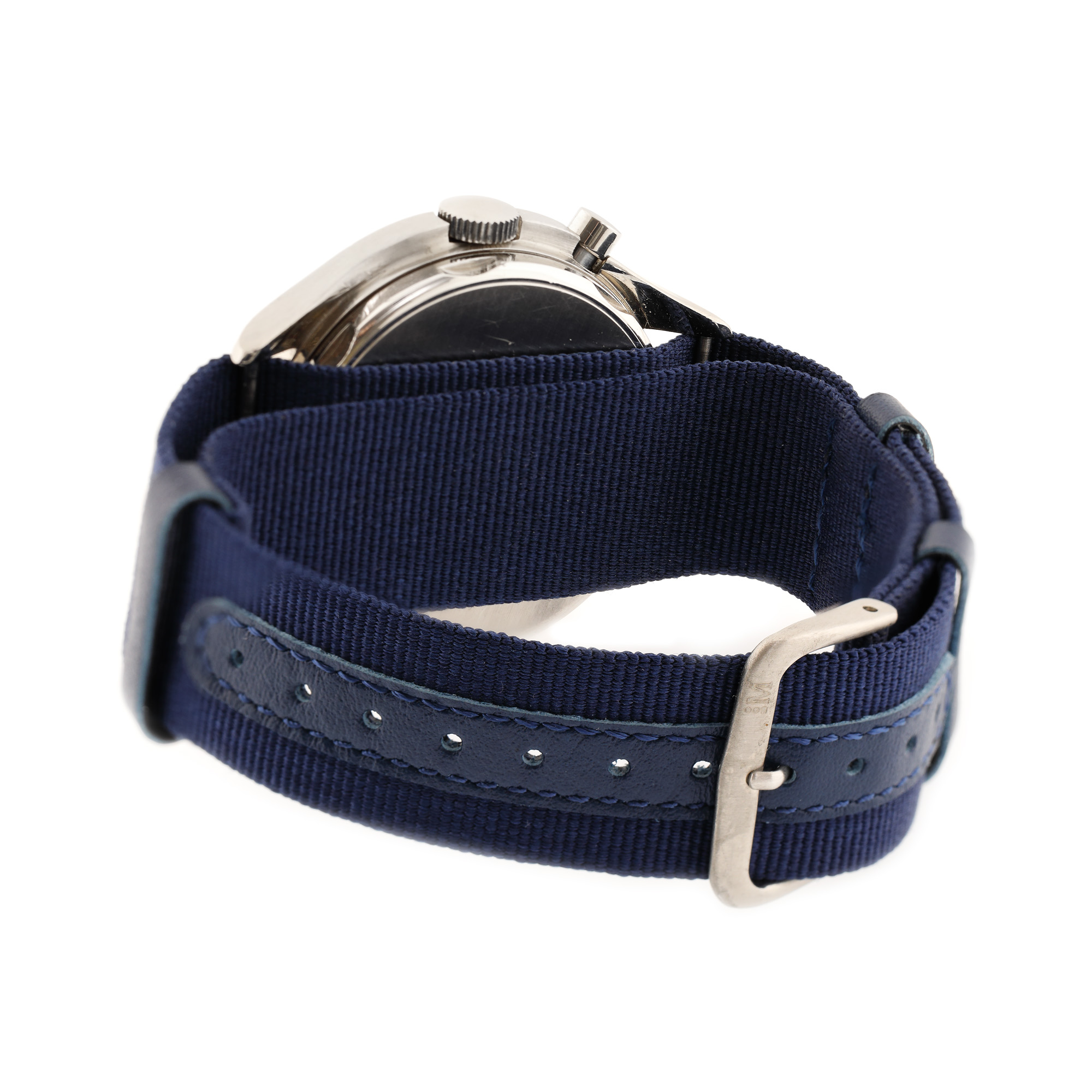Ceas Lemania Single Pusher Chronograph, de mână, bărbătesc, mecanism cu armare manuală. Cadran de culoare alb, numerale arabe și două registre. Curea din material textil, de culoare bleumarin, adăugată aftermarket.