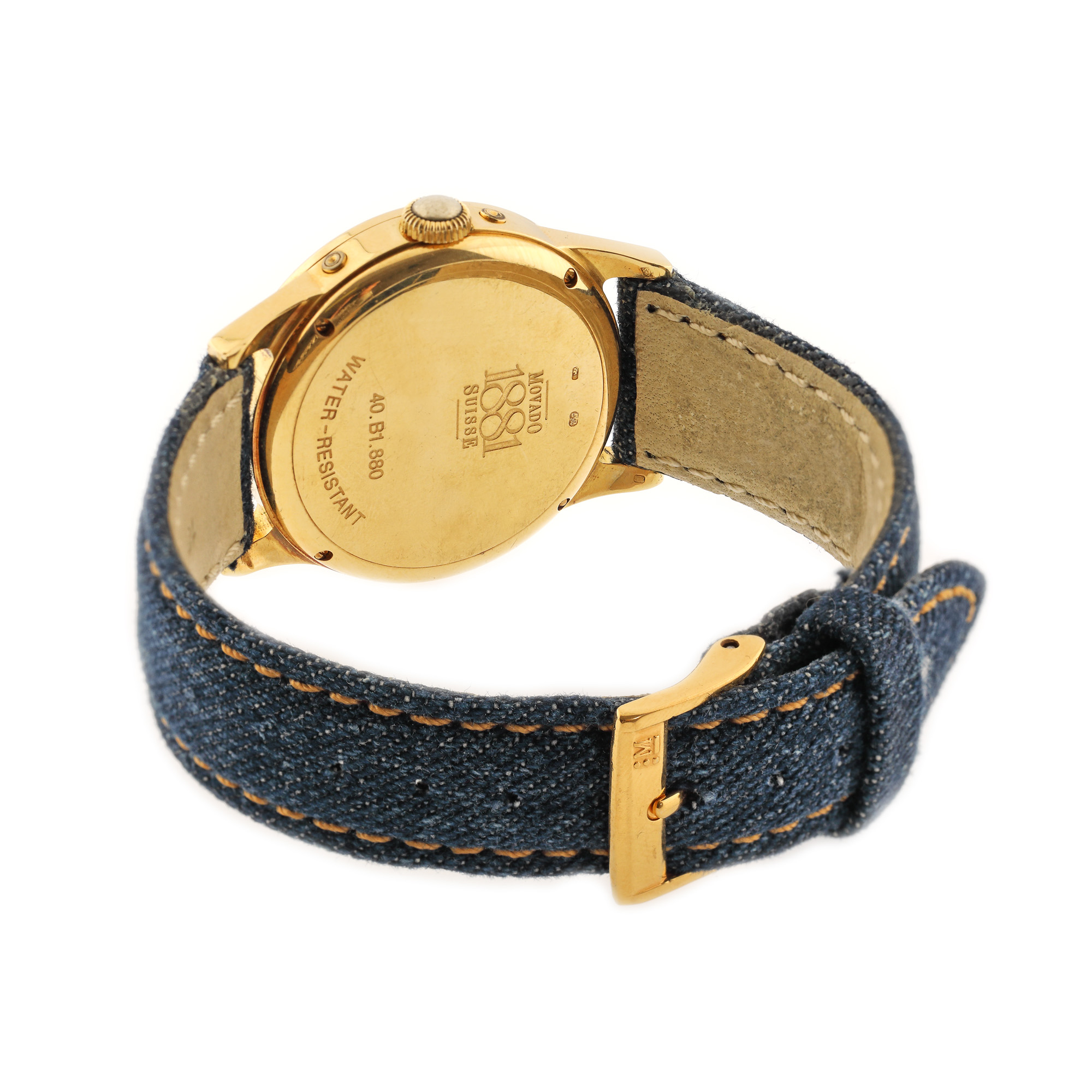 Ceas Movado 1881 Calendomatic Commemorative, din aur, de mână, unisex, referință 40.B1.880, mecanism automatic, calibru 2892A. Cadran de culoare crem, cu numerale arabe și indici orari din aur, registru pentru lună și zi. Curea din denim, de culoare albastră și cataramă, înlocuite aftermarket.