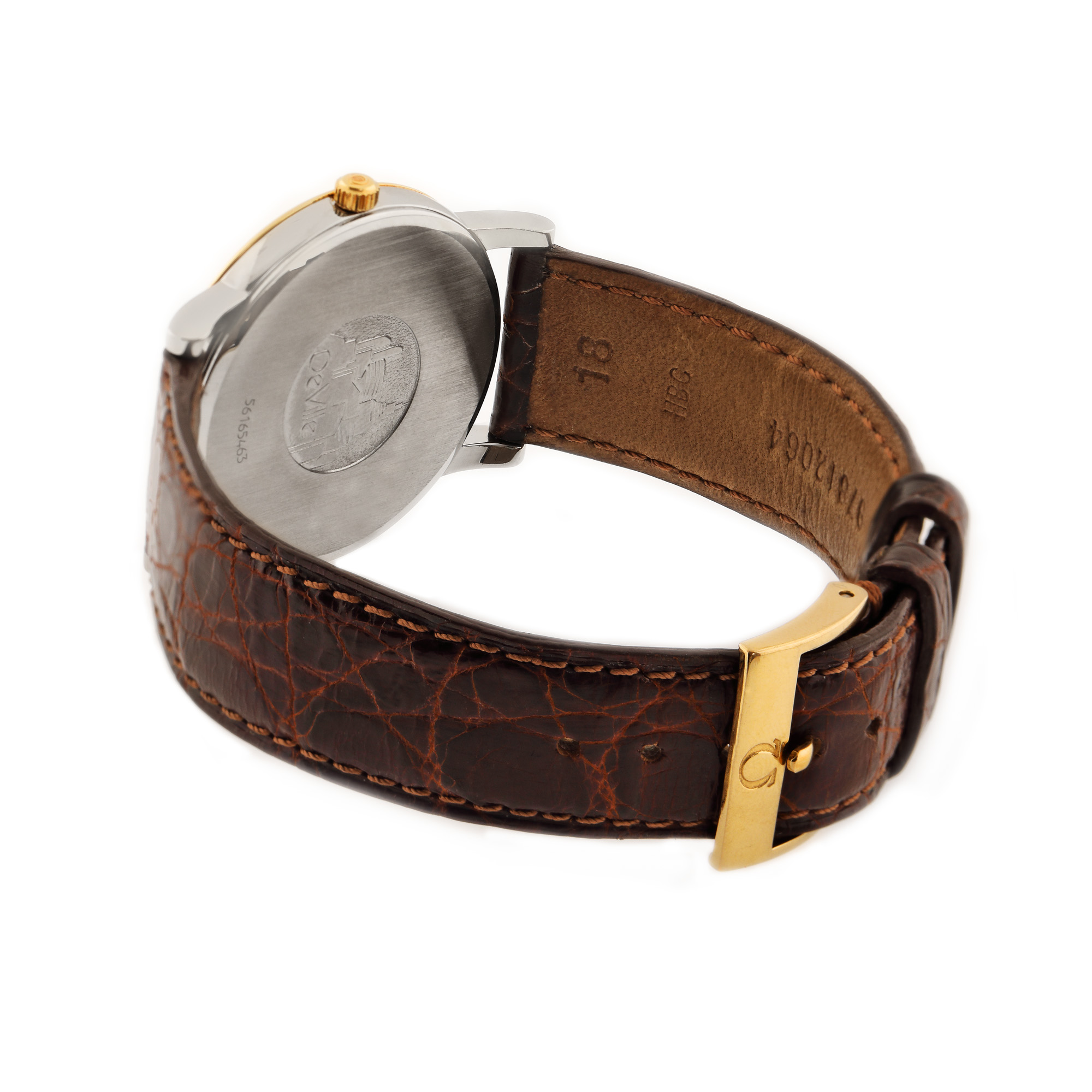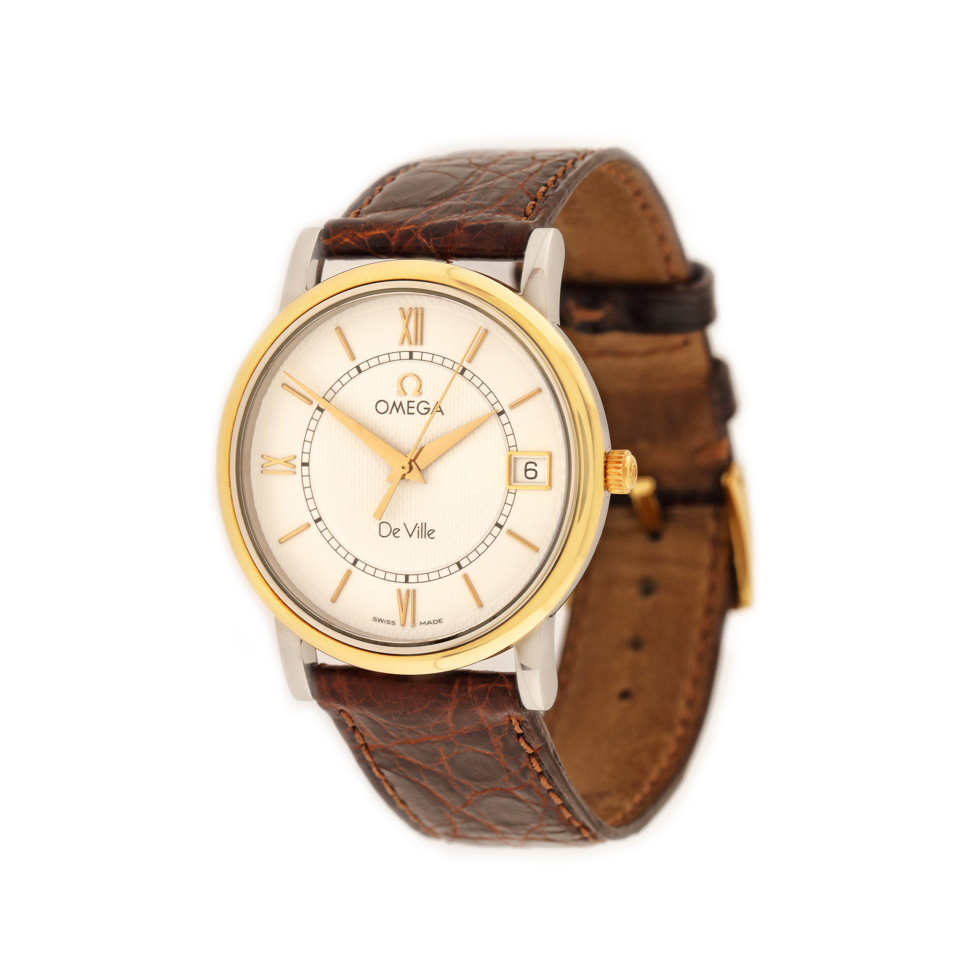 Ceas Omega DeVille, de mână, de damă, referință 196.2532, mecanism quartz, calibru 1532. Cadran de culoare alb, cu numerale romane și registru pentru dată în dreptul orei 3. Curea din piele, de culoare maro și cataramă din oțel inoxidabil, originale.