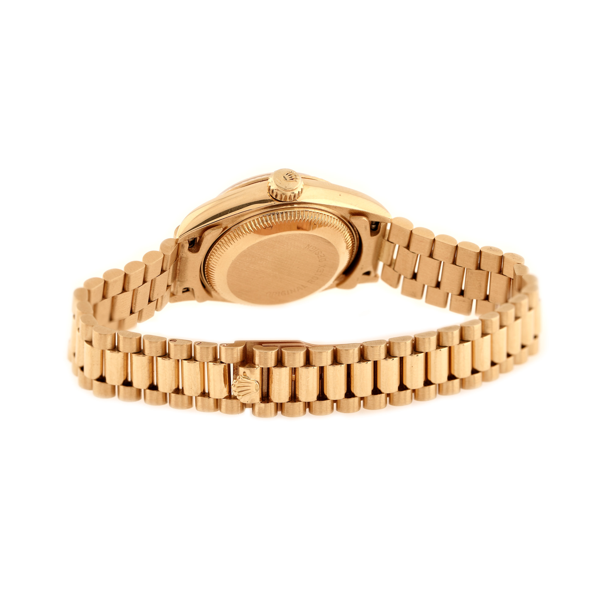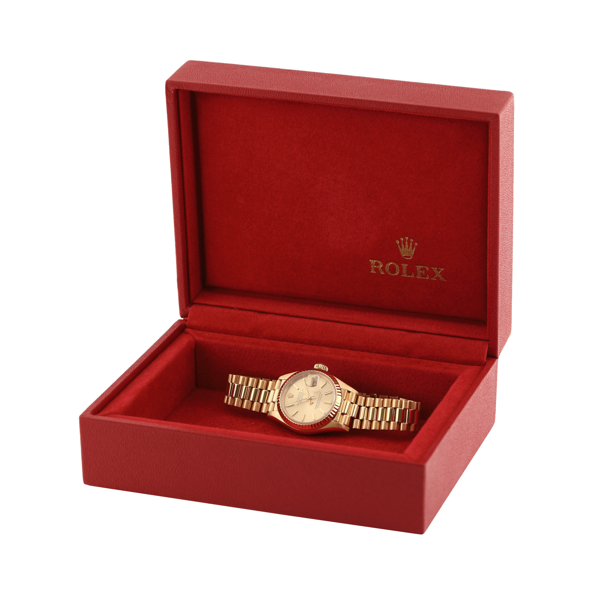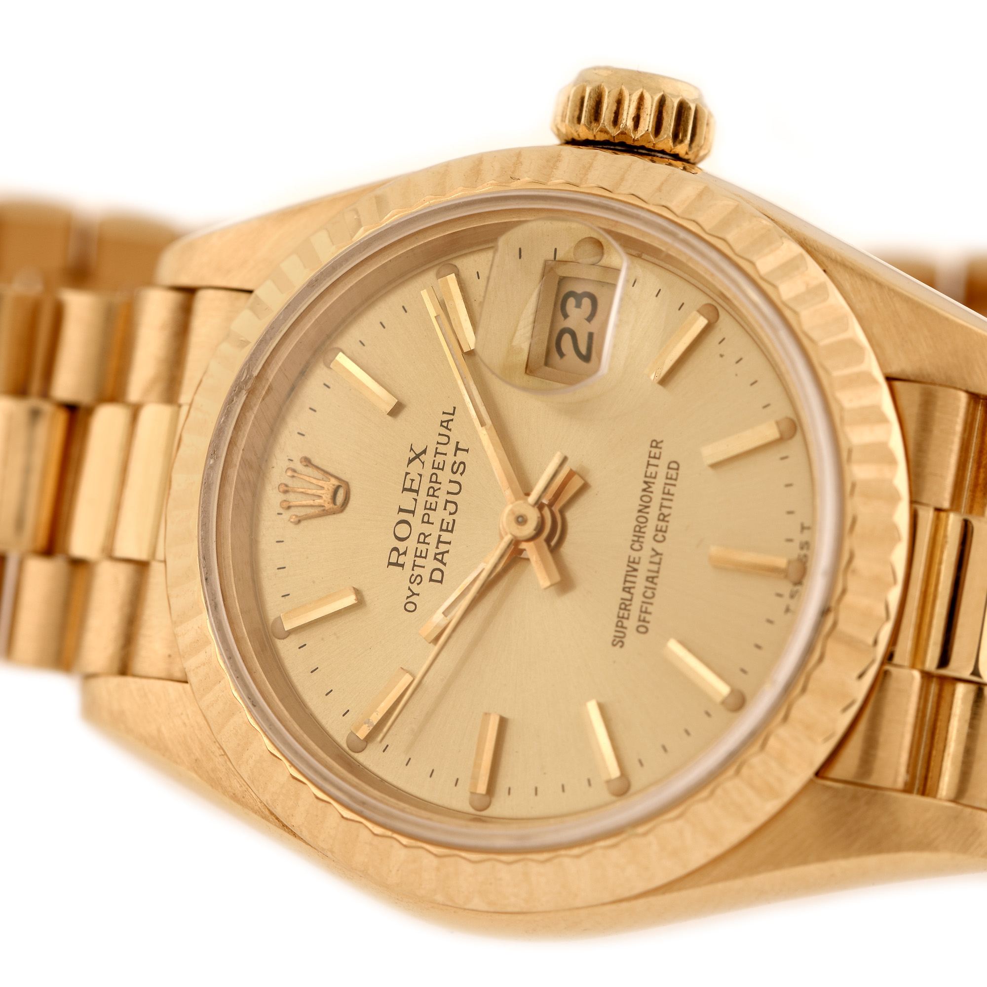 Ceas Rolex DateJust din aur, de mână, de damă, însoțit de cutia originală, referință 69178, mecanism automatic, calibru 2135. Cadran "tritium" de culoare auriu, cu dată și lupă în dreptul orei 3. Accesorii: cutia originală, manual de utilizare.