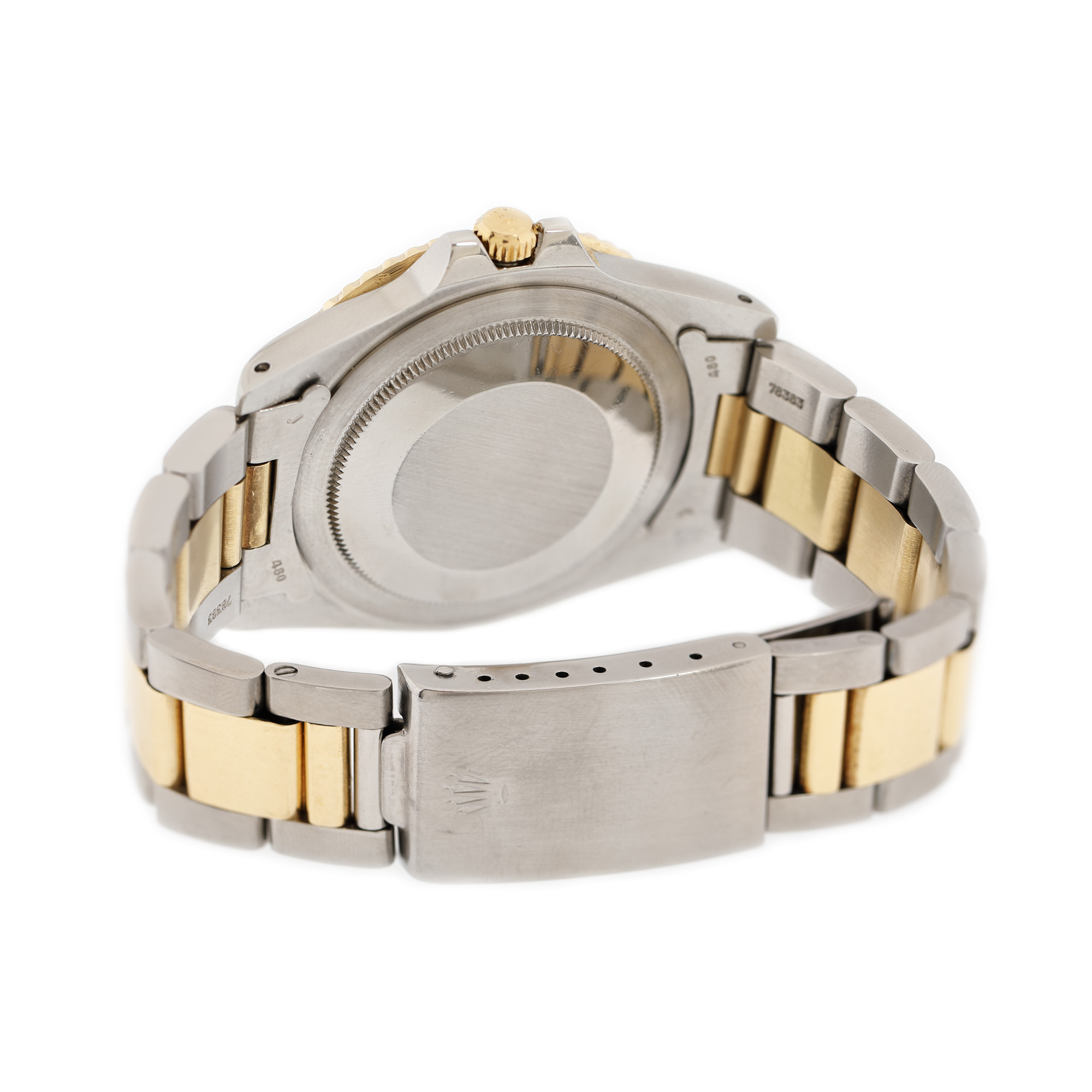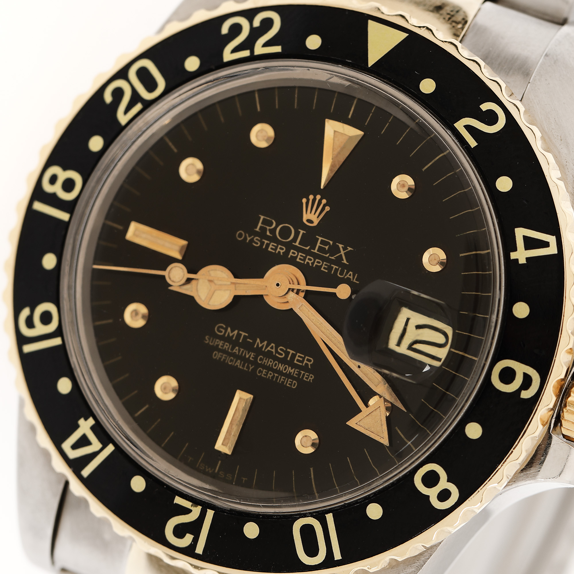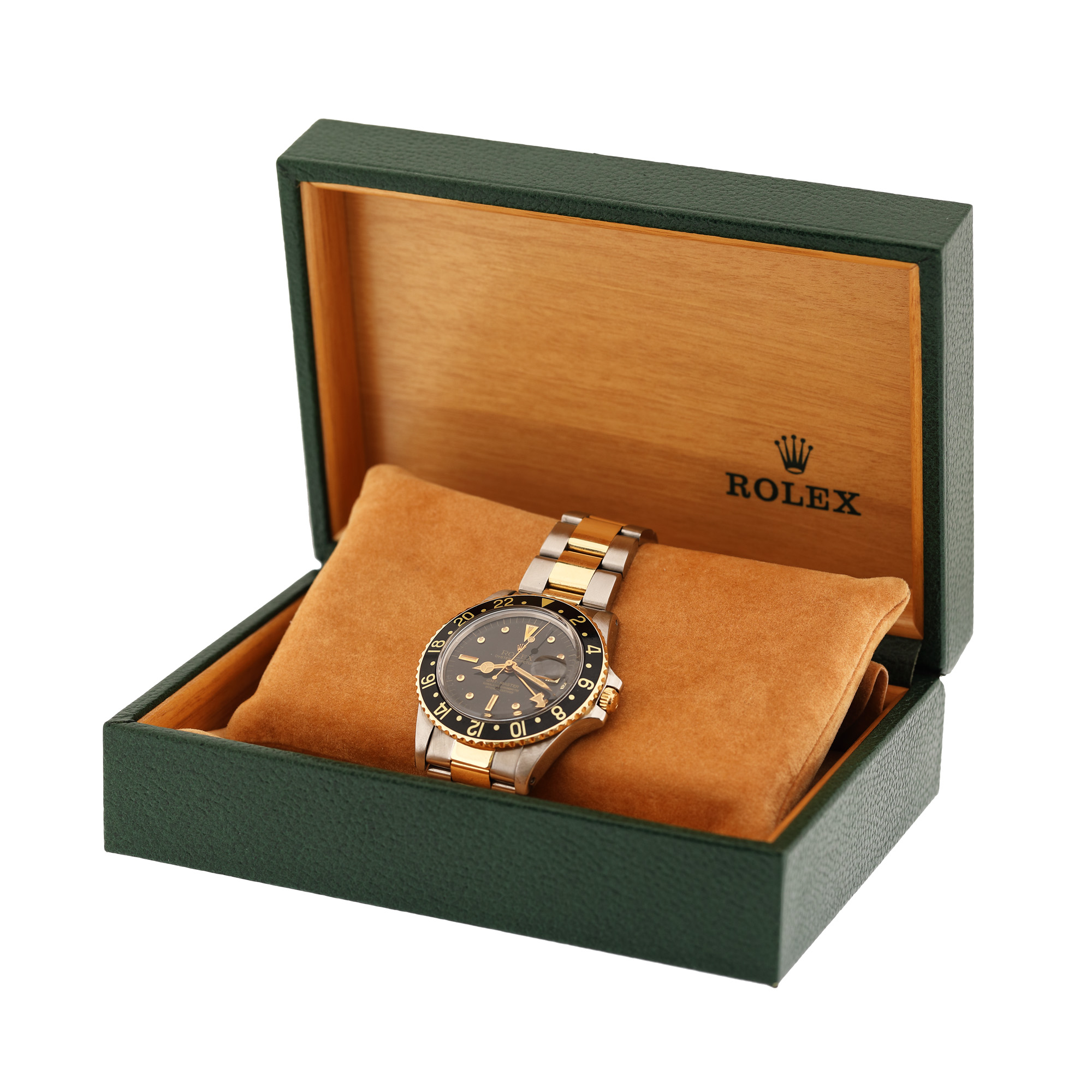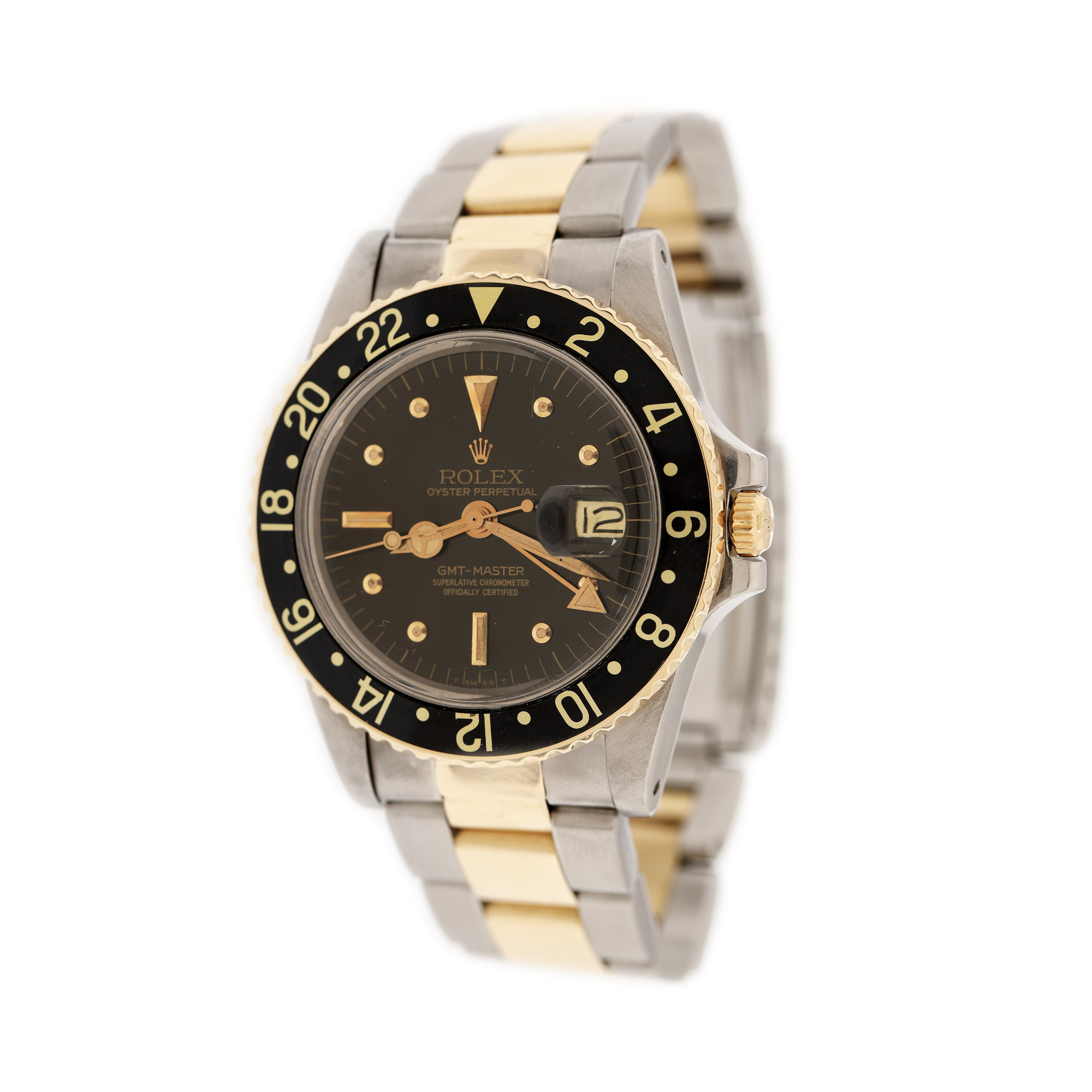 Ceas Rolex GMT Master, de mână, bărbătesc, referință 1675. Cadran ”nipple dial”, de culoare negru, bezel rotativ unidirecțional și dată cu lupă în dreptul orei 3. Brățară din aur și oțel inoxidabil, originală. Accesorii: cutia originală; manual de utilizare, portofel original pentru manual