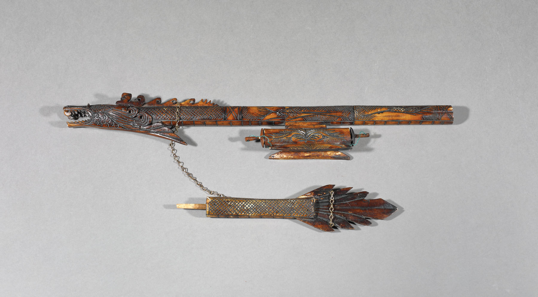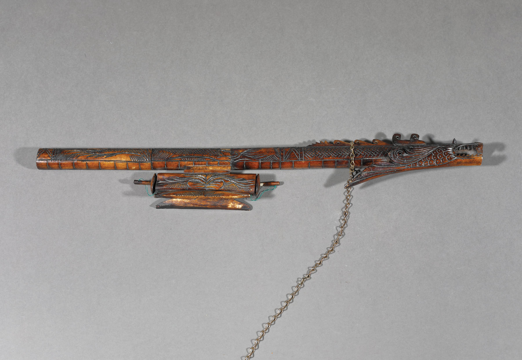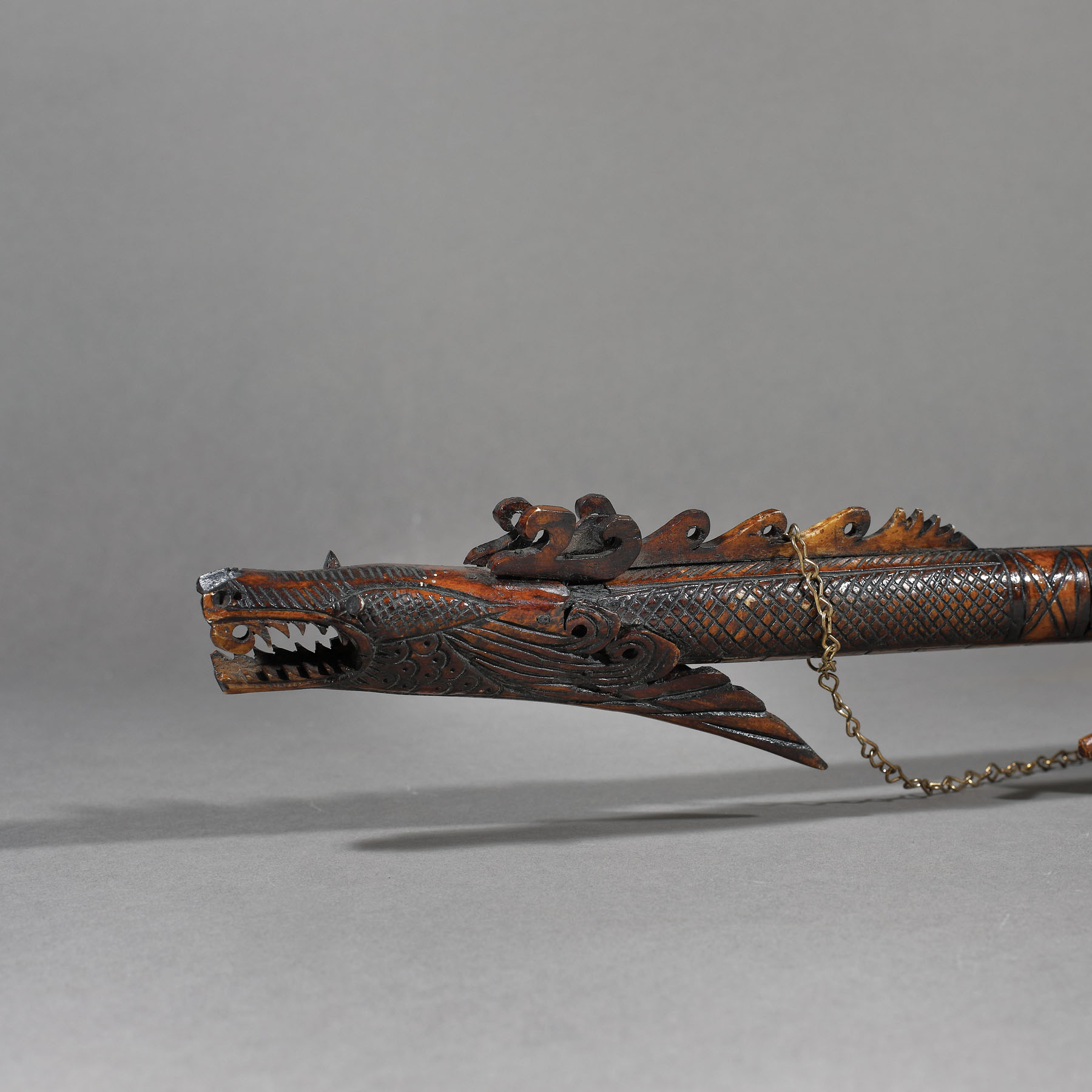 32. Sarbacana tradițională din lemn exotic, decorată cu un dragon, Indonezia, începutul sec. XX