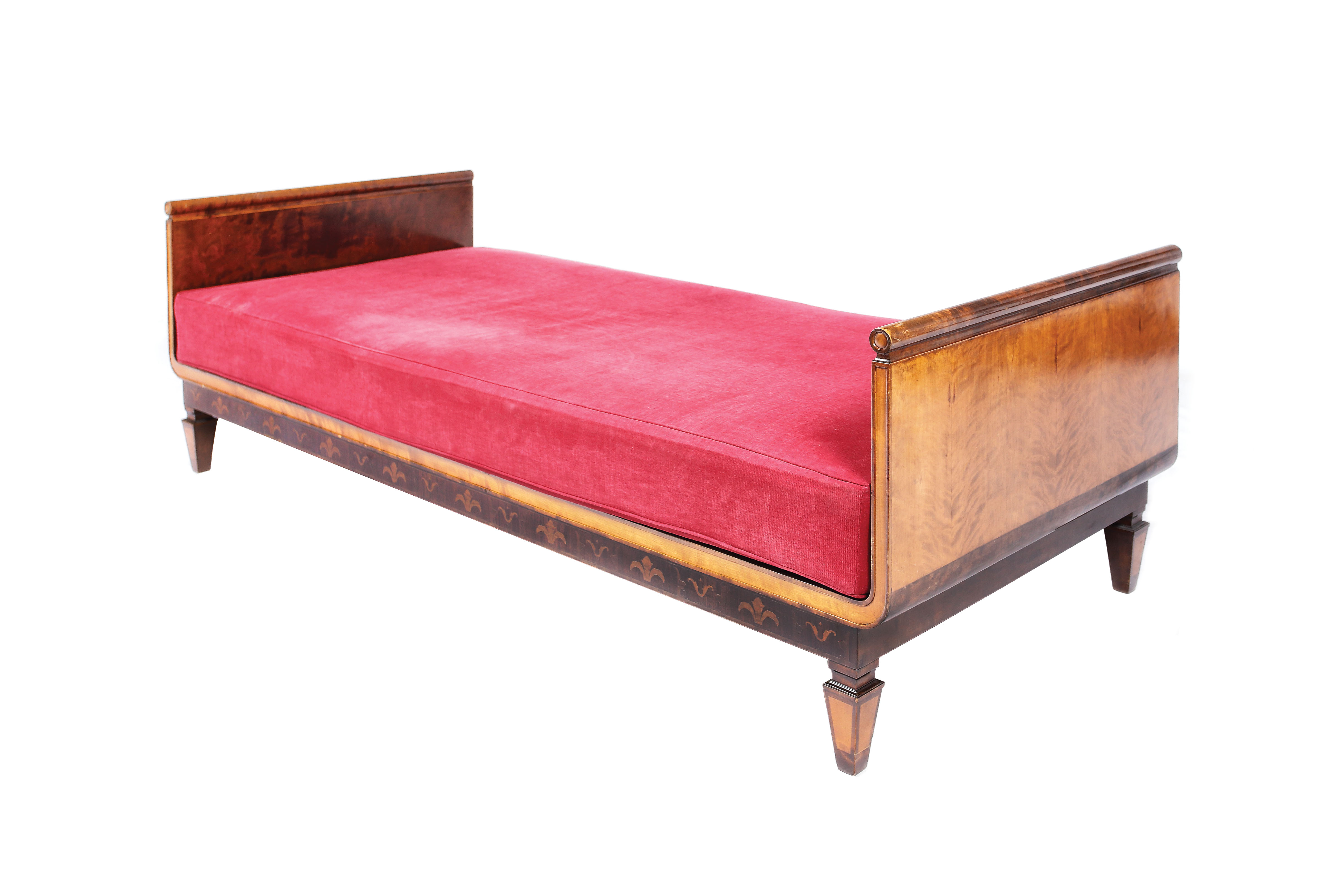53. Canapea în manieră Charles X, cu marchetărie florală, din lemn de nuc, prima jumătate a sec. XX