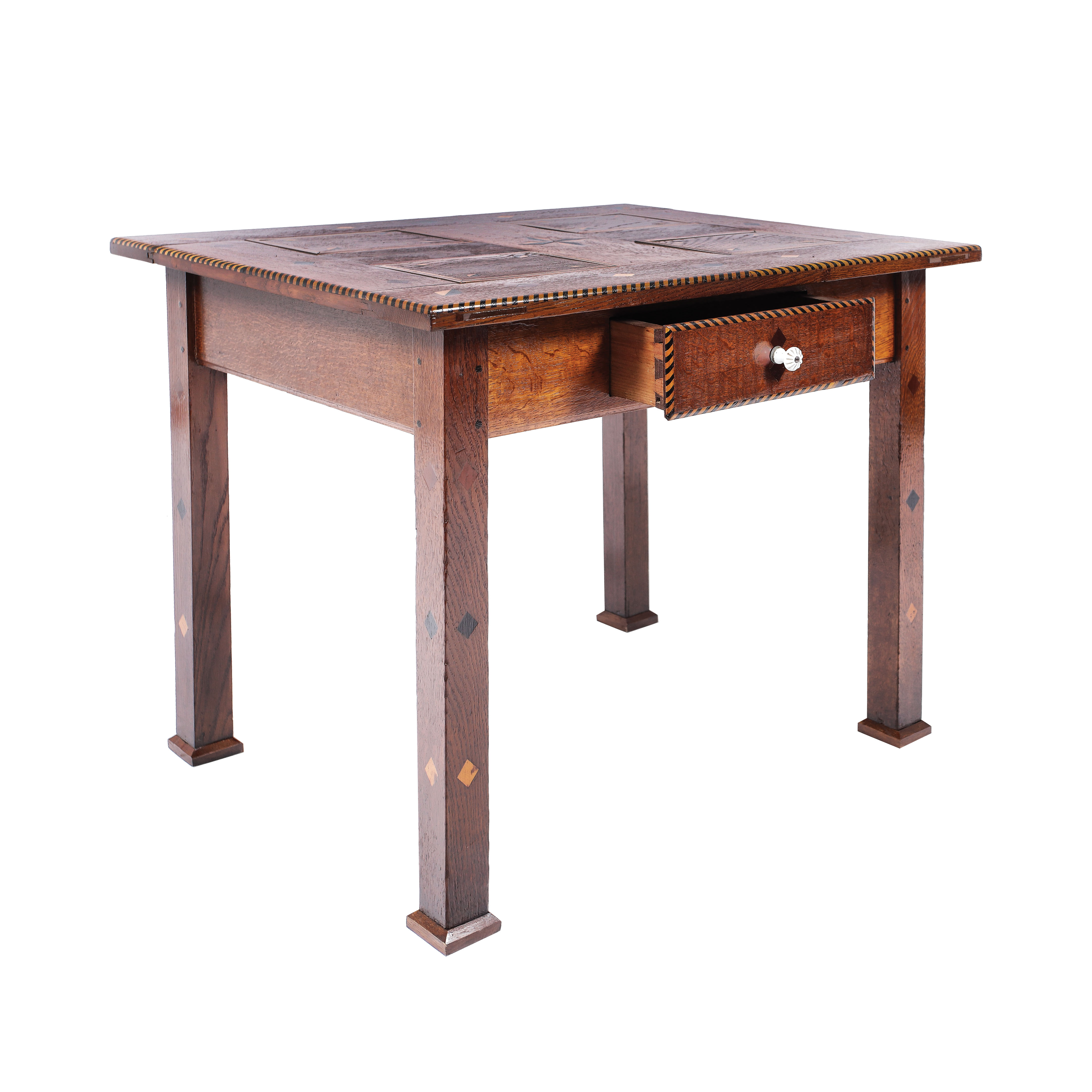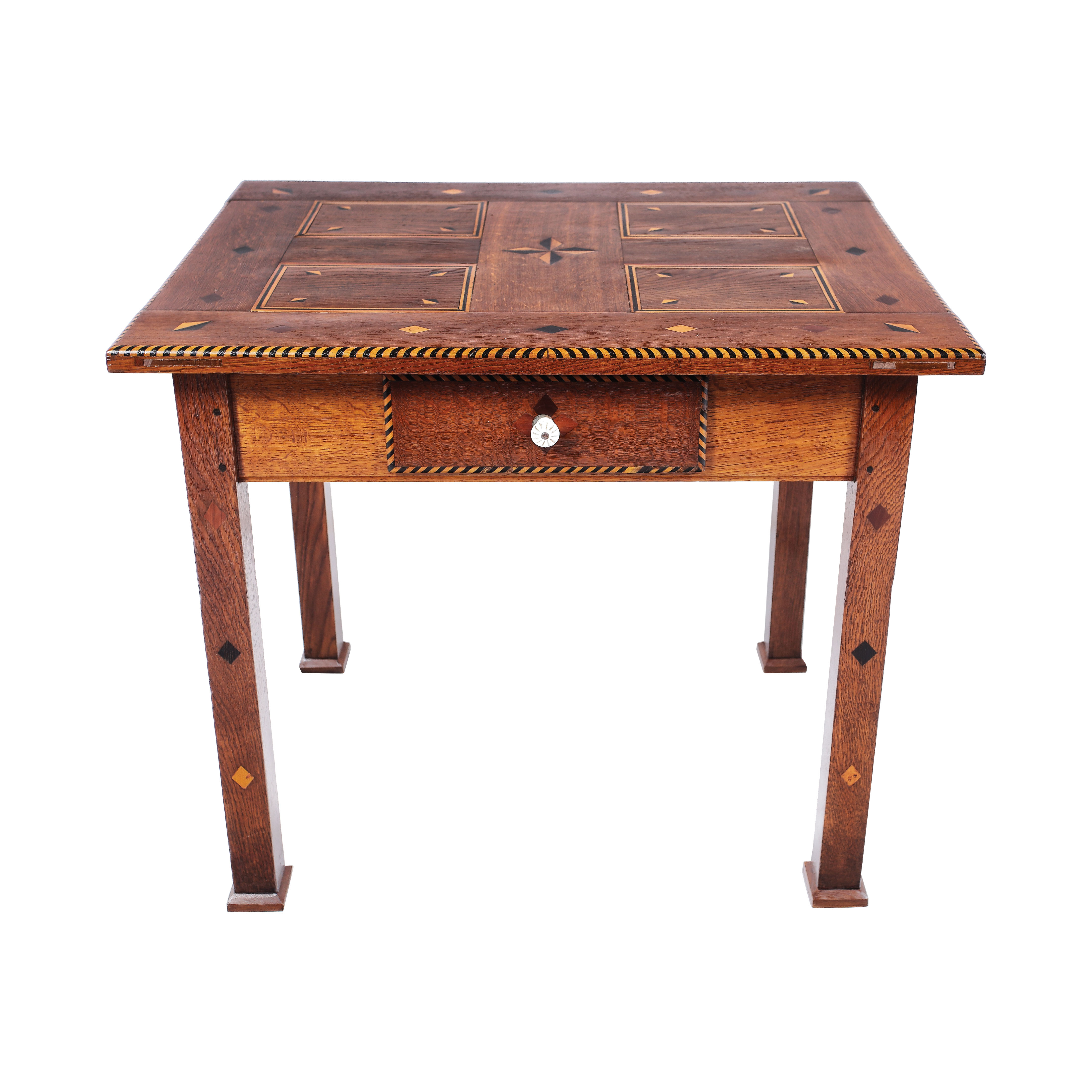 65. Masă din lemn de stejar, marchetată cu romburi policrome și sertar la centură