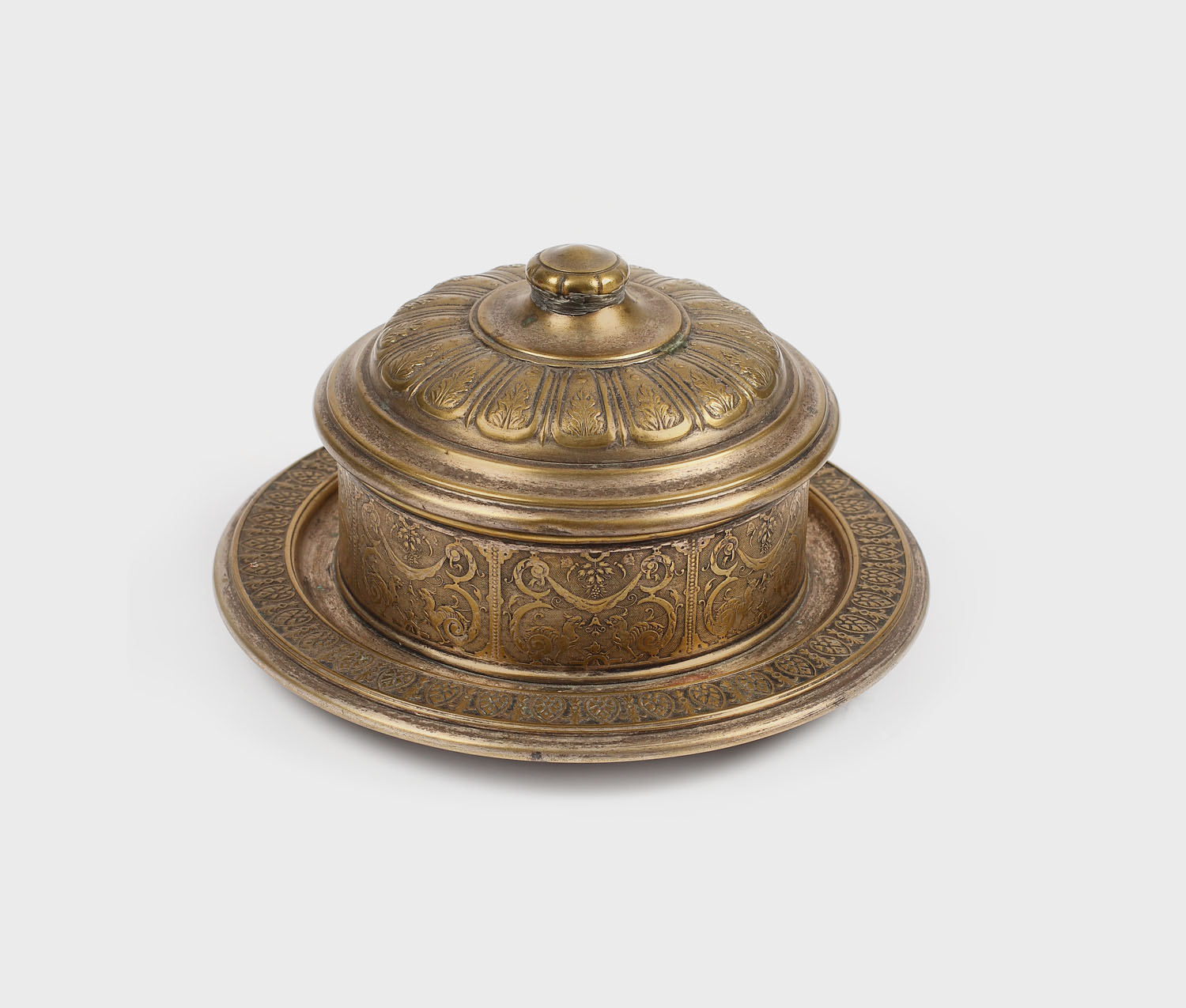 40. Bombonieră din alamă, cu decoraţiuni cu palmete, aparţinând arhitectului Theodora Dinulescu