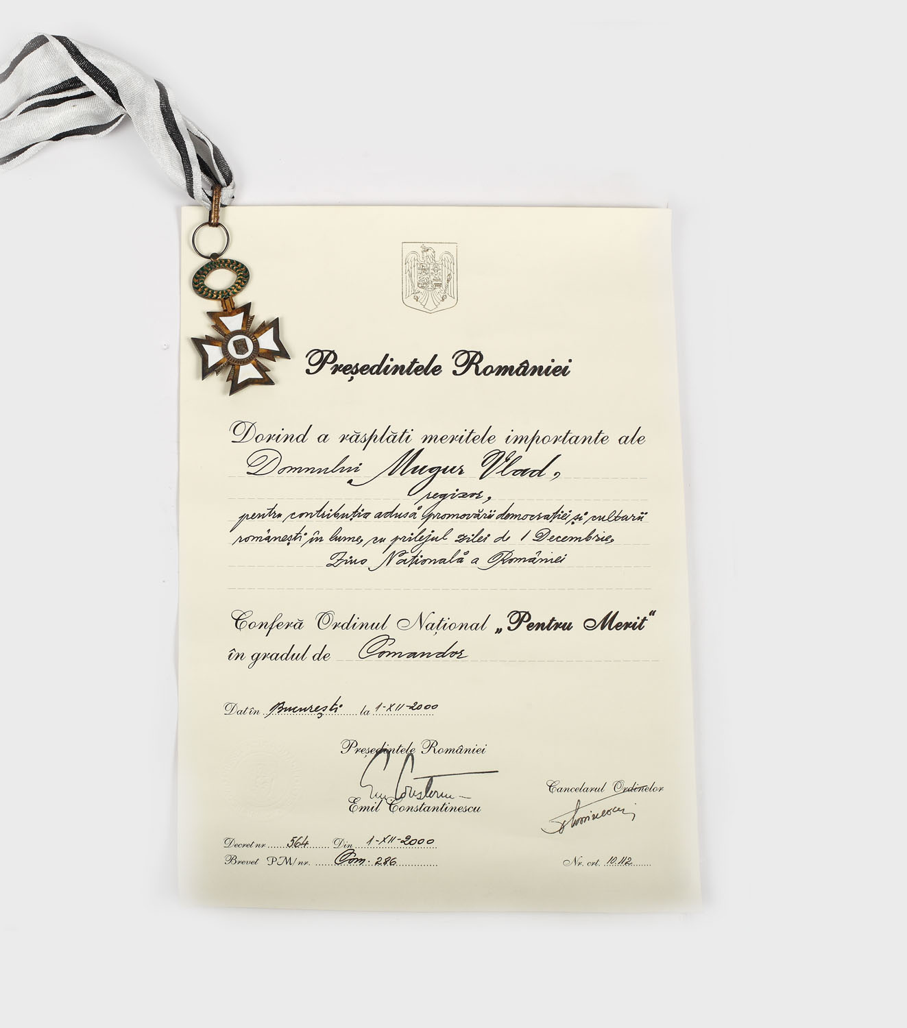 43. Ordinul naţional "Pentru Merit" în grad de Comandor oferit regizorului Vlad Mugur în anul 2000 de preşedintele României, Emil Constantinescu