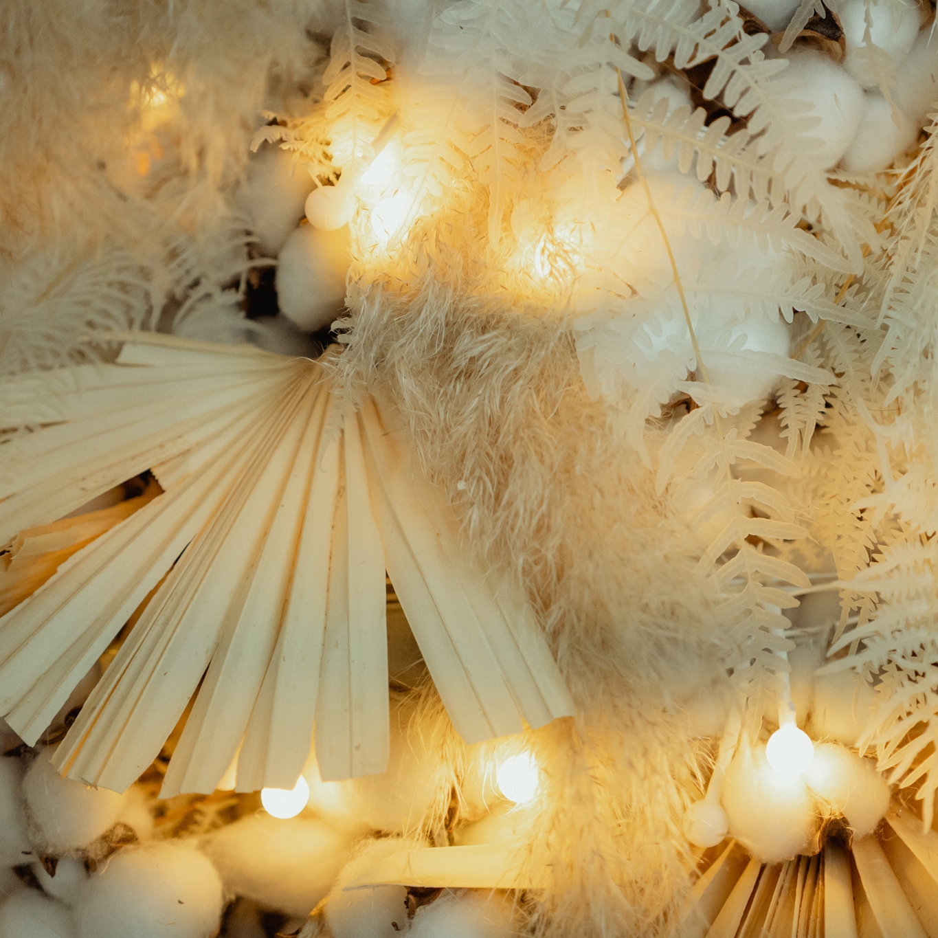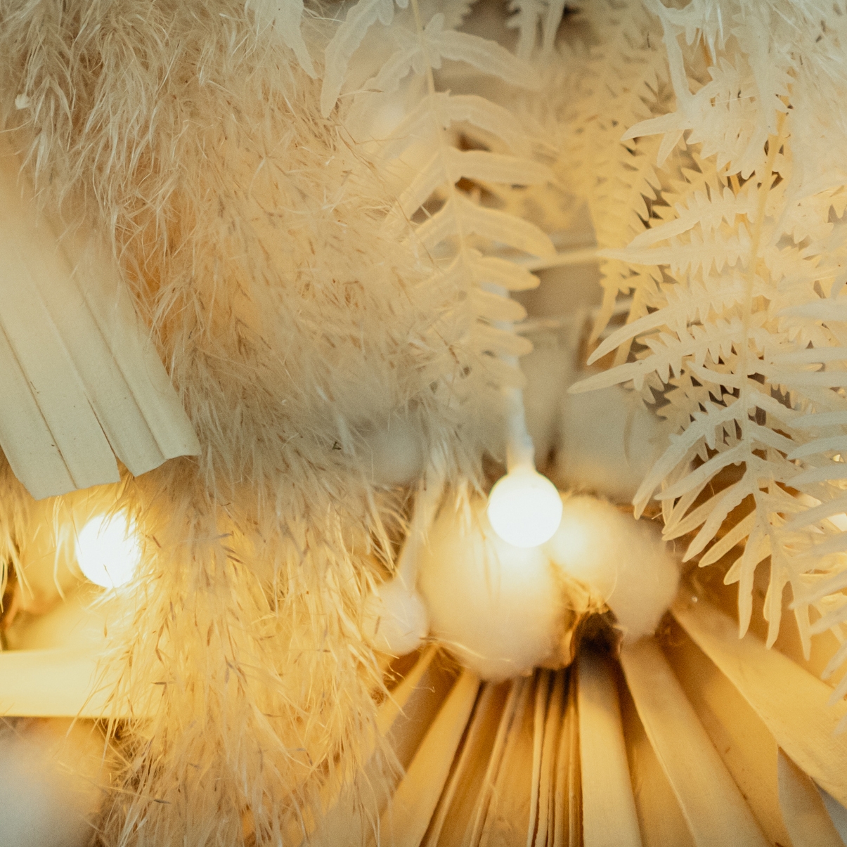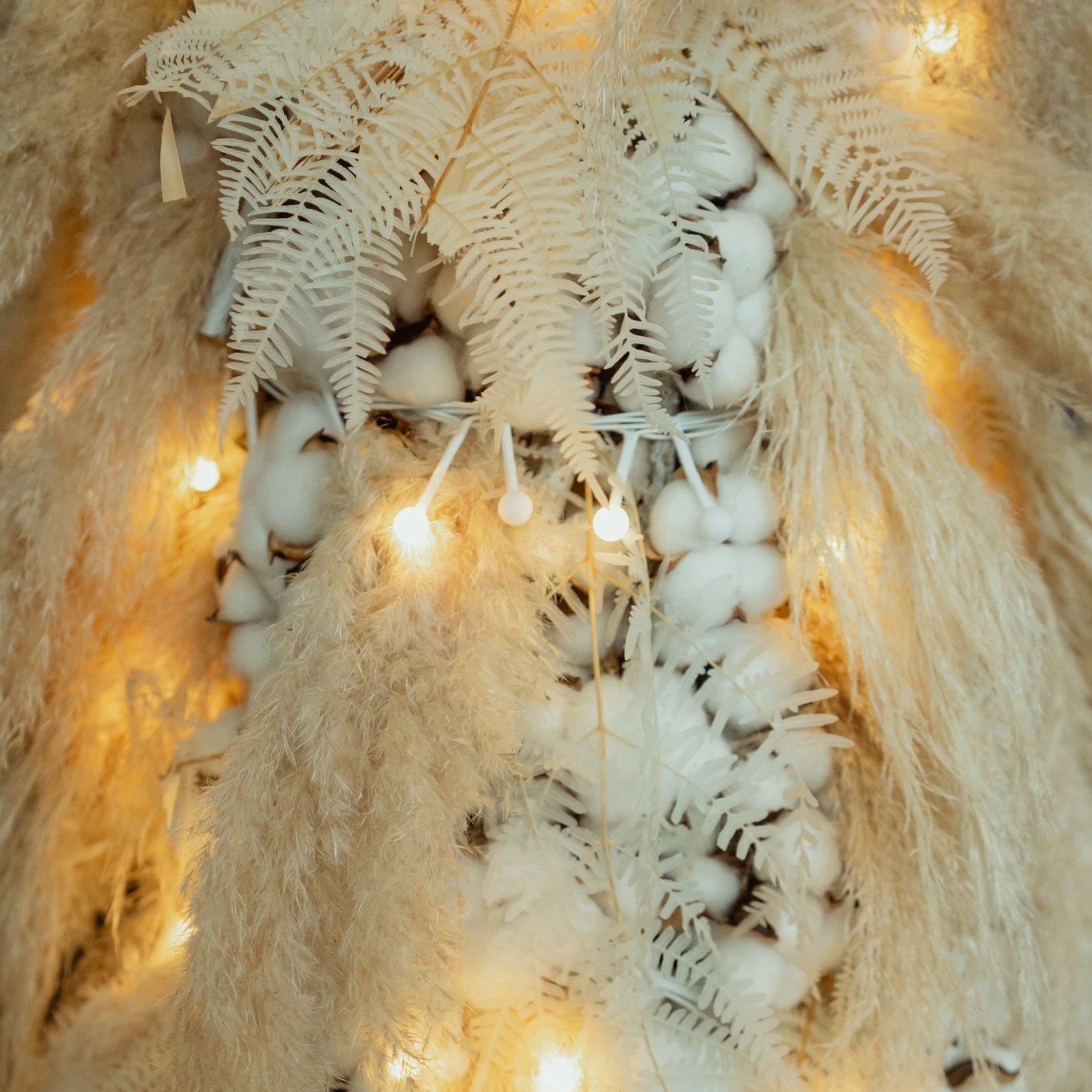 pampas, bumbac și frunze de palmier lipite pe structură metalică