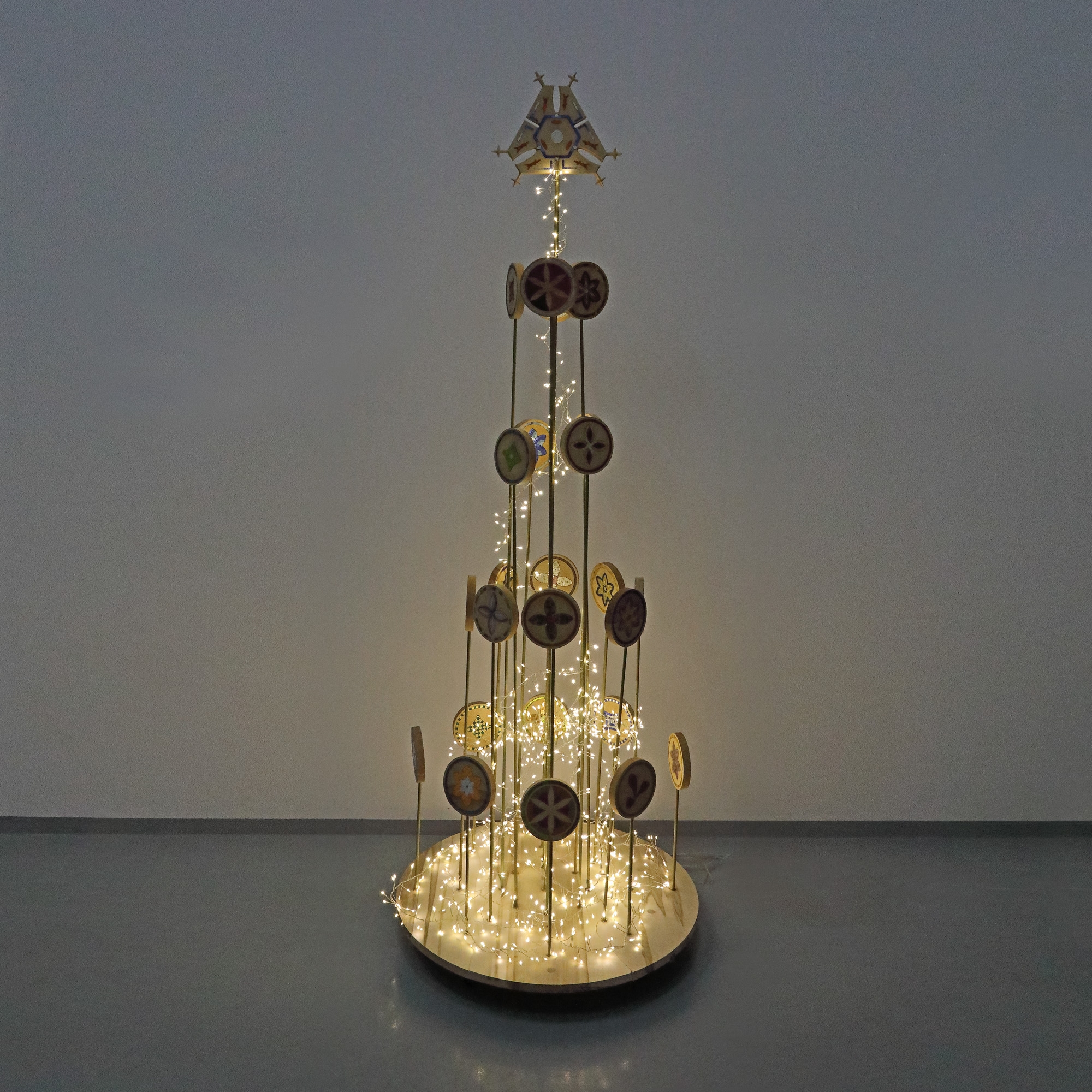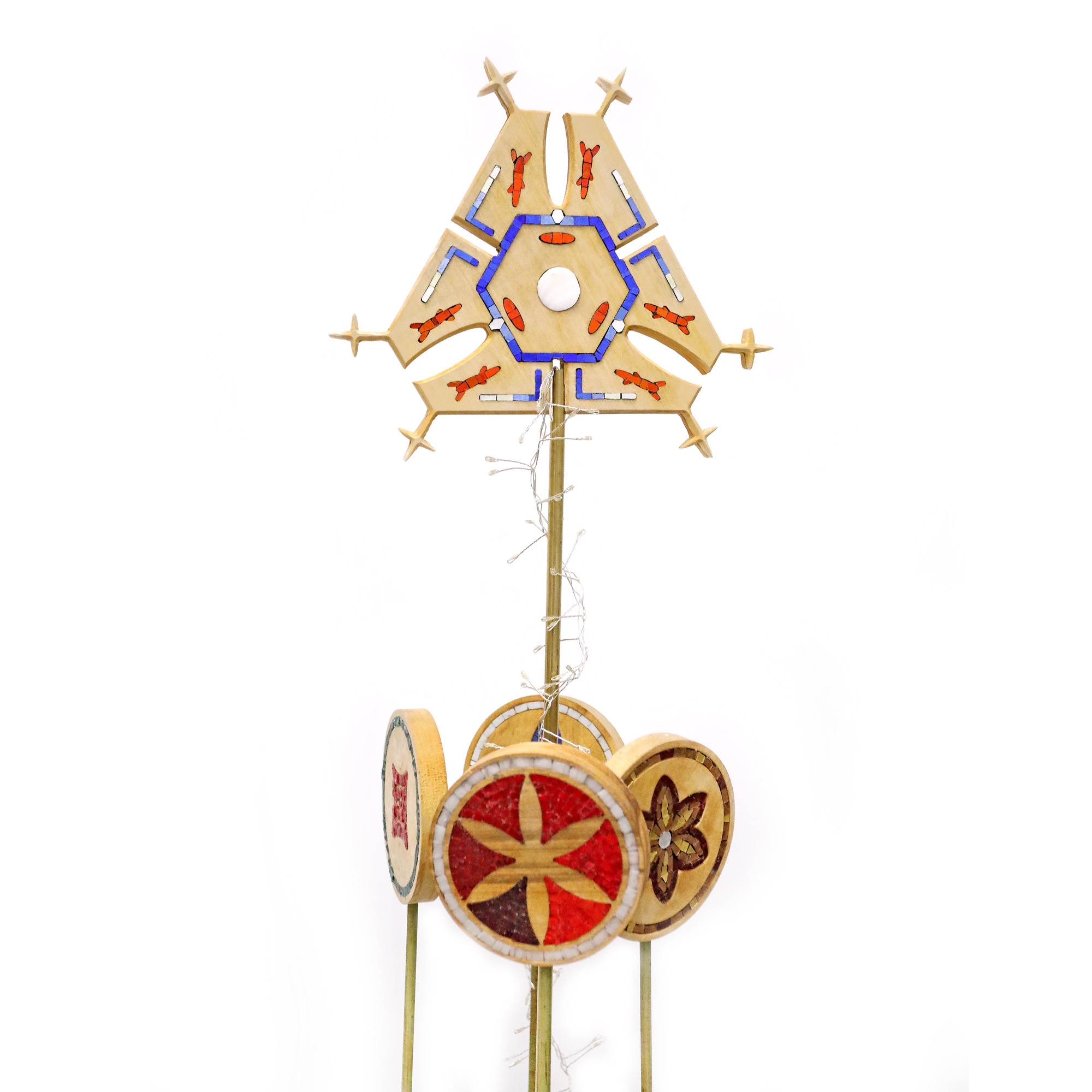 mozaic din smalț venețian și aur 24 de karate de diferite culori intarsiate în lemn de tei și montate pe suport de alamă