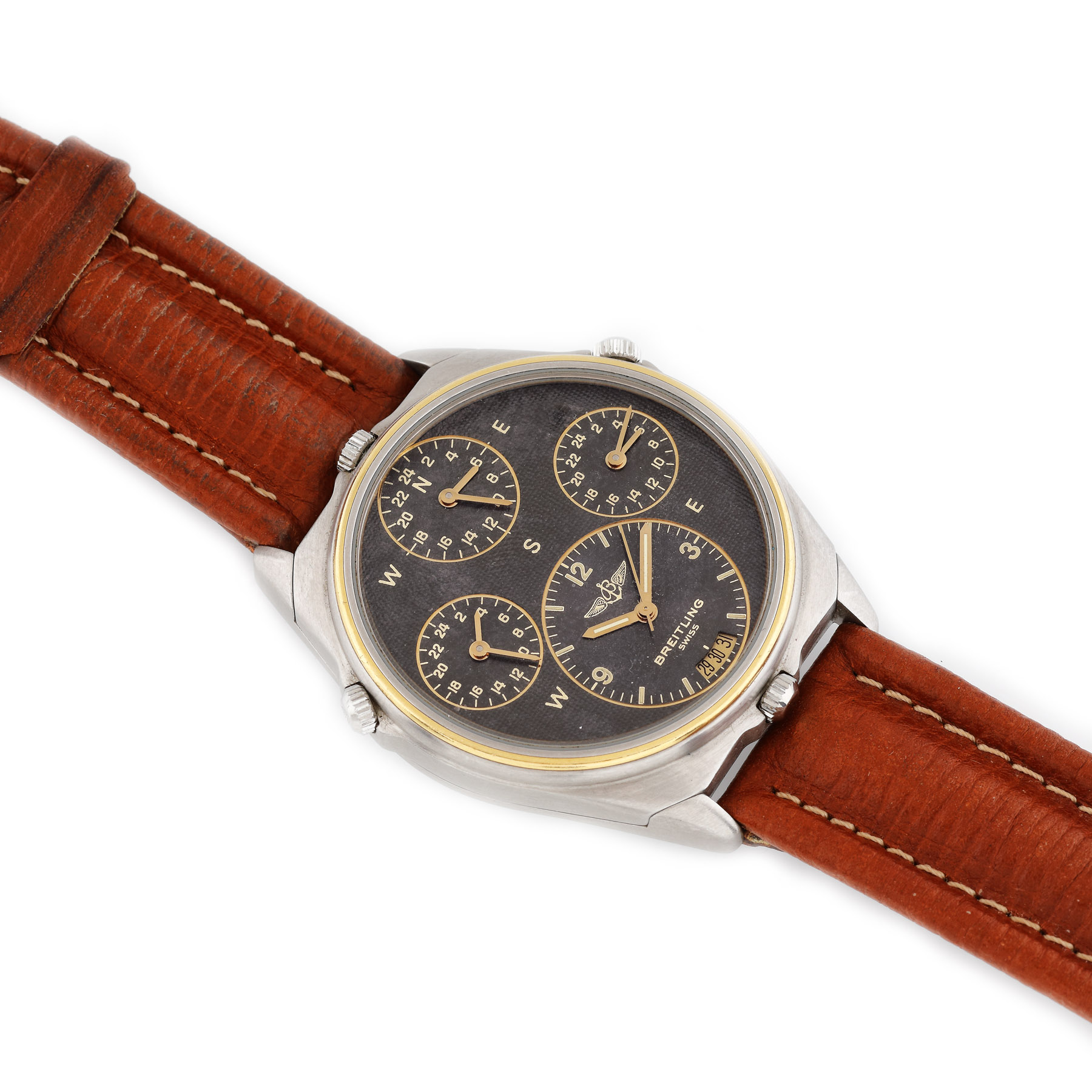 Ceas Breitling WorldTime din aur și oțel, de mână, bărbătesc, referință: 80840. Ceasul dispune de patru mecanisme quartz independente. Cadran de culoare gri, cu patru registre, fiecare indicând câte un fus orar. Curea din piele, de culoare maro.