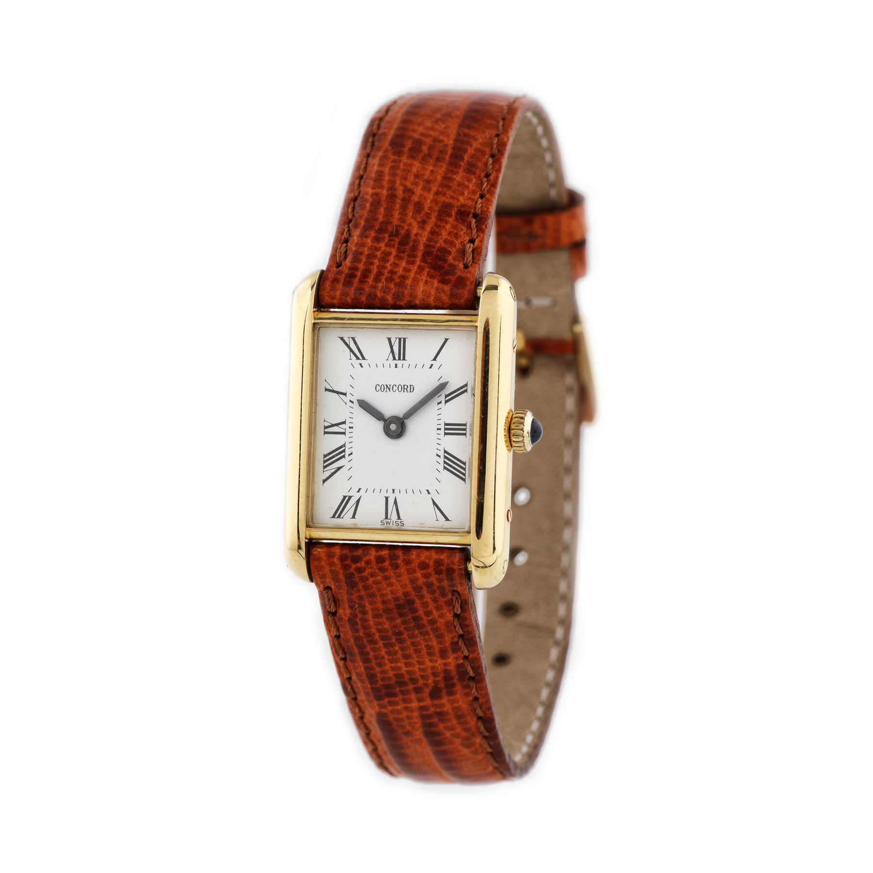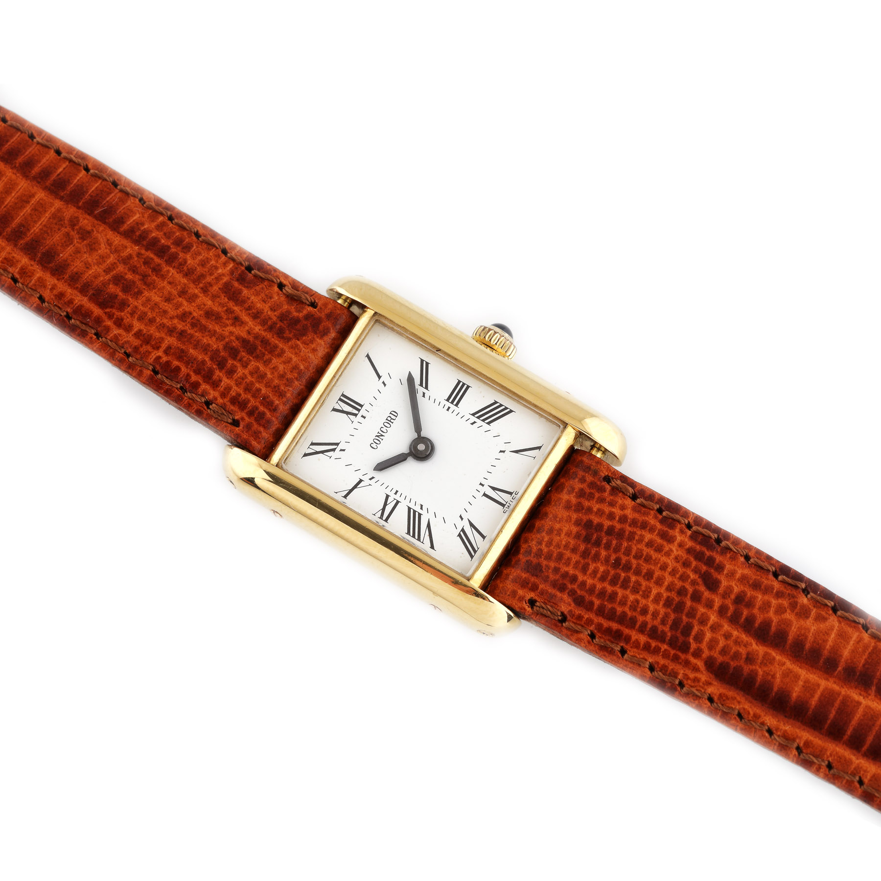 Ceas Concord din aur, de mână, de damă. Mecanism cu armare manuală. Cadran tip square de culoare albă, decorat cu cifre romane. Curea din piele de culoare maro.