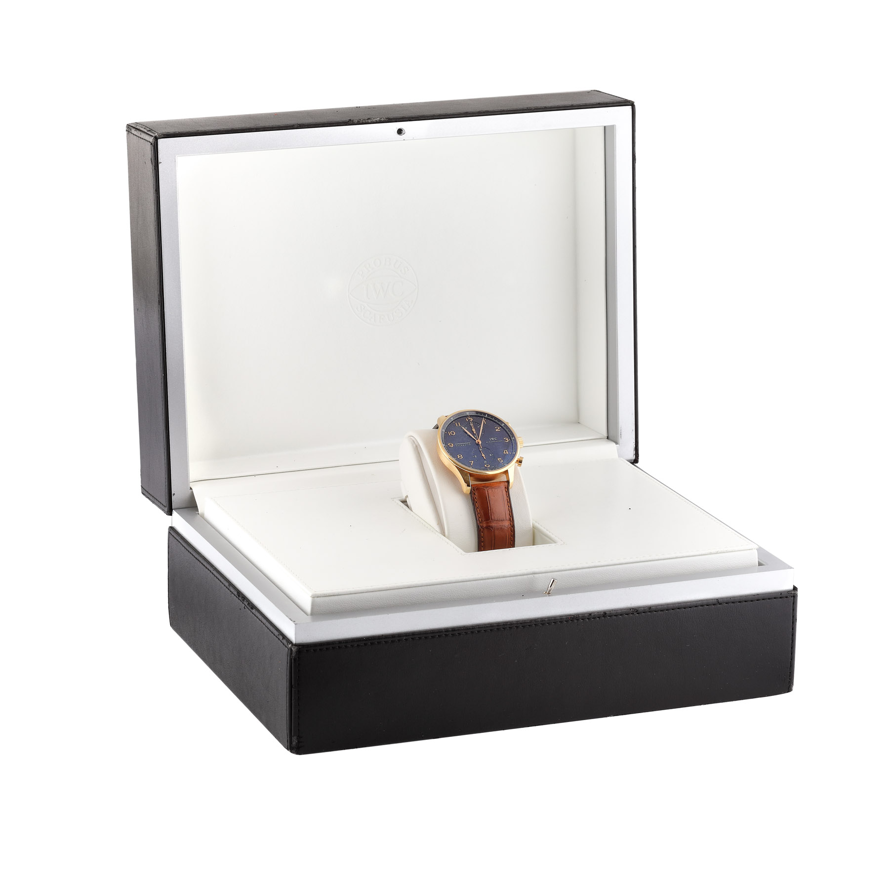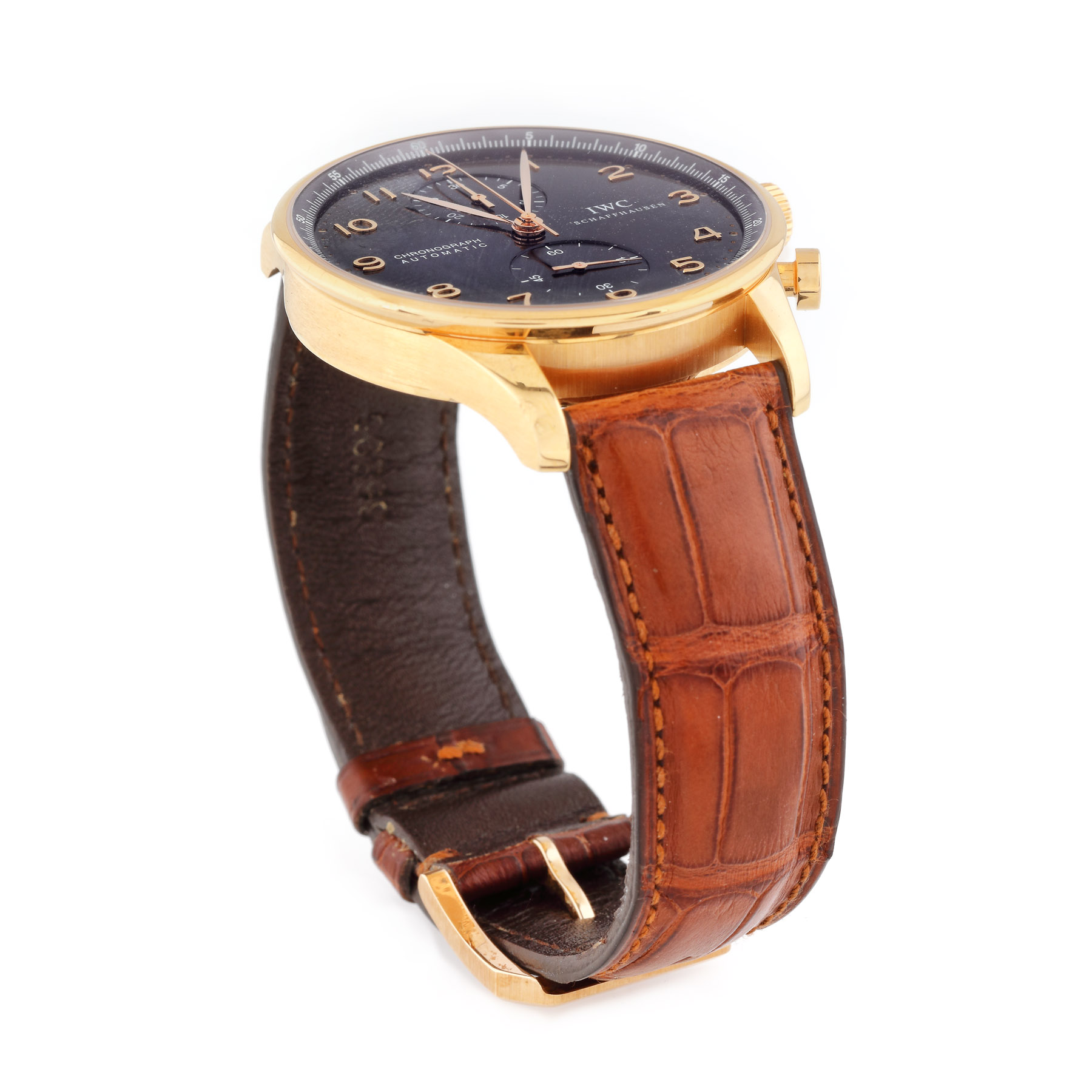 Ceas IWC Portuguese din aur roz, de mână, bărbătesc, referință: IW371415. Mecanism automatic chronograph, calibru: 79350. Cadran de culoare negru cu cifre arabe și două registre la ora 12 și ora 6. Curea din piele de crocodil de culoare maro și cataramă din aur roz. Ceasul vine însoțit de cutia originală și actele de proveniență.