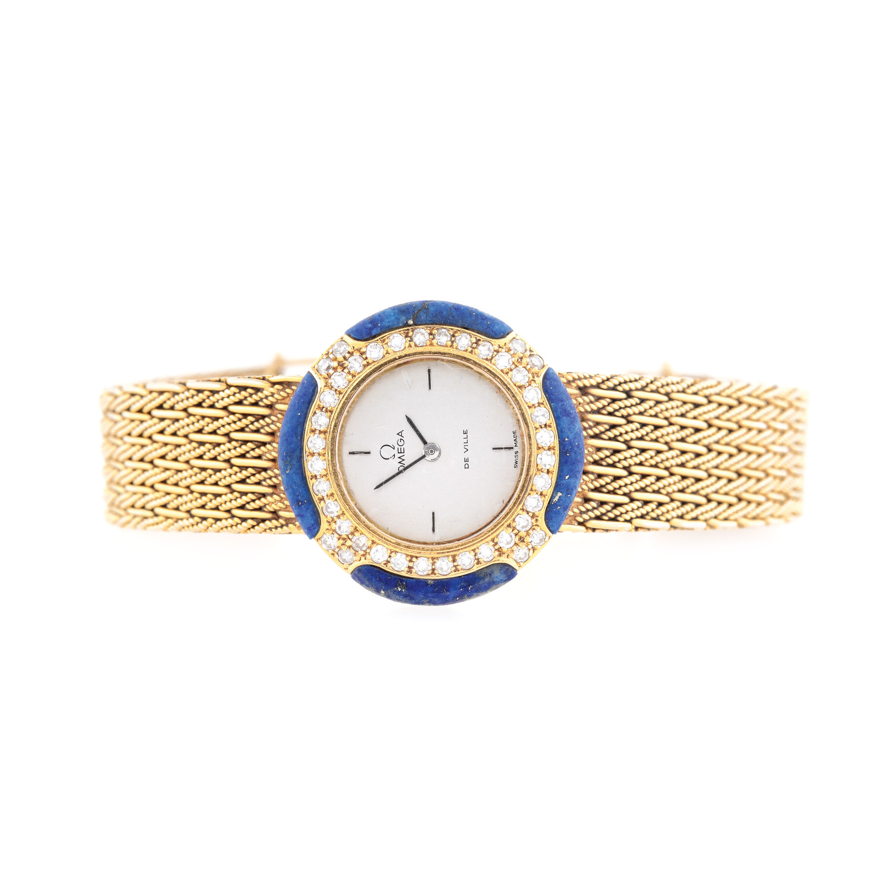 8. Ceas Omega De Ville din aur, de mână, de damă, cu bezelul ornat cu diamante și Lapis Lazuli [Cca. 1980]