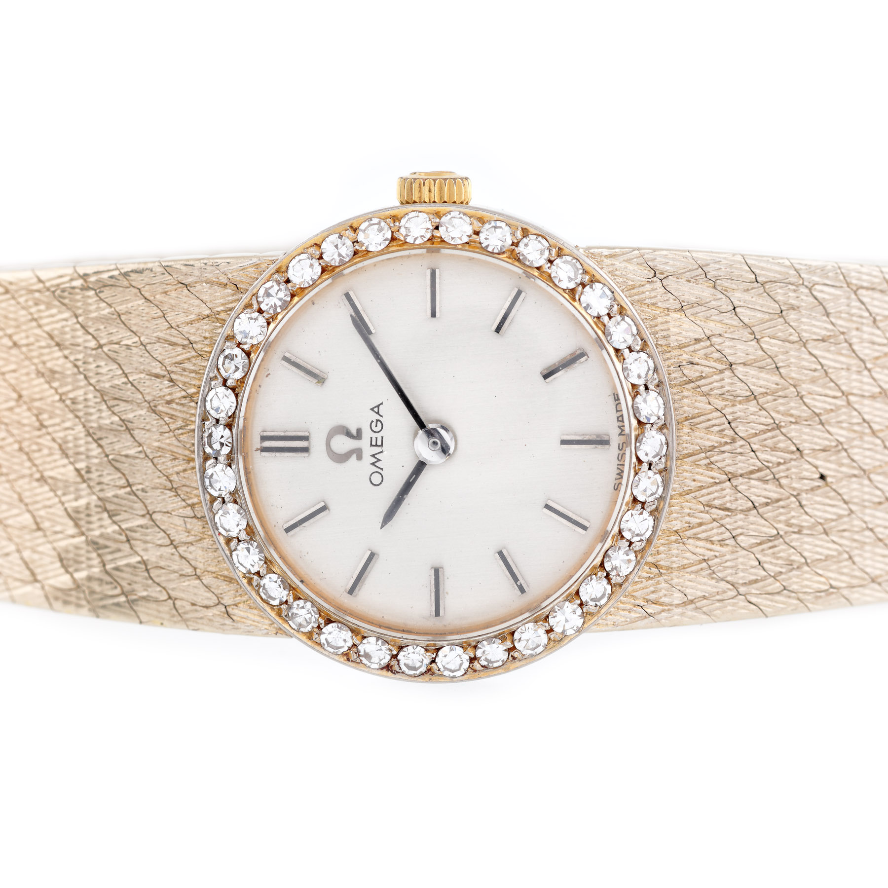 Ceas Omega din aur alb, de mână, de damă, cu bezelul ornat cu diamante. Mecanism cu armare manuală. Cadran de culoare argintiu.