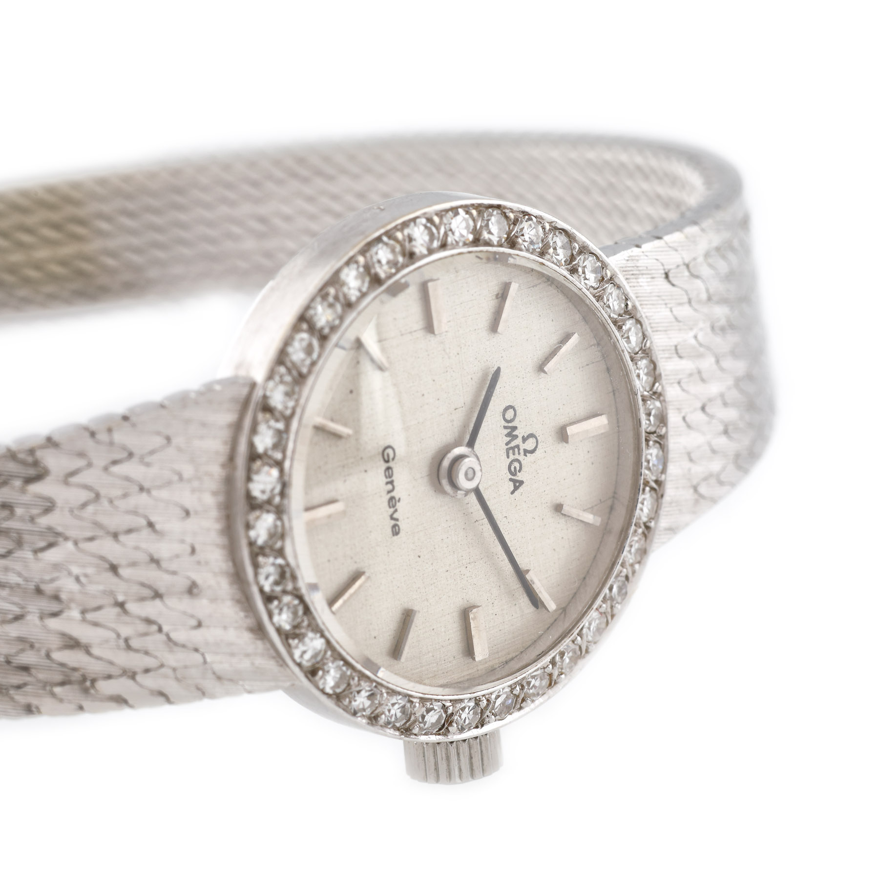 18. Ceas Omega Genève din aur alb, de mână, de damă, cu bezelul decorat cu diamante [Cca. 1980]