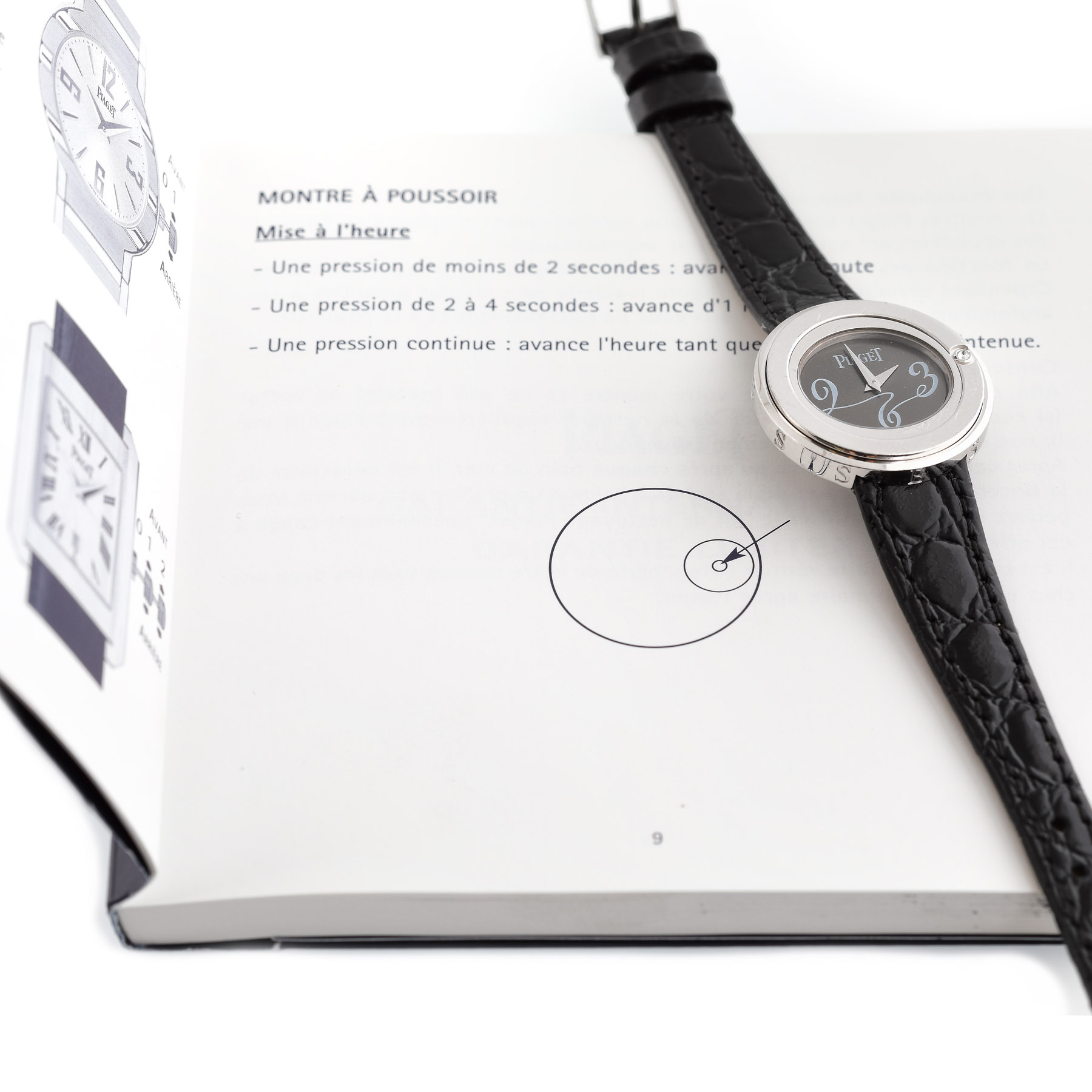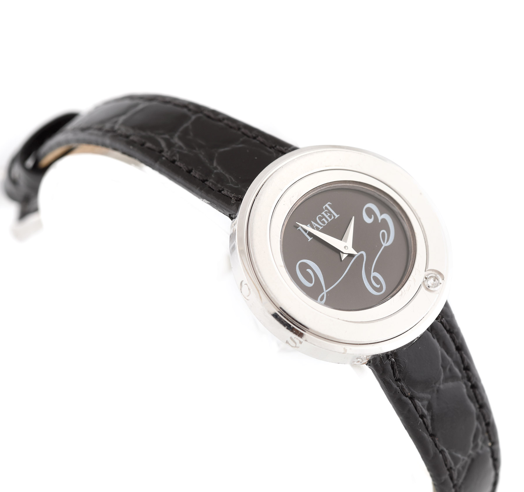 Ceas Piaget Possession din aur alb, de mână, de damă, decorat cu un diamant singular. Referința: P10275, mecanism quartz. Cadran de culoare gri, bezel mobil rotativ, decorat cu un diamant. Curea din piele de culoare negru. Vine însoțit de cutia originală și actele de proveniență.
