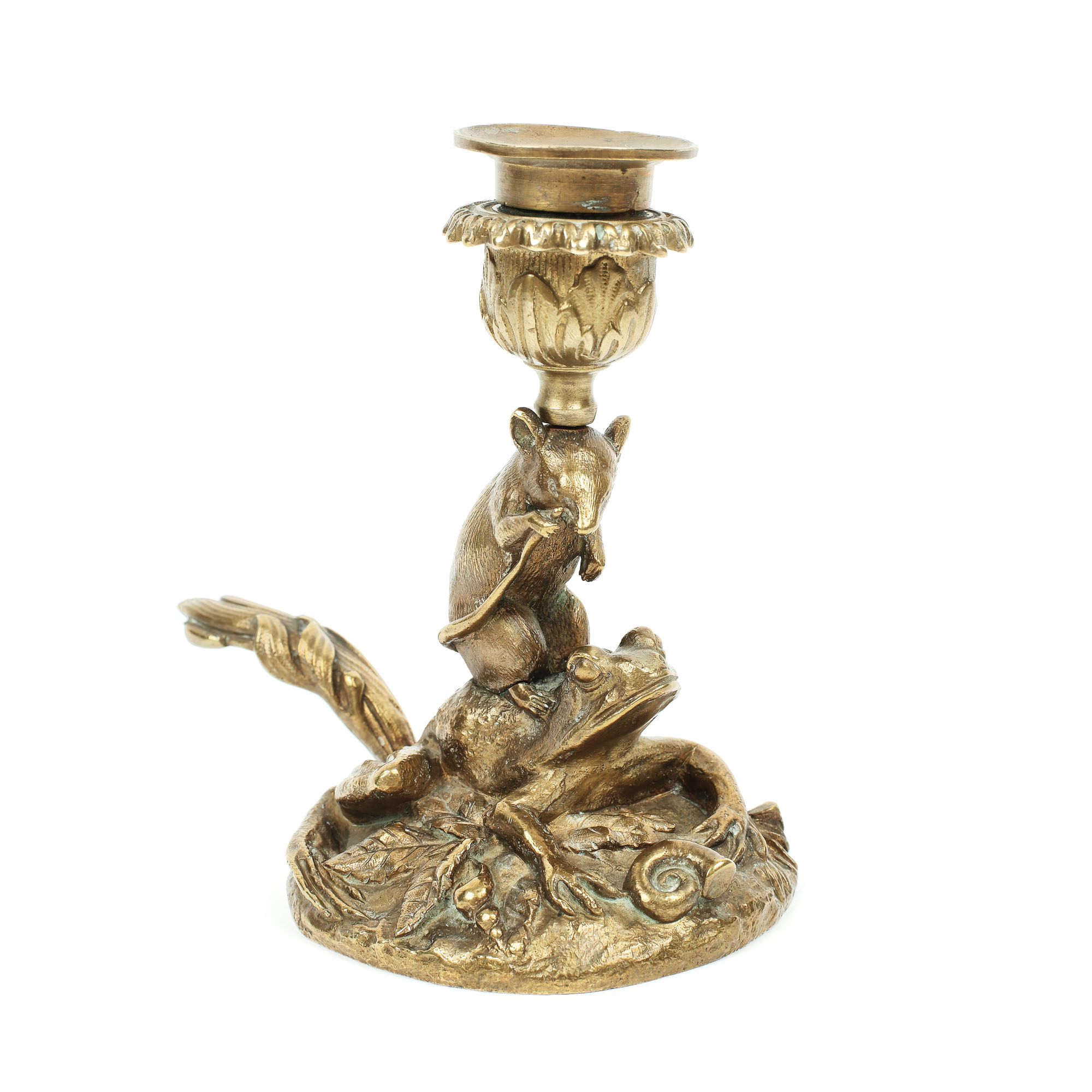 120. Simpatic sfeșnic de mână Art Nouveau, din bronz, decorat cu un șoricel călare pe o broscuță
