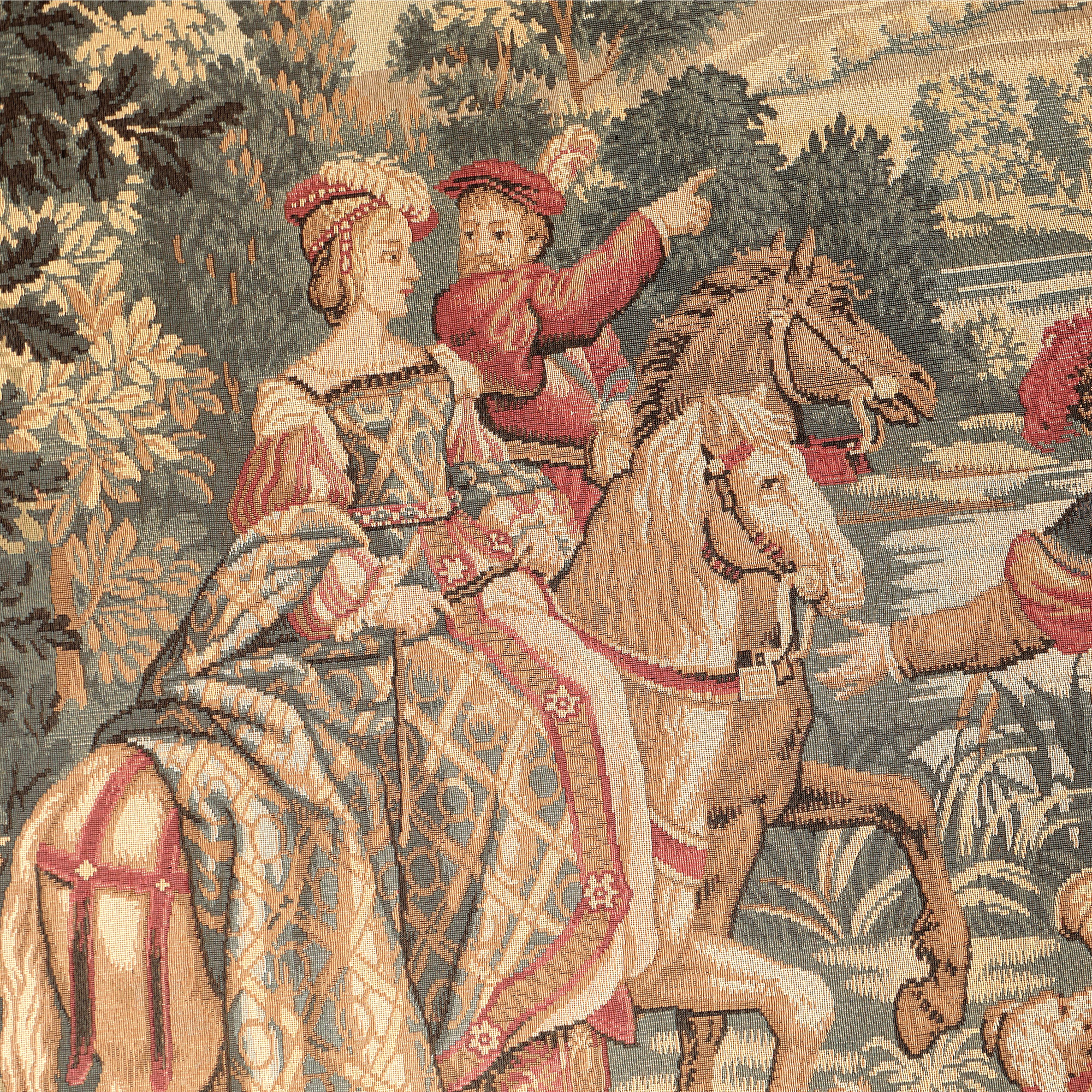 26. Tapiserie JP Paris Panneaux Gobelins, cu scenă de vânătoare, provine din colecția Lucrezia și Ion Pacea [Cca. 1960]