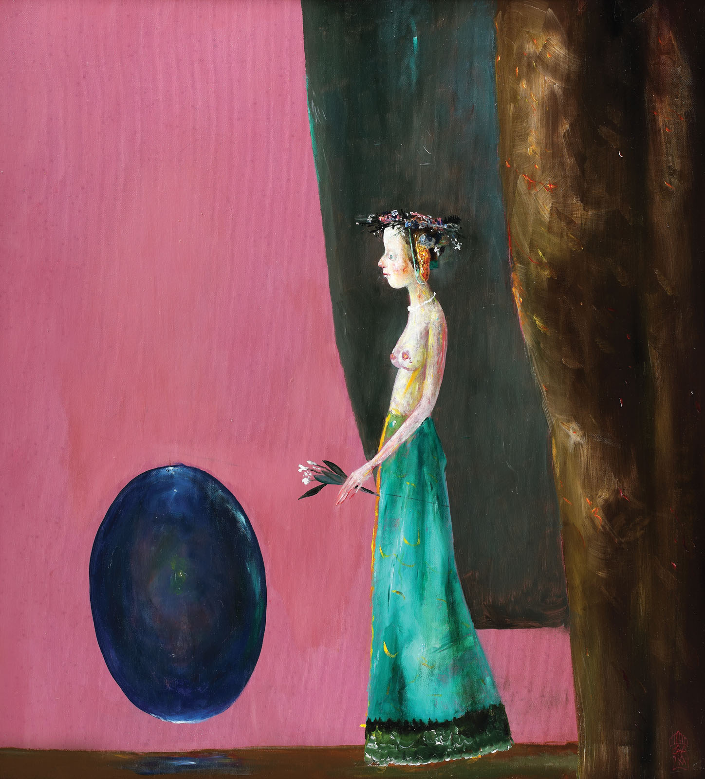 semnat și datat dreapta jos, cu violet, în monogramă, "Câlția, 2001"; intitulat și datat pe verso, cu negru, "Oul albastru, 2001"