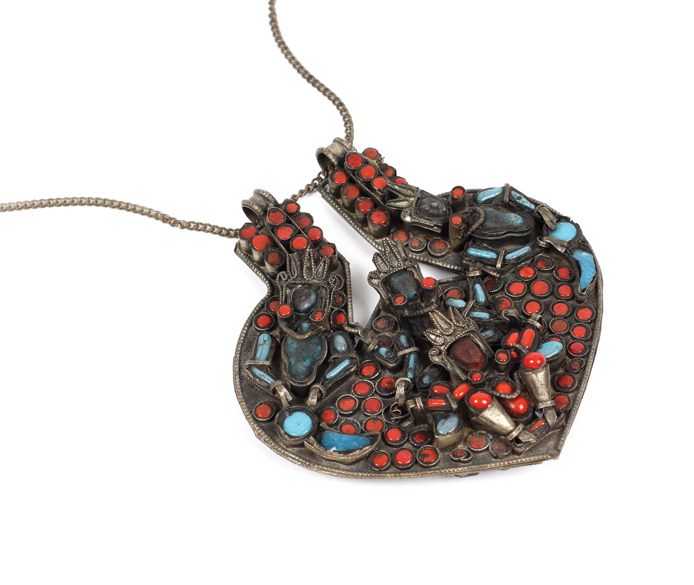 112. Impresionant colier budist, decorat cu zeități și maimuță, din pietre semiprețioase, Tibet, sec. XVI-XVII