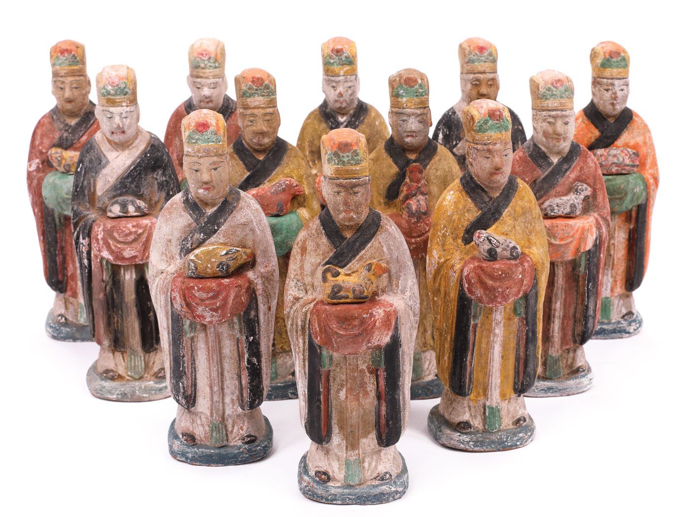 128. Lot format din 12 statuete din teracotă, ilustrând simbolurile tradiționale ale zodiacului chinezesc, prezentate de către cărturari în port specific, dinastia Ming, China. sec. XV